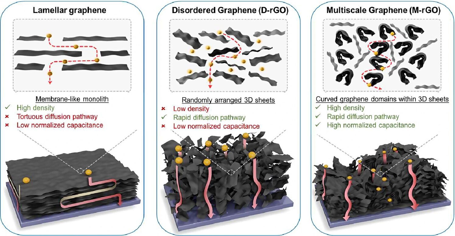 Zespół opracował materiał nazwany wieloskalowym tlenkiem grafenu zredukowanym (M-rGO). Zamiast płaskich arkuszy grafenu, które nawarstwiają się i blokują jonom dostęp, badacze zastosowali szybkie wyżarzanie termiczne, tworząc gęsto upakowane, mocno zakrzywione krystality grafenowe przeplatane obszarami nieuporządkowanymi. Ta krzywizna i nieład nie są wadą, bo są to celowe autostrady dla jonów, które skracają drogę dyfuzji i otwierają warstwy zwykle niedostępne. Co najważniejsze, naukowcy przetestowali to podejście w warunkach zbliżonych do rzeczywistych na podstawie własnych symetrycznych ogniw typu pouch.