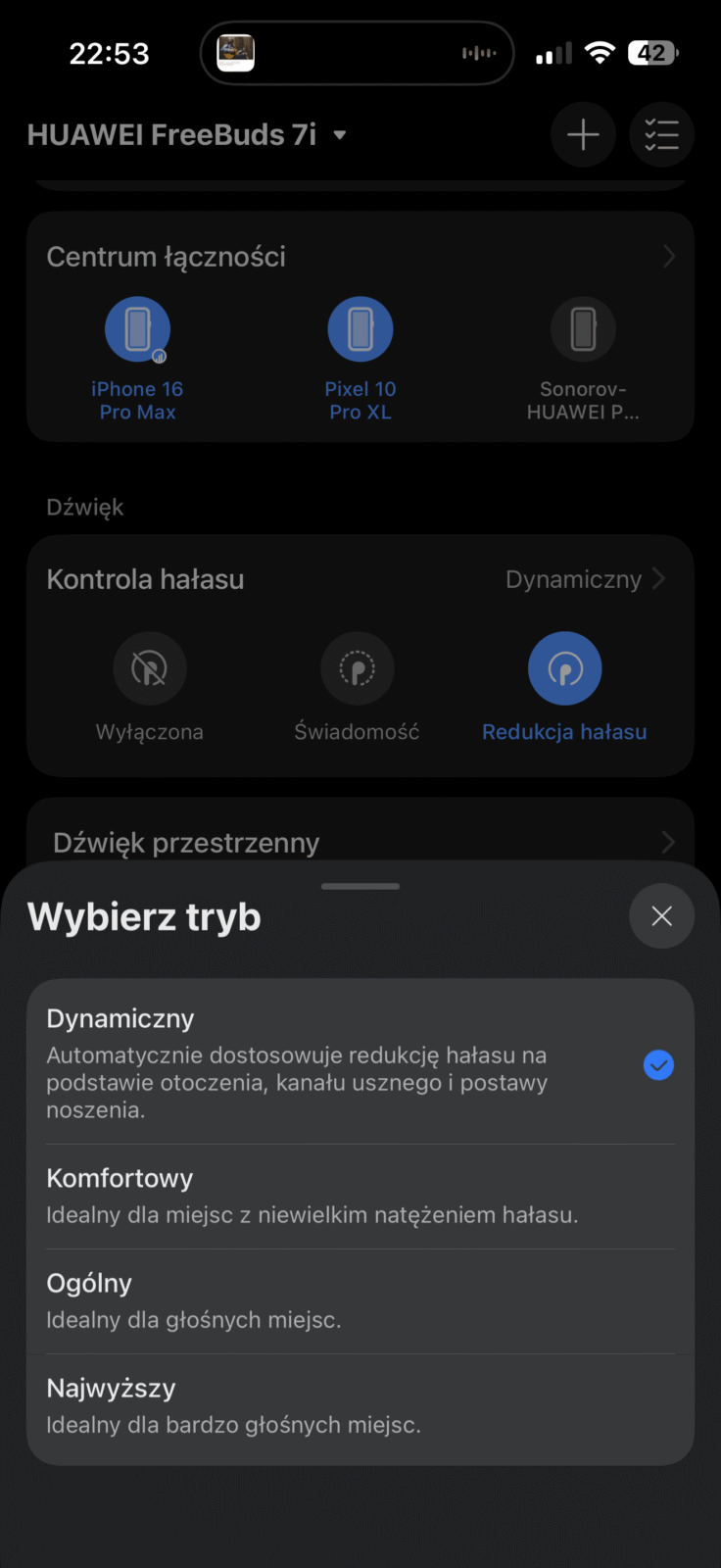 Niejako na boku tematu muzyki – zdecydowanej poprawie uległa jakość rozmów, choć nie tyle dla mnie, ile dla moich rozmówców – mikrofon przewodnictwa kostnego robi najwyraźniej robotę, gdyż w ogóle nie zorientowali się, że korzystałem ze słuchawek, podczas gdy w 6i taka różnica była zauważalna. Znacznie lepiej radzi sobie też ANC – już wcześniej był ponadprzeciętny, ale to, co oferuje teraz Dynamic ANC 4 kiedyś było nie do pomyślenia – słuchawki pozwalają na przyjemne słuchanie muzyki symfonicznej i jednoczesne odkurzanie. Bez problemu wytłumiają także drące japę o miskę koty, żonę grającą na pianinie w pokoju obok i komisję śledczą w TV. Nie wiem, czy w tej cenie są słuchawki z lepszym tłumieniem hałasu – szczerze mówiąc, wątpię. Ostatni temat to dźwięk przestrzenny – dostępny w wersji statycznej i dynamicznej, z wykrywaniem ruchu głowy. Jest i… tyle. Nie wiem, do czego mógłbym go sensownie wykorzystać, bo do przestrzennego audio w filmach i muzyce jest zupełnie zbędny.