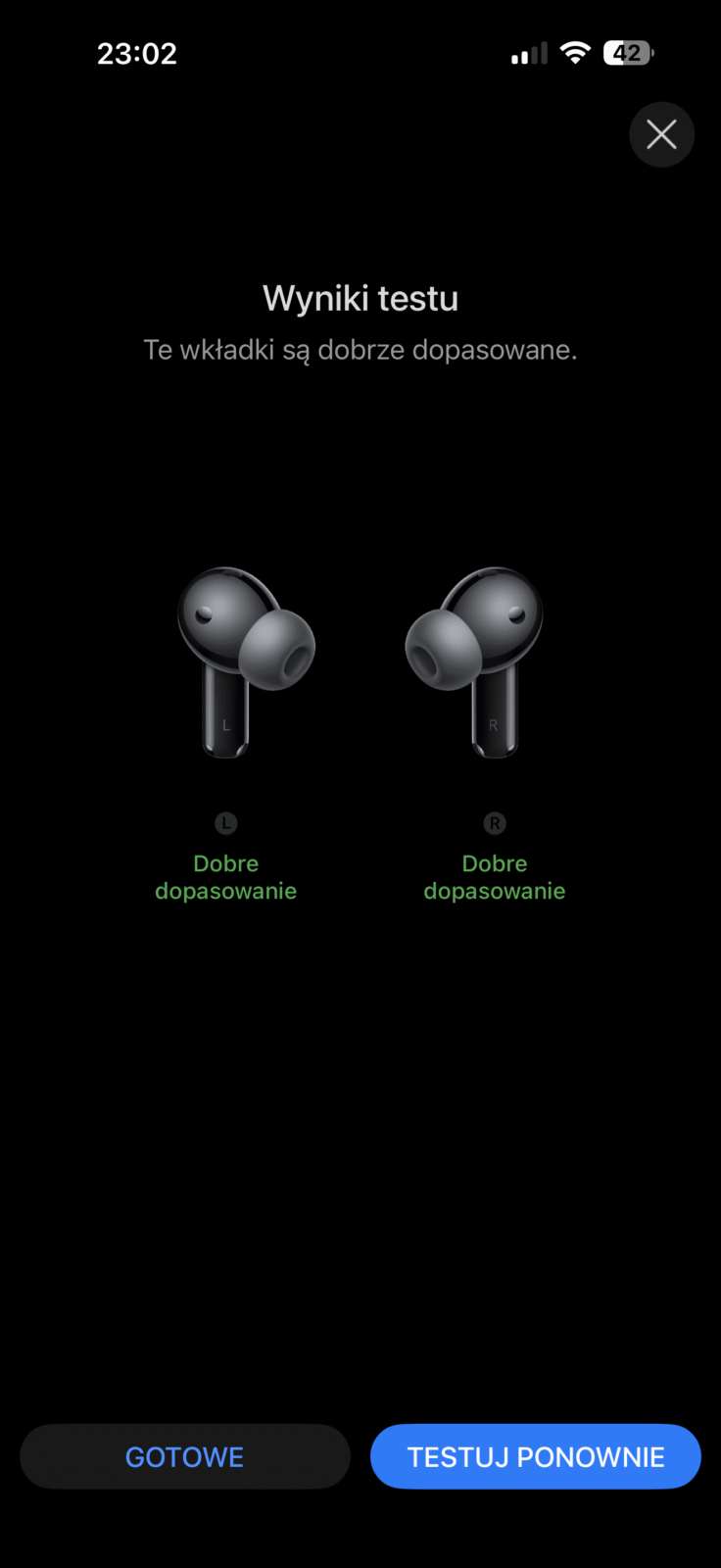 Ponieważ mechanicznie FreeBuds 7i i FreeBuds 6i są identyczne, bez zdziwienia przyjąłem, że nie sprawiały mi większych problemów z dostosowaniem ich do uszu – gdyby były wątpliwości, w oprogramowaniu znalazła się możliwość przeprowadzenia testu dopasowania.