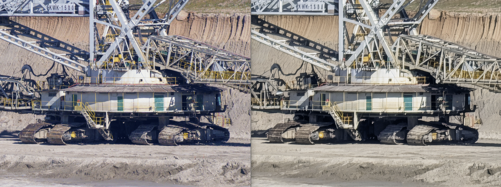 Widać to na powyższym porównaniu – po lewej jest zdjęcie wykonane aparatem A6700 z teleobiektywem i przycięte tak, by maszyna miała ten sam rozmiar, co na zdjęciu prawym, wykonanym Pixelem – dokładnego poziomu zbliżenia niestety nie pamiętam, a smartfon takich danych nie zapisuje. Detale takie jak napis z modelem koparki, barierki schodni i napęd mechanizmu gąsienicowego wskazują na to, jak dalece Gemini musiało się domyślać zawartości.