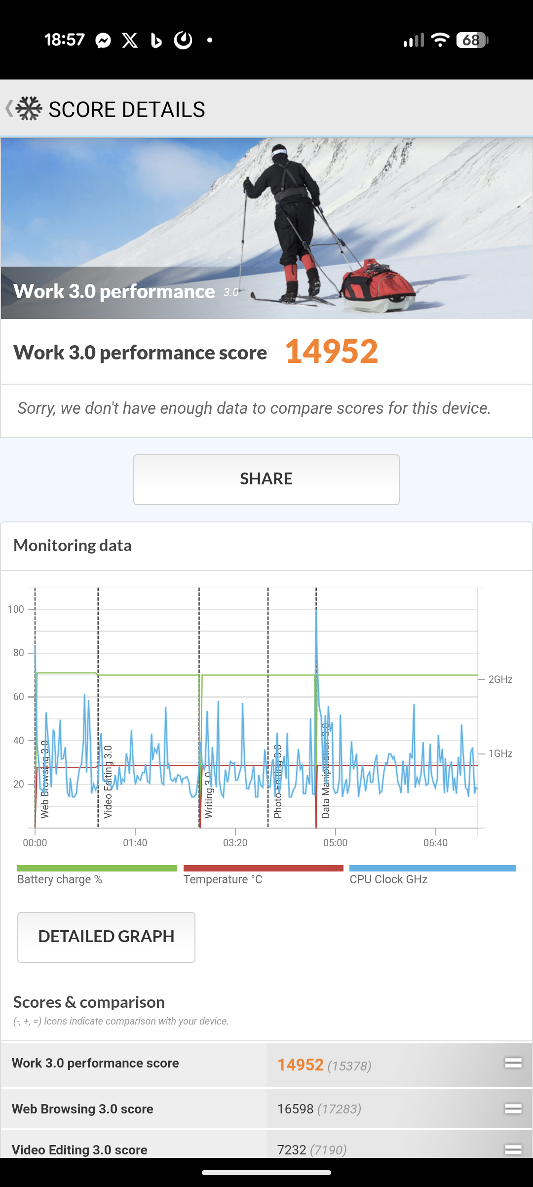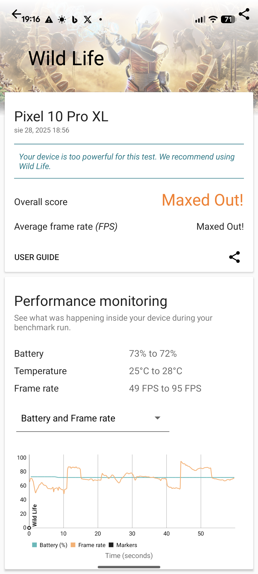 Wracając do 3DMarka, PowerVR DXT-48-1536 nie obsługuje ray tracingu i daje wydajność raczej ze średniej półki, ale zarazem całkiem przyzwoitą. Wykazuje przy okazji niezłą stabilność i umiarkowane nagrzewanie się – throttling termiczny następuje stopniowo, bez raptownych skoków. Czuć podczas testu cieplejszą obudowę, ale postęp w stosunku do 9 Pro XL jest.