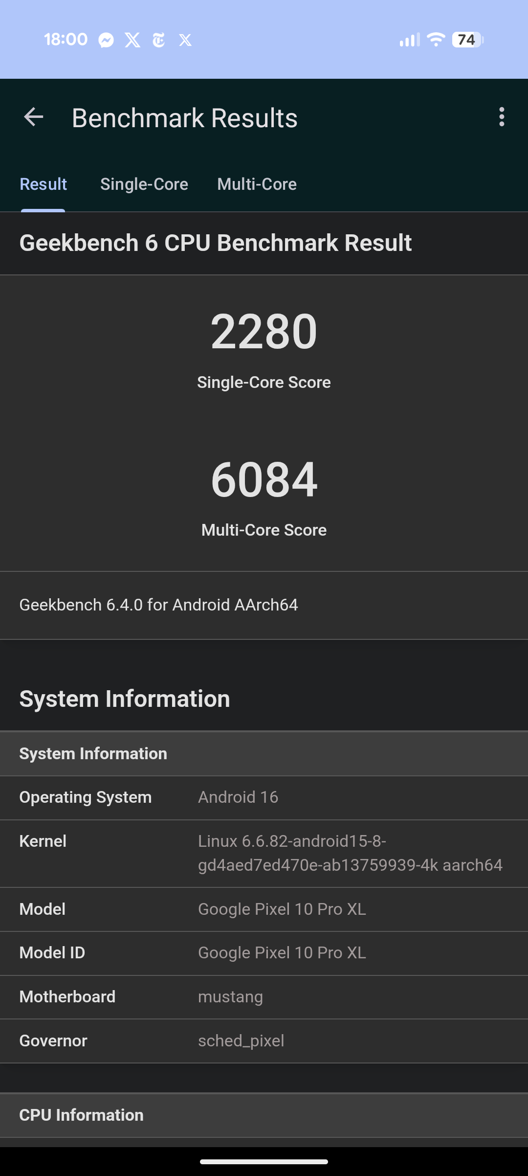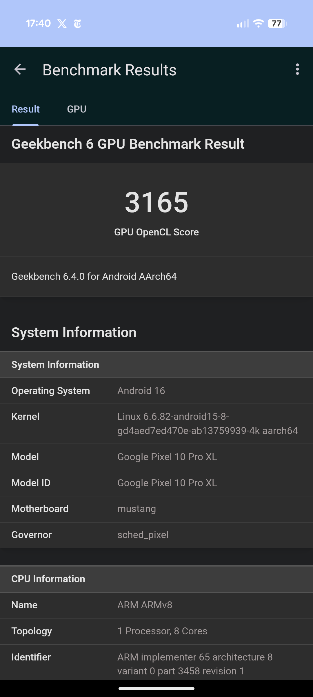 Jednocześnie wyniki testów Geekbench 6 zdradzają poważne problemy z kompatybilnością samego benchmarku albo z niedopracowanymi sterownikami Pixela, wyniki GPU są bowiem znacznie niższe, niż dla Tensora G4 i to zarówno dla testu OpenCL jak i Vulcan. Podobna sytuacja ma miejsce z testem Geekbench AI – wyniki Pixela 10 Pro XL w teście NNAPI są niższe od poprzednika, a test AI GPU kończy się spektakularnym crashem do pulpitu.