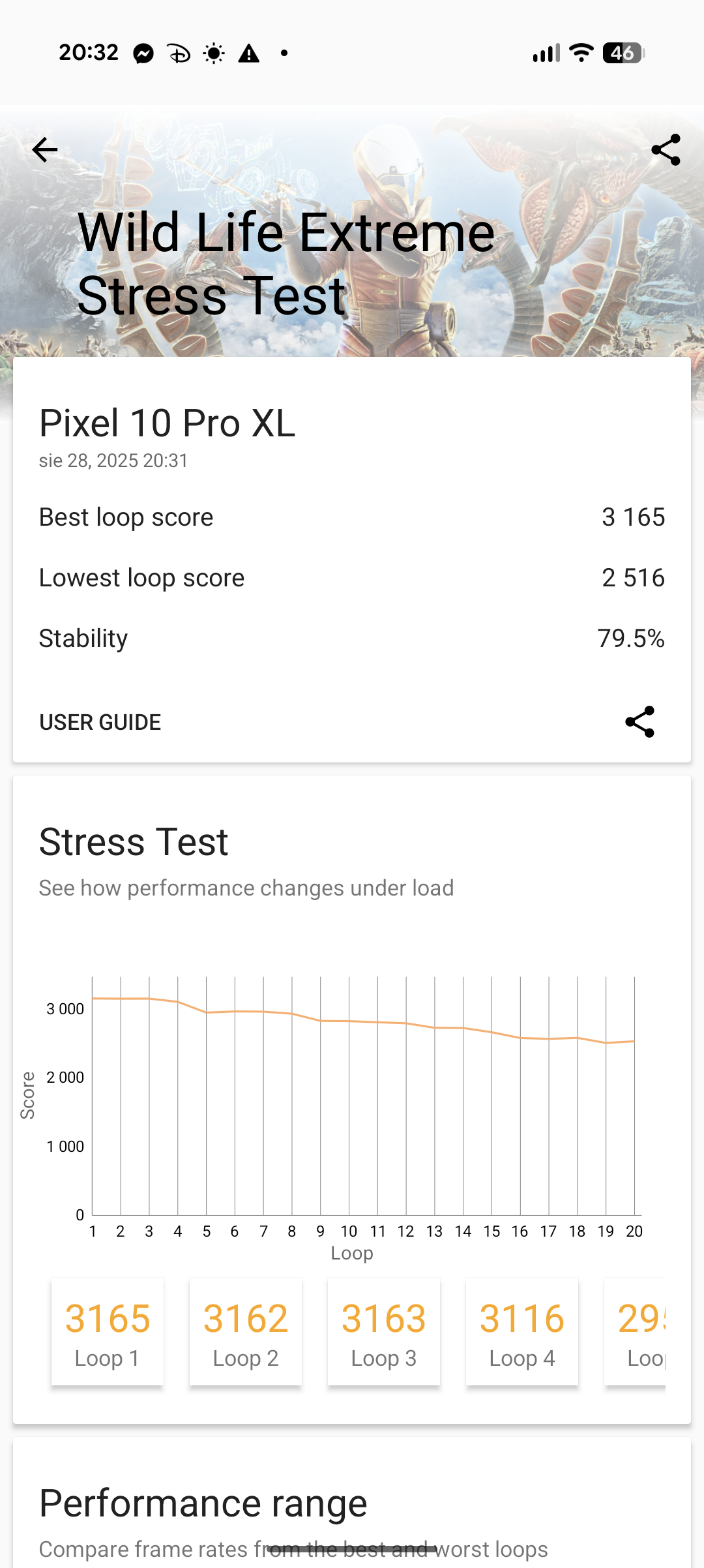 - Wild Life Extreme Stress Test: 3165/2516 pkt, stabilność 79,8%