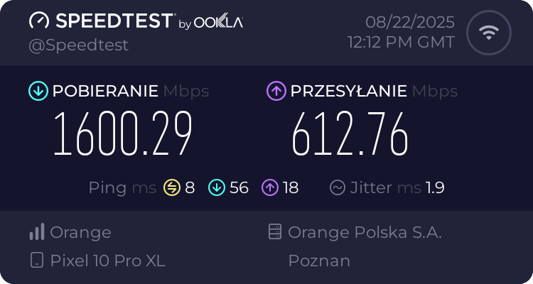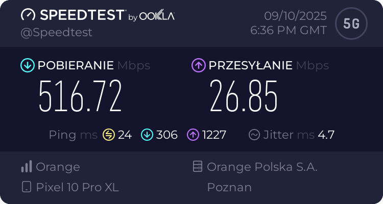 Aktywacja w sieci trwała około 30 sekund, po czym Pixel 10 Pro XL automatycznie zalogował się do sieci 5G, włączając VoLTE i VoWiFi bez konieczności ręcznego zachęcania. W zasięgu pasma C (3,6 GHz) transfery sięgały 500 Mbps Moje domowe Wi-Fi to tylko standard 6E, Pixel zestawiał połączenie w paśmie 6 GHz z prędkością teoretyczną 2402 Mbps, co w praktyce pozwalało na transfery rzędu 1,5 Gbps.