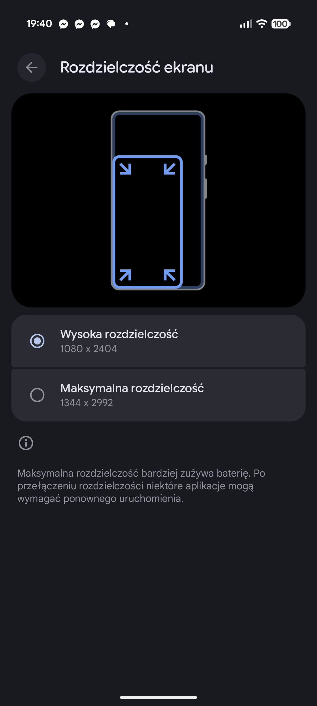 Pixel 10 Pro XL wyposażony został w ten sam panel LTPO OLED o rozdzielczości 1344 × 2992 piksele, który był stosowany w poprzedniku. Domyślnie pracuje w obniżonej do 1008 × 2244 pikseli rozdzielczości – różnicy nie widać, a ma być trochę oszczędniejszy. Po włączeniu płynnego wyświetlania odświeżanie regulowane jest automatycznie w zakresie 1-120 Hz – przy wyłączonym górny pułap wynosi 60 Hz. Zwiększeniu uległa maksymalna jasność panelu, która wynosi teraz 2200 nit w trybie HBM oraz miejscowo 3300 nit w HDR, różnica jest jednak zbyt mała, by dało się ją zauważyć bez przeprowadzenia pomiarów. W tym roku nie mam też większych zastrzeżeń do działania automatycznej regulacji jasności – to wciąż nie jest poziom iPhone’a, ale jest lepiej, niż było.
