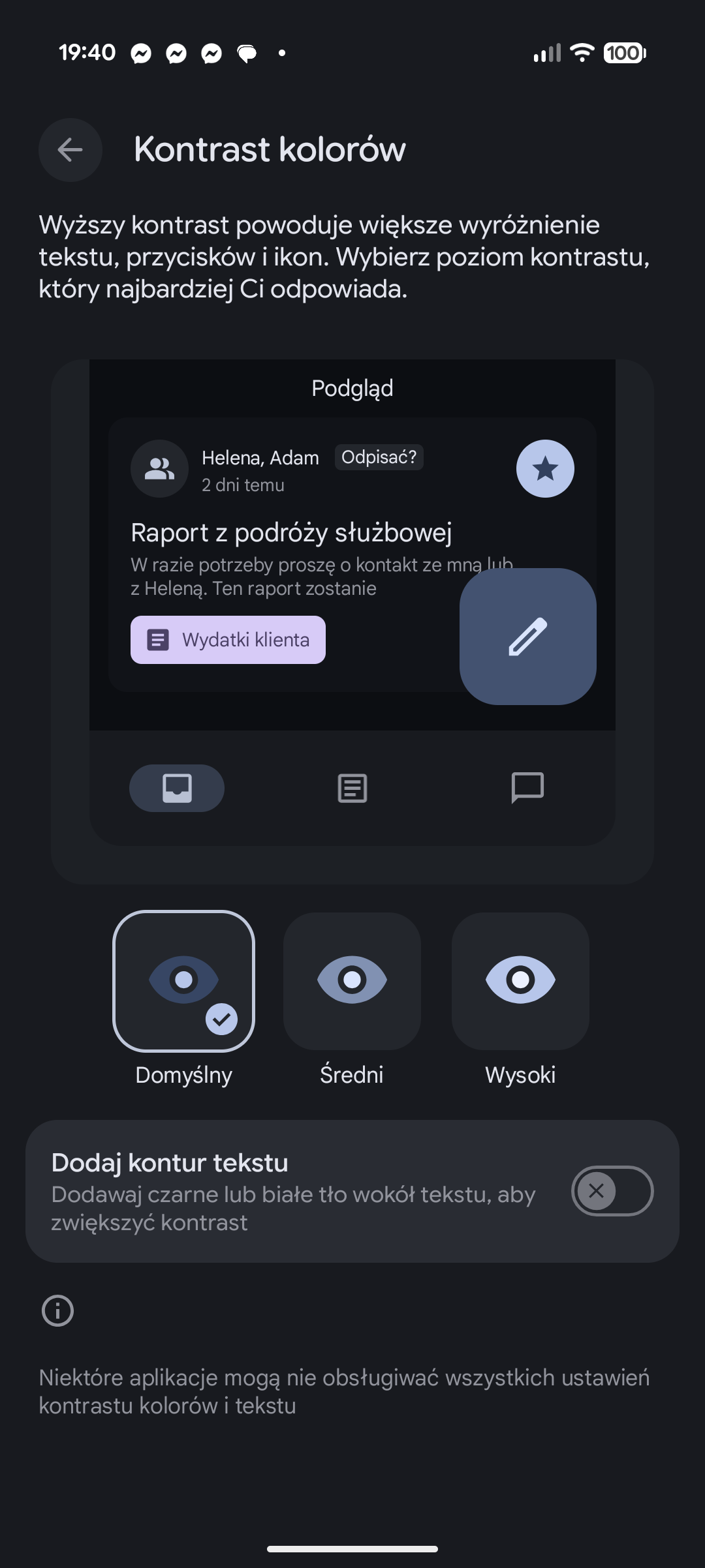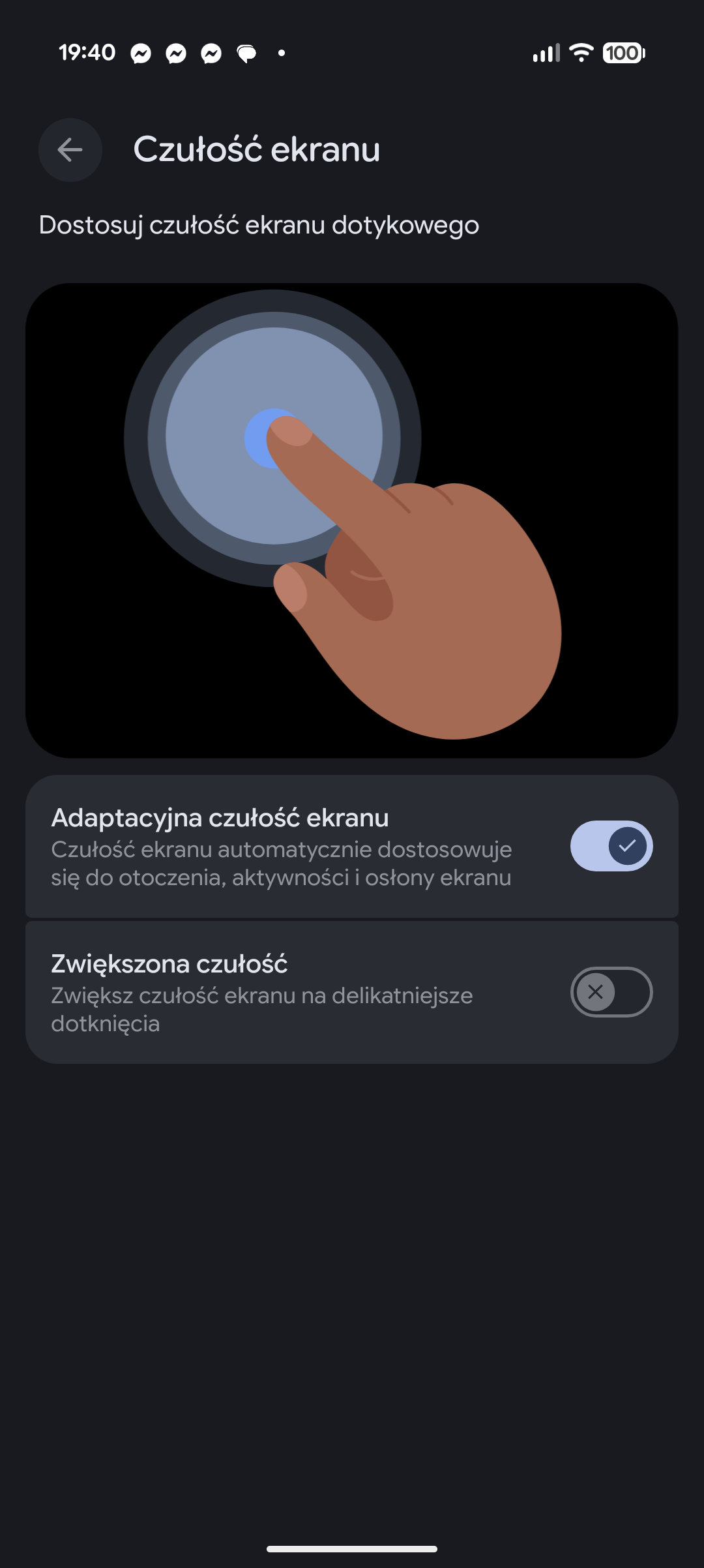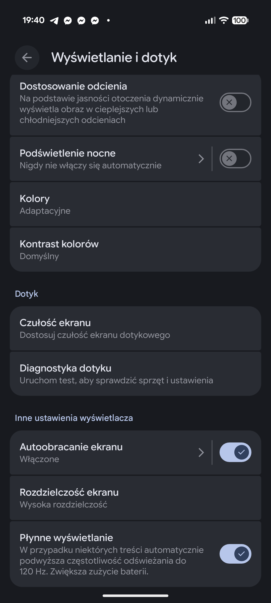 Zakres sterowania pracą wyświetlacza jest nieco ograniczony – mamy wybór odświeżania, rozdzielczości, profilu kolorów, motyw jasny lub ciemny, redukcję składowej niebieskiej i tryb nocny zwykły oraz monochromatyczny, a także możliwość zmiany kontrastu kolorów. Ciekawostką jest możliwość adaptacyjnego dostosowania czułości ekranu (oprogramowanie dobiega je automatycznie w zależności od warunków) oraz dodatkowy tryb poprawiający współpracę z niektórymi szkłami ochronnymi.