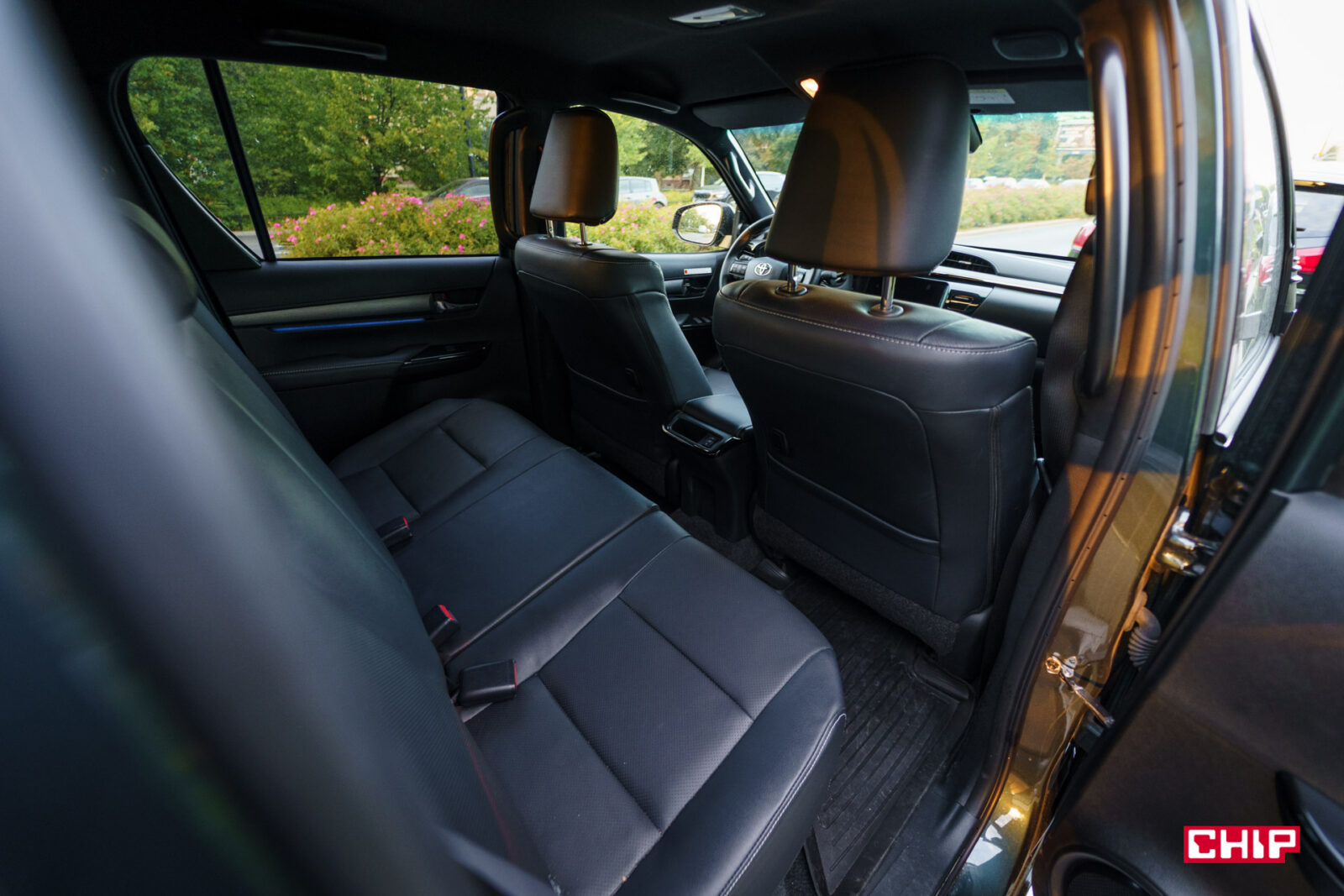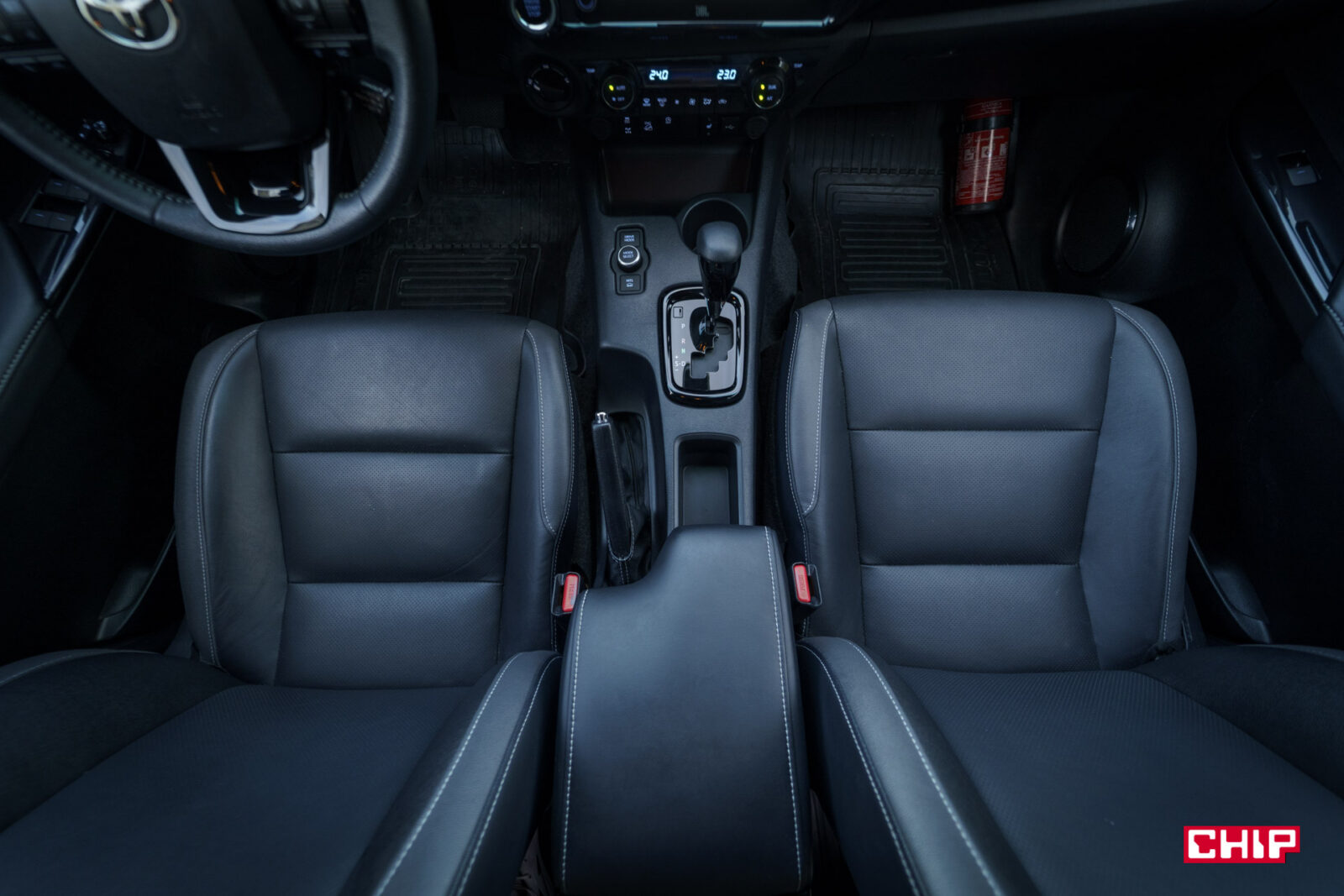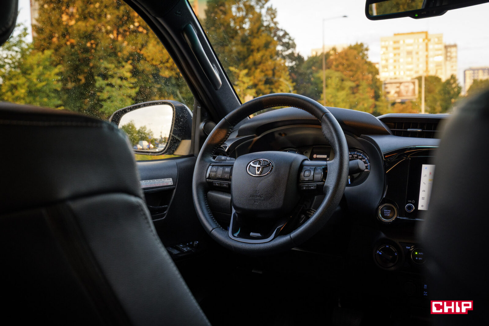 Wnętrze Toyoty Hilux można śmiało porównać z terenowymi autami Forda, jak Bronco czy Ranger. Z jednej strony płacimy za nie tyle, że wypadałoby mieć tu coś więcej niż skrzypiące plastiki. Z drugiej głównym przeznaczeniem auta jest zabieranie go w brudne otoczenie, więc jednocześnie musi to być wnętrze praktyczne. No i tutaj Toyota Hilux, posobnie jak wspomniane Fordy, dobrze spełnia tę rolę.