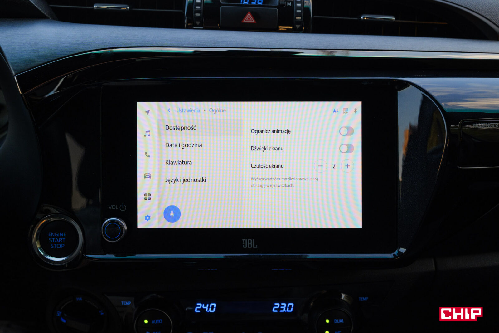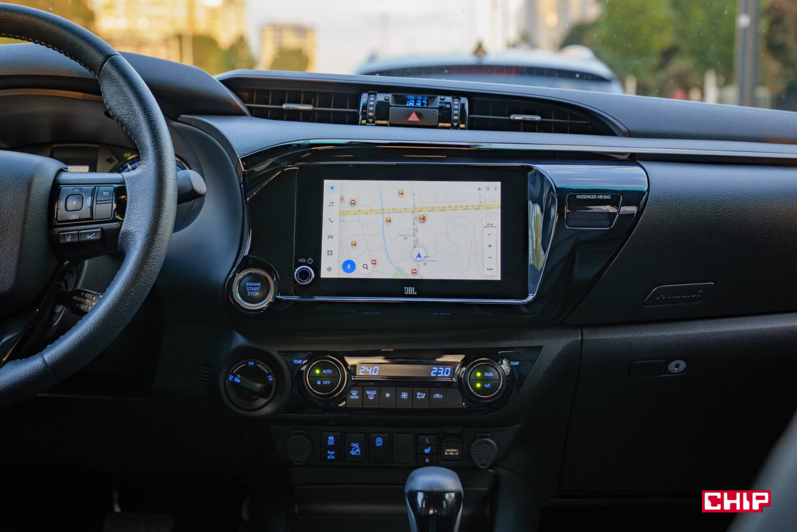 Toyota Hilux występuje z dwoma wariantami ekranów. W najtańszych wariantach wyposażenia jest to 9-calowy ekran z prostszym systemem Toyota Touch 3, a w droższych jest to 8 cali z Toyota Smart Connect. Jest to ten sam interfejs, który znajdziemy w każdej nowszej Toyocie, od Yarisa, przez Corolle i RAV4, po Land Cruisera.