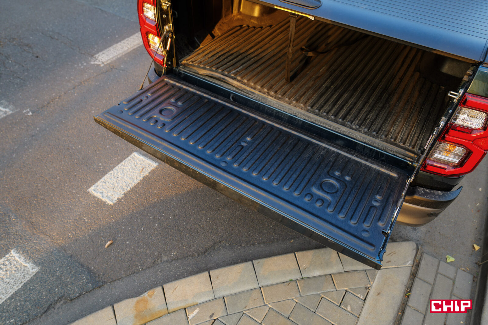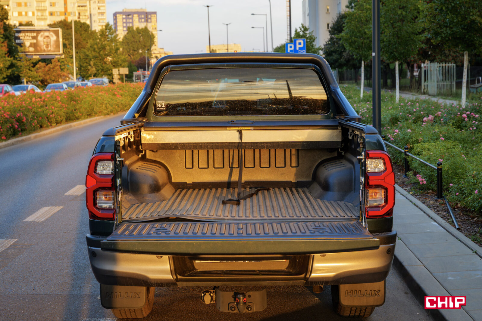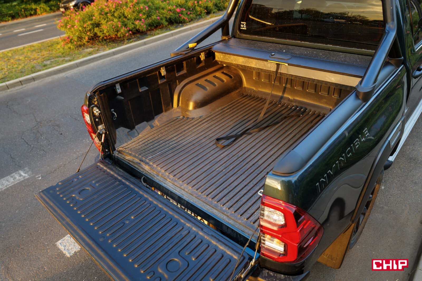 W typowo miejskim użytkowaniu tylna kanapa to jednocześnie jedyny bagażnik, bo trudno jest przewozić zakupy czy bagaże na pace, bez uzbrojenia jej w odpowiednią skrzynię czy mocowania. Paka ma 155 cm długości, 154 cm szerokości i 48 cm wysokości. Roleta oraz orurowanie to część dodatkowego, opcjonalnego pakietu i w testowanym egzemplarzu był to roleta manualna. W pakiecie Sport jest ona elektryczna. Co ciekawe, roleta okrutnie skrzypi. Wydaje okropne dźwięki na nierównościach i stojąc obok można pomyśleć, że za skrzypienie odpowiada zawieszenie Hiluxa.