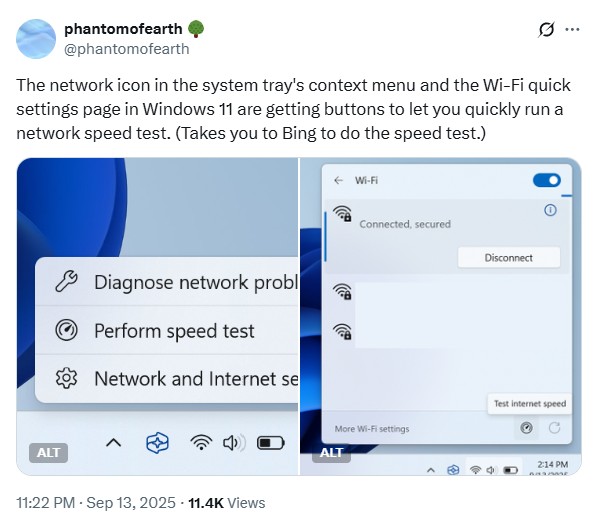 Nowość została wykryta przez użytkownika _phantomofearth i na razie dostępna jest tylko w wersjach testowych Windows 11. Microsoft umieścił ją w dwóch miejscach systemowego interfejsu – w menu kontekstowym ikony sieci oraz panelu szybkich ustawień Wi-Fi. Co ciekawe, funkcja nie otwiera żadnego specjalnego narzędzia, tylko uruchamia wbudowany test prędkości Bing w domyślnej przeglądarce. To dobre rozwiązanie, bo wykorzystuje istniejące technologie, zamiast tworzyć wszystko od zera.