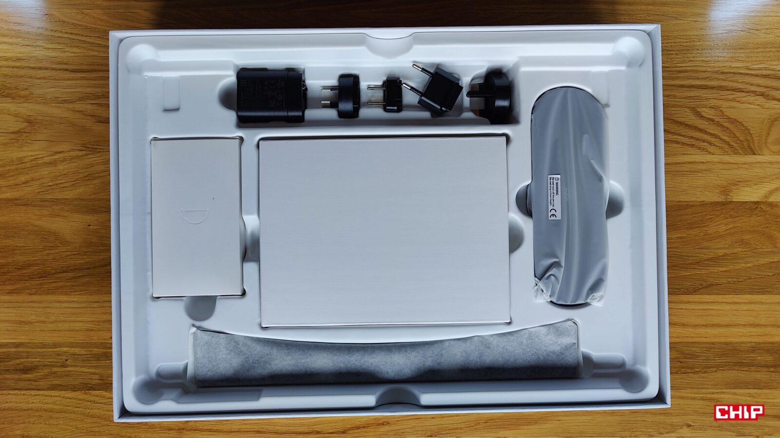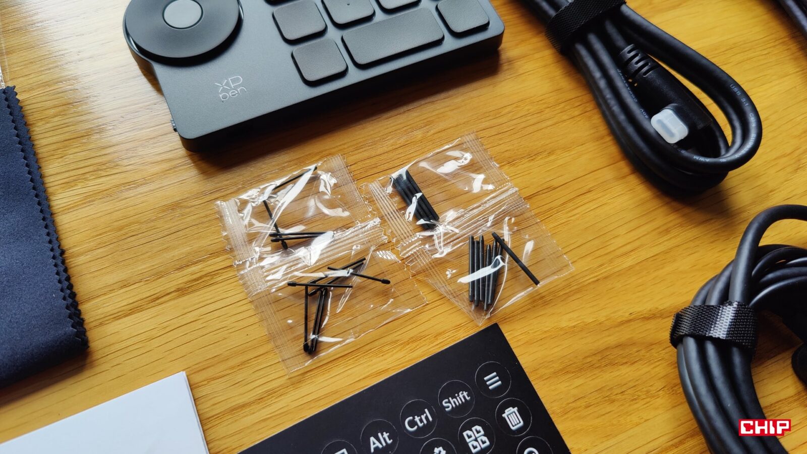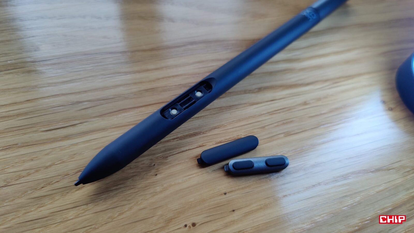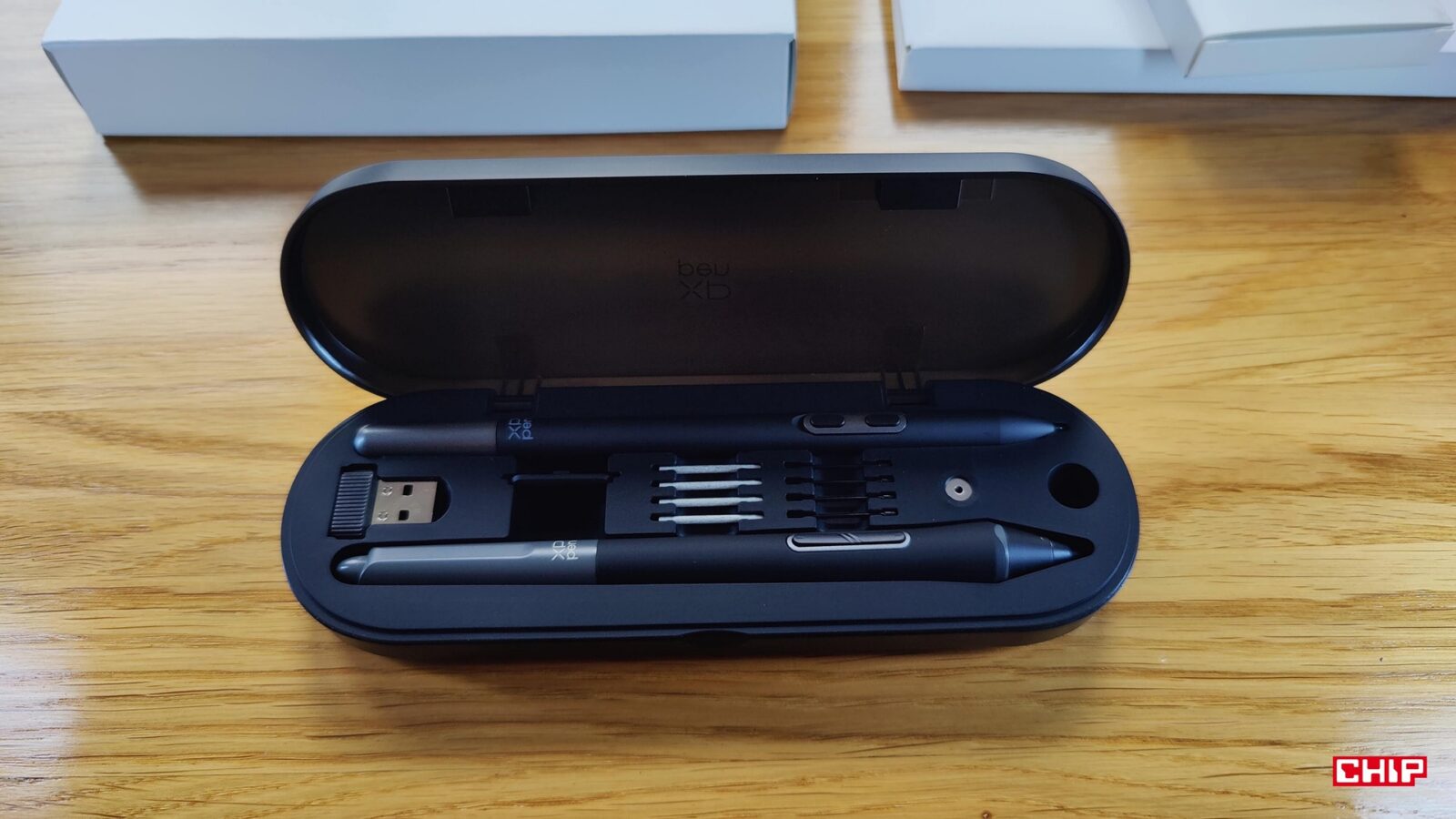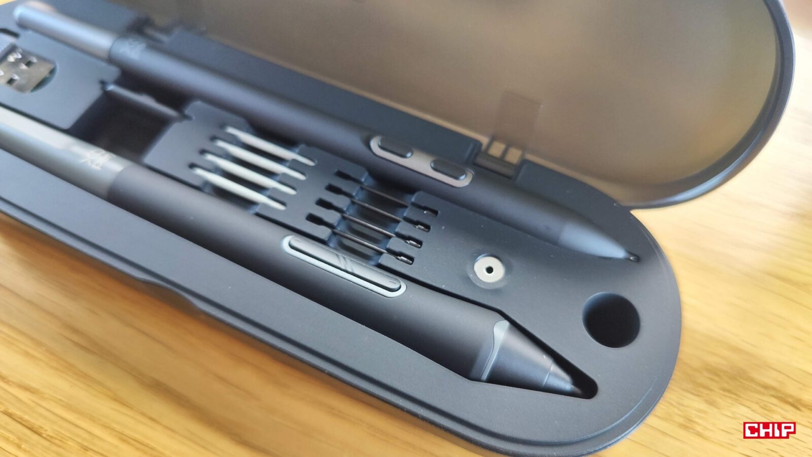 Poza tym w etui znalazło się miejsce na odbiornik USB-A dla wspomnianego kontrolera, łącznie 8 wymiennych końcówek (w tym dwa “ołówkowe” z filcu), narzędzie do ich ściągania oraz luka, która pozwala nam utrzymać rysik w pionie podczas przerw w pracy.