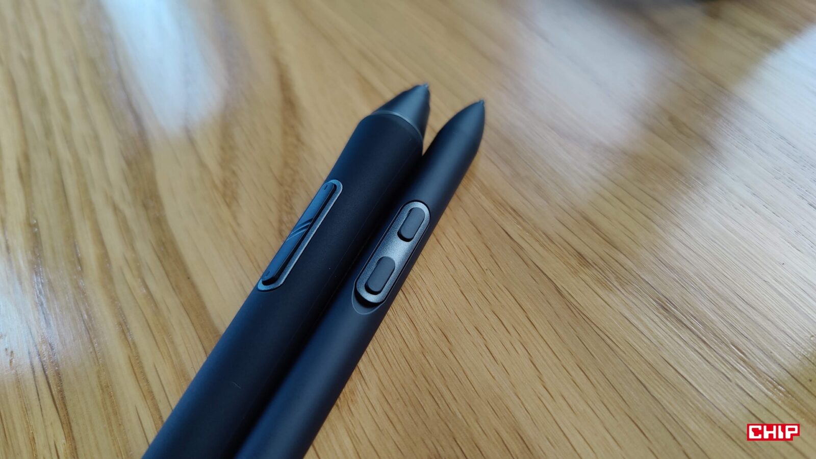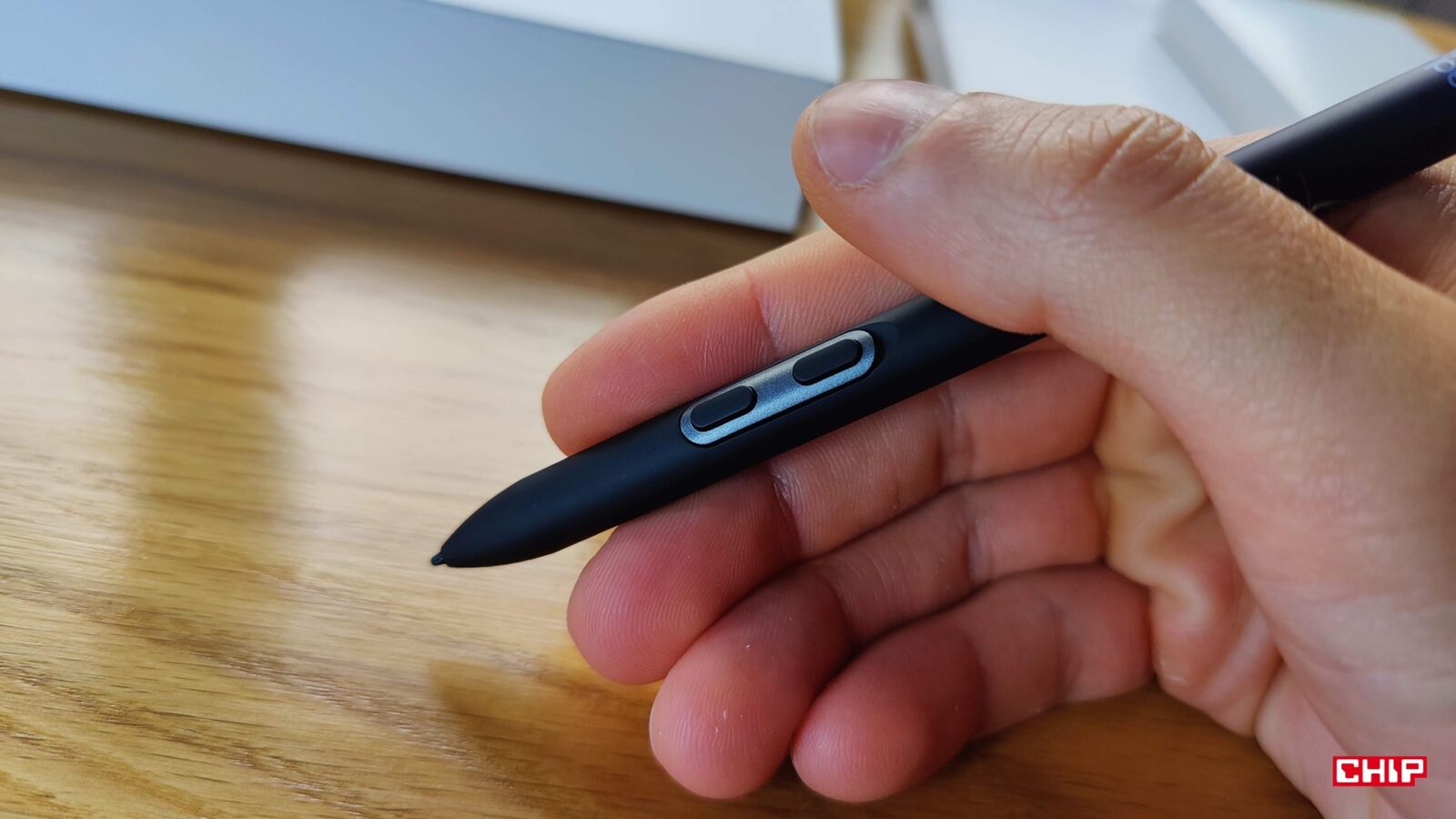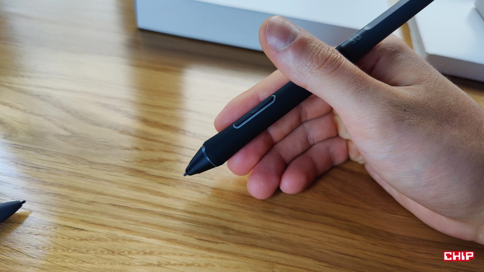 Z kolei we wspomnianym etui kryje się sporo dobra, bo przede wszystkim dwa rysiki. Mowa o większym X3 Pro Smart Chip z “gumką” z tyłu i przyciskami oraz X3 Pro Slim, który to jest lżejszy i cieńszy, a na dodatek ma opcję wymiany trzymających się na magnesie przycisków na kawałek plastiku. Oba rysiki współdzielą te same fundamenty. Odznaczają się 16384 poziomami nacisku, wspierają rysowanie pod kątem 60 stopni, umożliwiają odczyt z wysokości około 10 mm, działanie do 60 stopni nachylenia, rozdzielczość 5080 LPI i dokładność na poziomie +/- 0,4 mm w centrum. Przy gęstości 4K na 15,6 cala ta dokładność przekłada się orientacyjnie na 4-5 pikseli.
