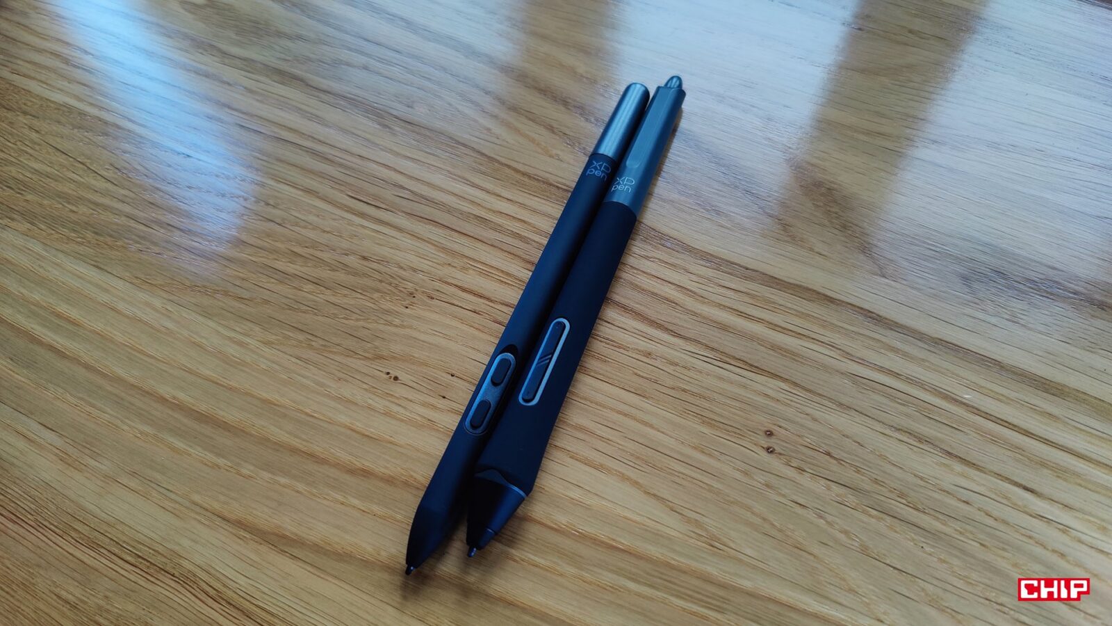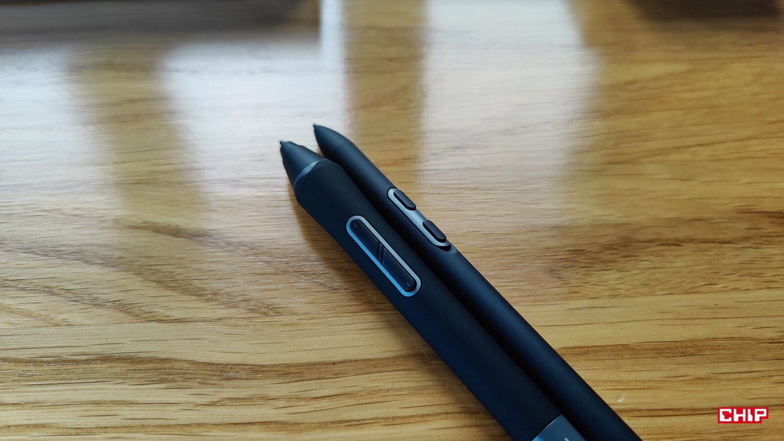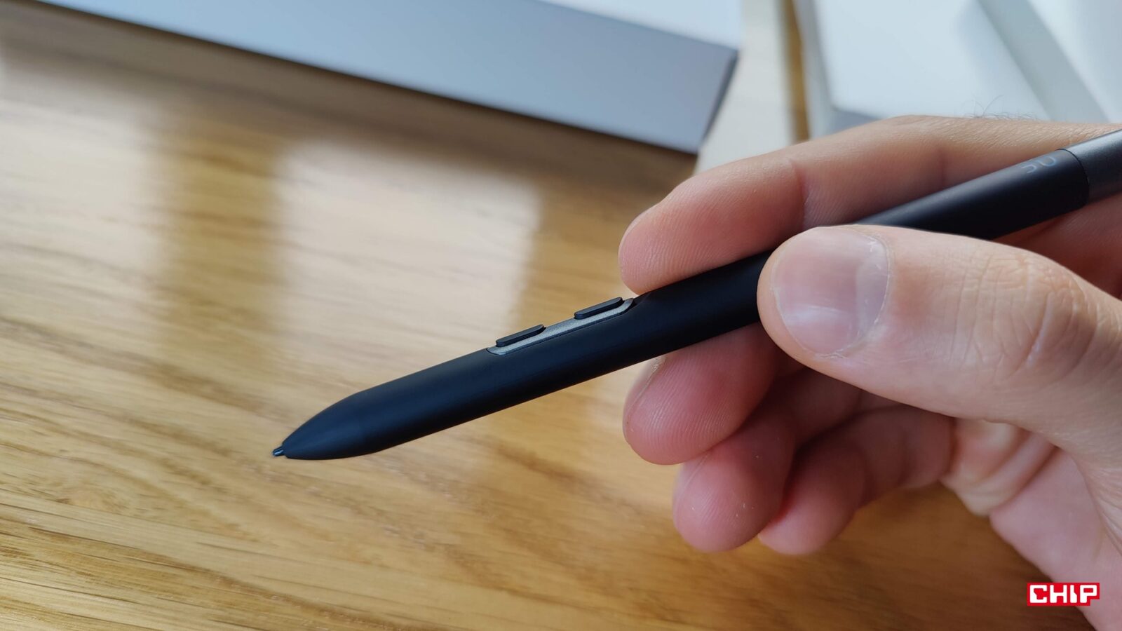 Z kolei we wspomnianym etui kryje się sporo dobra, bo przede wszystkim dwa rysiki. Mowa o większym X3 Pro Smart Chip z “gumką” z tyłu i przyciskami oraz X3 Pro Slim, który to jest lżejszy i cieńszy, a na dodatek ma opcję wymiany trzymających się na magnesie przycisków na kawałek plastiku. Oba rysiki współdzielą te same fundamenty. Odznaczają się 16384 poziomami nacisku, wspierają rysowanie pod kątem 60 stopni, umożliwiają odczyt z wysokości około 10 mm, działanie do 60 stopni nachylenia, rozdzielczość 5080 LPI i dokładność na poziomie +/- 0,4 mm w centrum. Przy gęstości 4K na 15,6 cala ta dokładność przekłada się orientacyjnie na 4-5 pikseli.