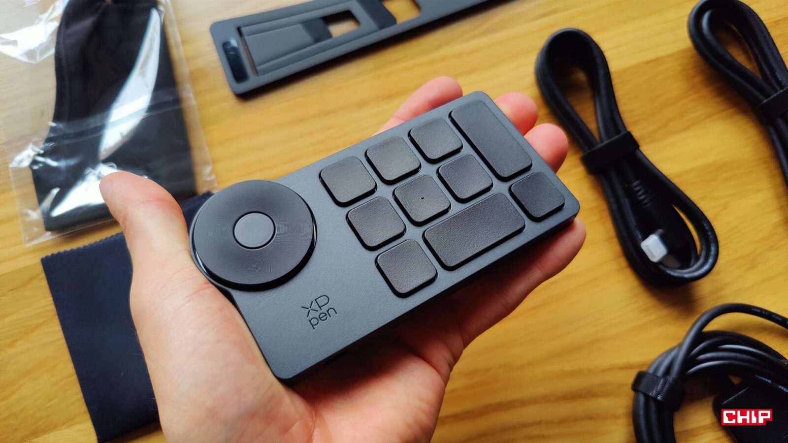 Pudełko jest wypchane po brzegi i to w dobrym tego słowa znaczeniu. Oprócz głównego bohatera, a więc samego tabletu graficznego, dostajemy przypominające wielkością mały piórnik szkatułkowe etui oraz keypada/kontroler ACK05 z programowalnymi 10 niskoprofilowymi klawiszami na membranowej klawiaturze i pokrętłem. Ten drugi dodatek należy traktować jako uzupełnienie typowej klawiatury i tym samym rozwiązanie problemu całkowitego braku przycisków na samym tablecie. Możemy połączyć go z komputerem przez odbiornik USB-A, połączenie Bluetooth lub tradycyjnie – przewodowo. Kiedy już zaprogramujemy wszystkie klawisze, możemy nawet nakleić na nie dołączone naklejki, aby zawsze wiedzieć “w co klikamy”.