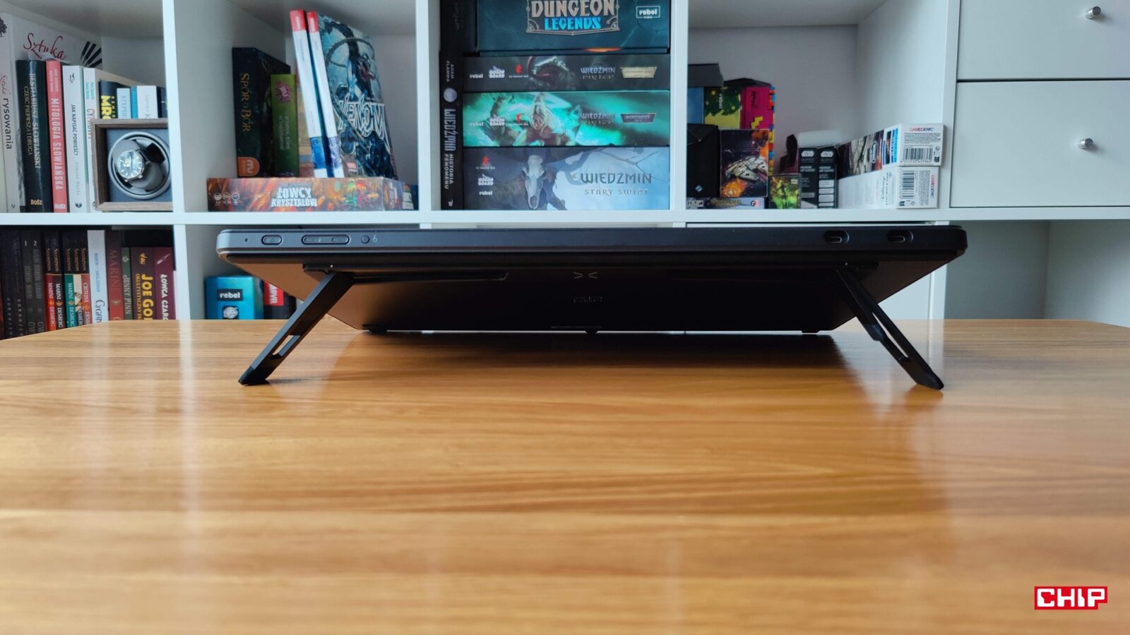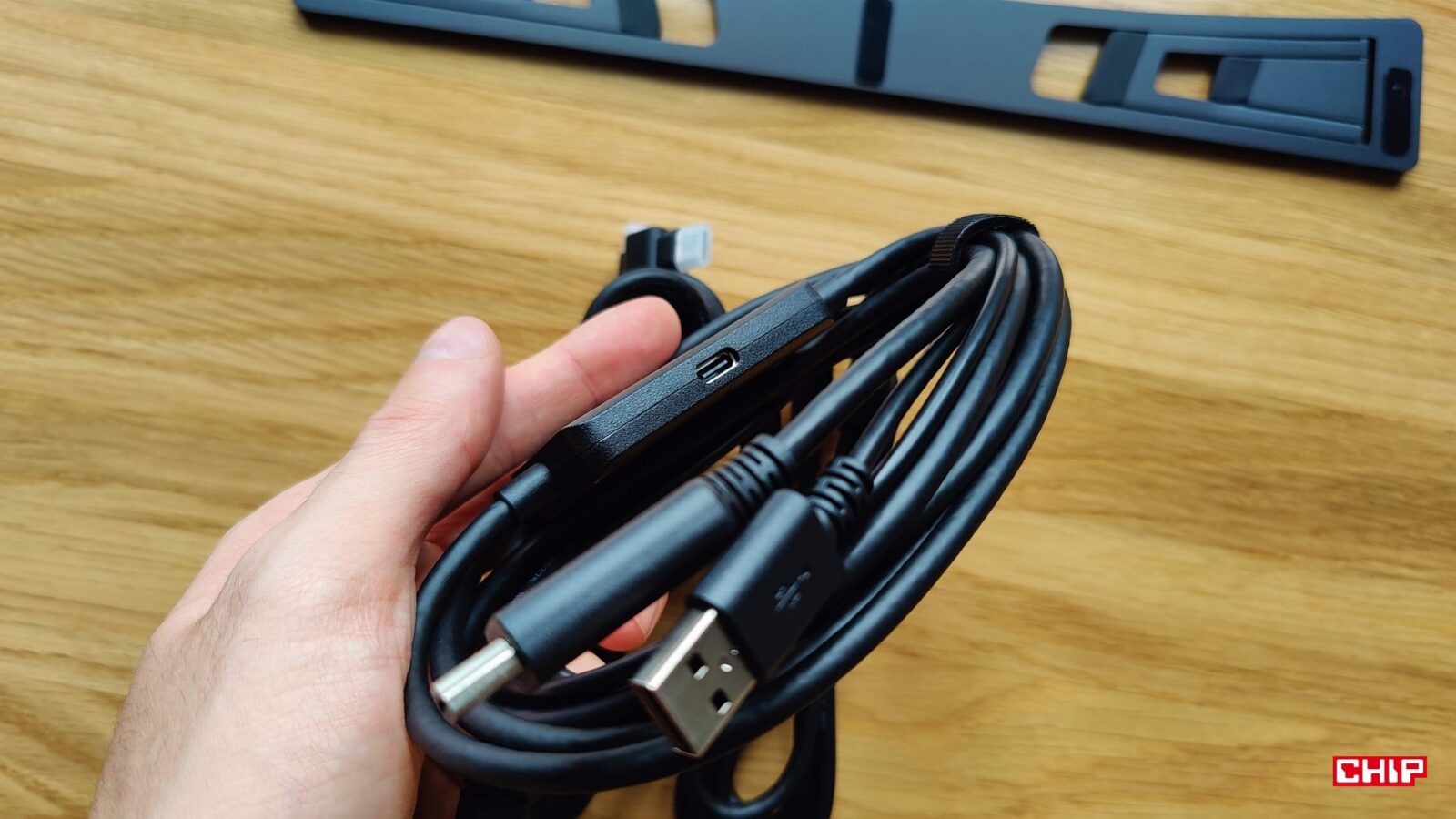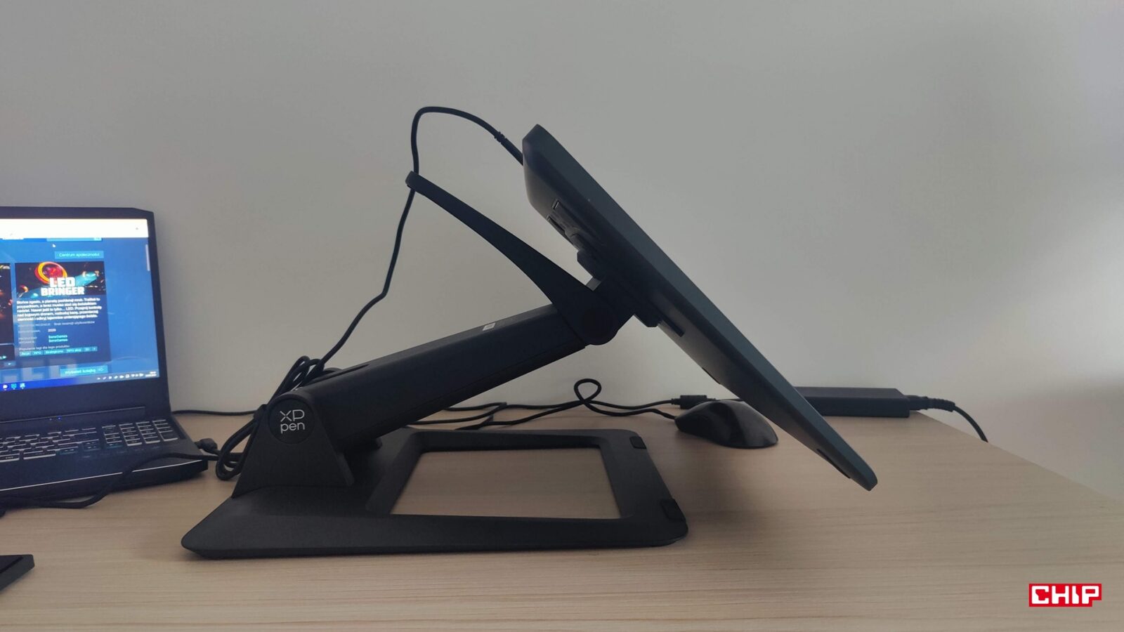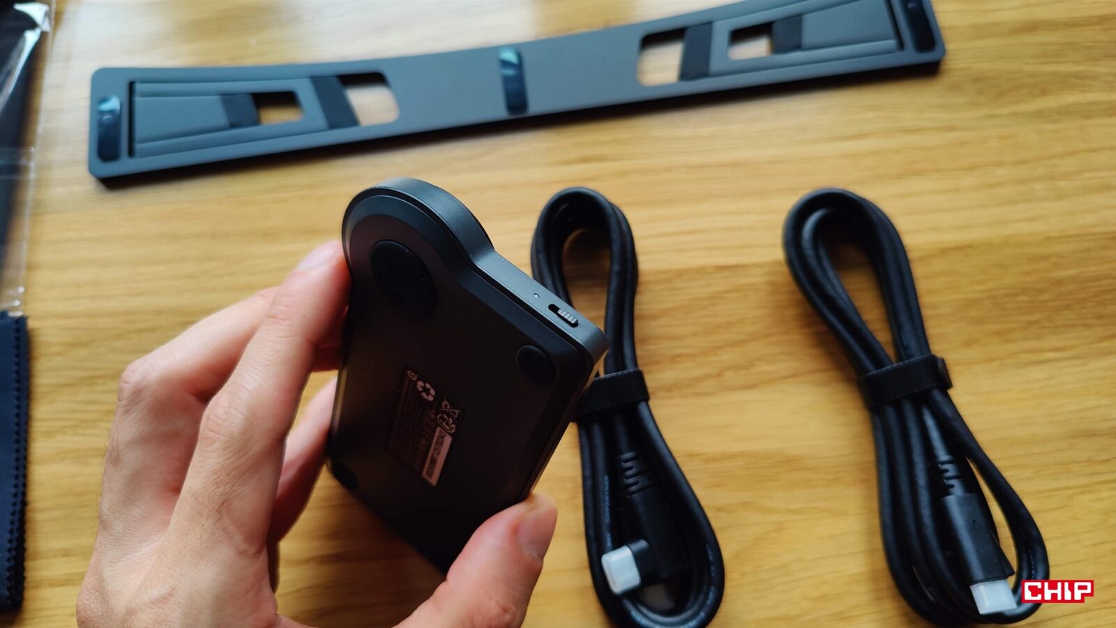 Resztę zestawu uzupełnia instrukcja obsługi, karta gwarancyjna, dobrej jakości ściereczka i rękawiczka, zestaw łącznie 20 wymiennych końcówek dla rysików, zasilacz AC->USB-A->USB-C z różnymi końcówkami, aż trzy przewody (dwa USB-C do 90-stopniowego USB-C oraz jeden 3w1 HDMI+USB-C -> USB-C) oraz… składany metalowy stojak ACS 16. Dostajemy więc tradycyjnie wszystko, żeby pracować na dowolnym komputerze bez polowania na brakujące kable, ale kwestia podstawki jest… zastanawiająca.