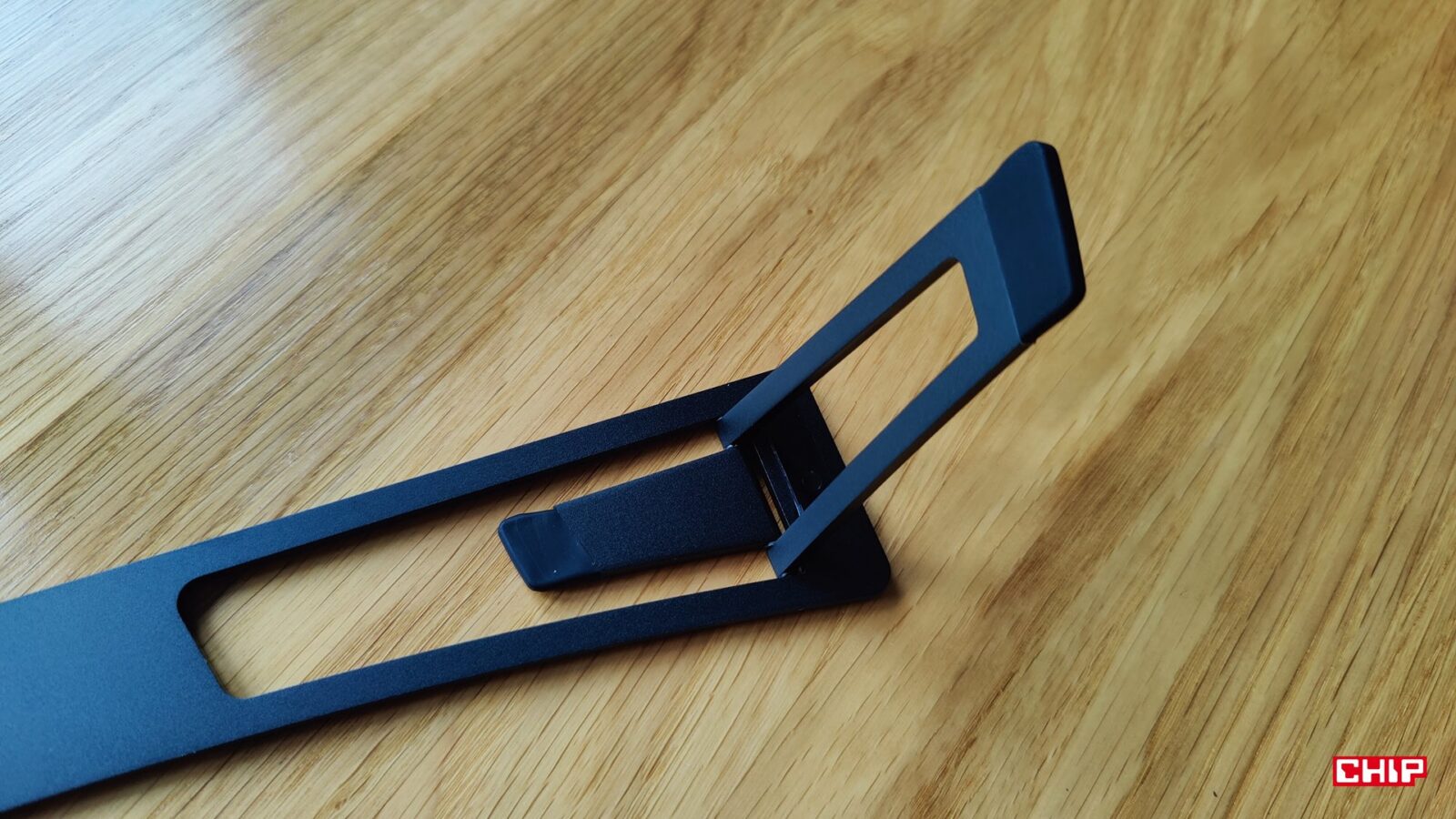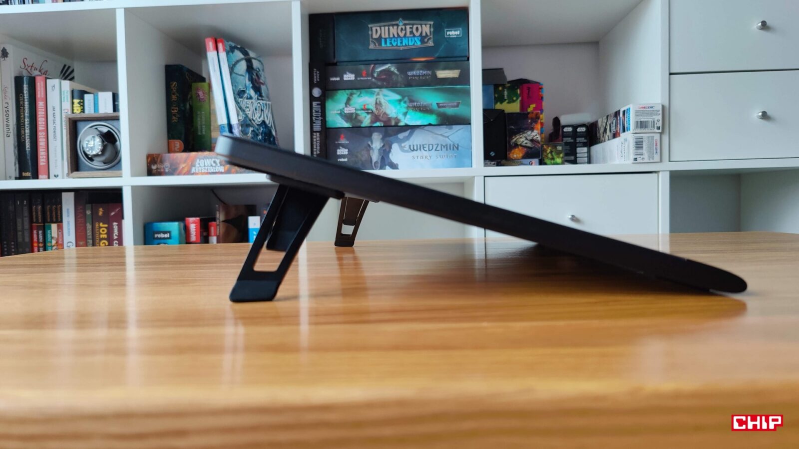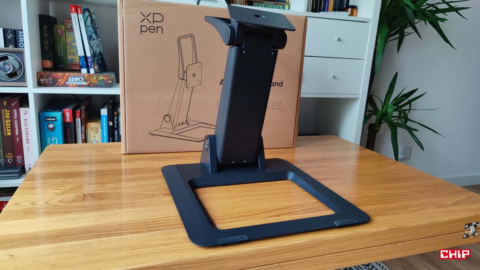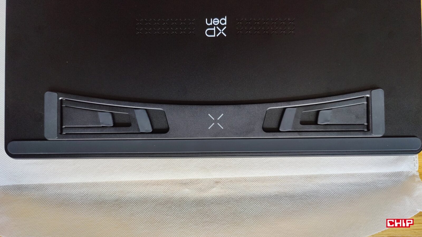 XPPen zdecydował, że zamiast integrować z tabletem konieczną do sensownej pracy podstawkę, to postawi na… to coś. Metalowa podstawka doklejana na dwustronną taśmę montażową z dwoma poziomami nachylenia obitymi w gumowe podkładki sugeruje albo błąd projektowy, albo oszczędność. Zwłaszcza że XPPen Artist Ultra 16 nie doczekał się opcjonalnego montażu VESA, choć inne modele w ofercie producenta już tak, a ten dodatek pozwala zrobić użytek ze specjalnej, ergonomicznej podstawki, która dosłownie rewolucjonizuje kwestię wygody.