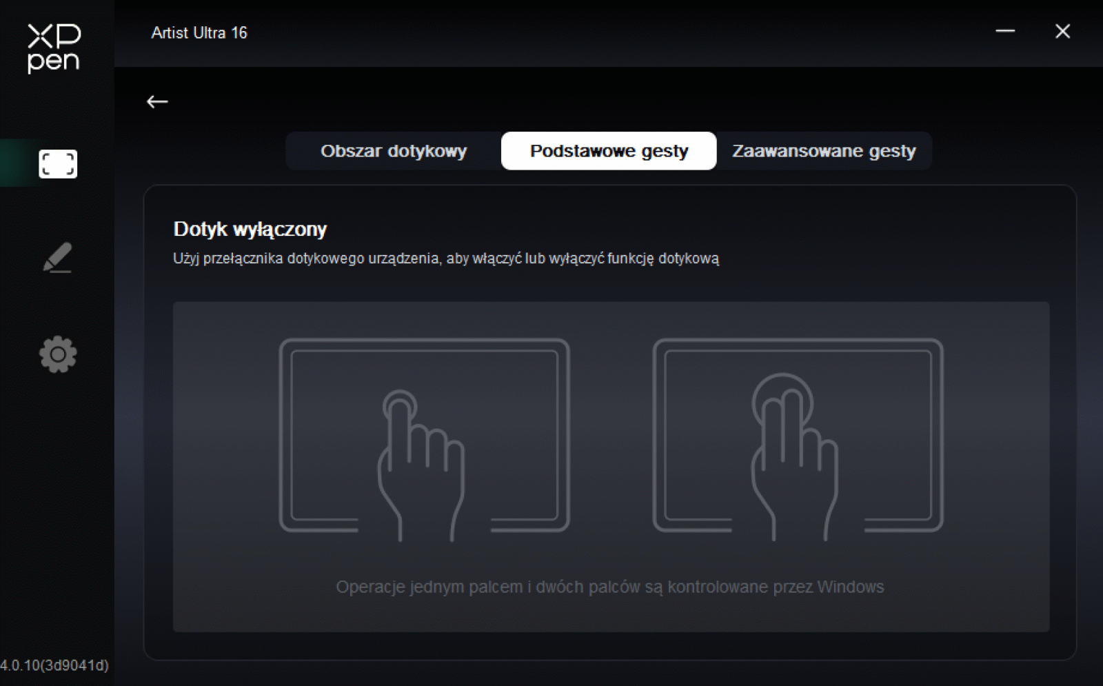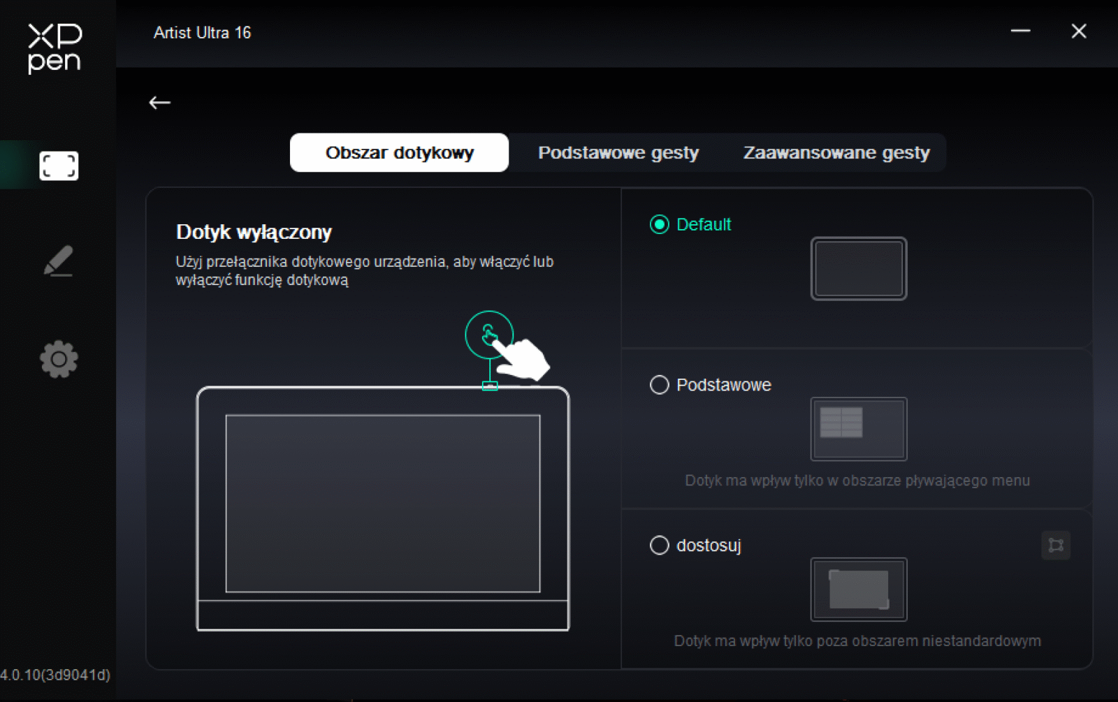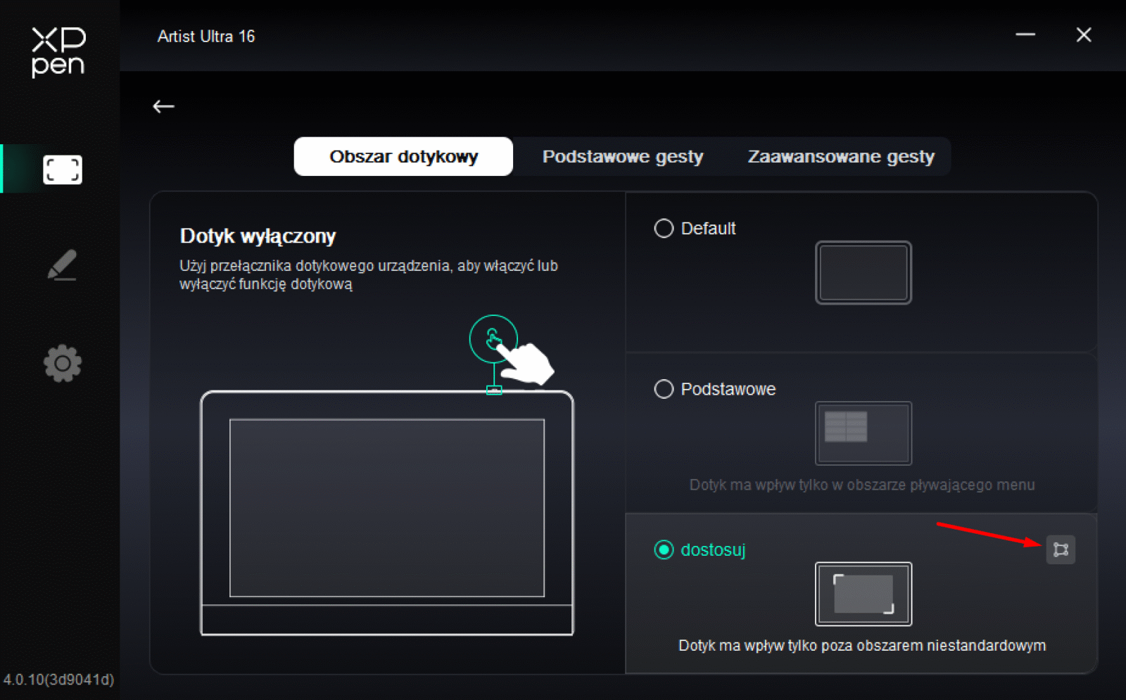 Pełny dotyk w tablecie graficznym ma sens tylko wtedy, gdy nie przeszkadza w rysowaniu. Obecny w XPPen Artist Ultra 16 aż 10-punktowy X-Touch, którego można dowolnie aktywować i dezaktywować przyciskiem na górnej krawędzi, rozwiązuje to dwutorowo. Naturalnie wspiera typową funkcję “palm rejection”, ale wiemy, że nie jest to idealne rozwiązanie, bo i tak doprowadza do przypadkowych aktywacji. Dlatego też największą robotę robi opcja wycięcia obszaru, w którym dotyk jest ignorowany, co warto ustawić na część interfejsu programu graficznego.