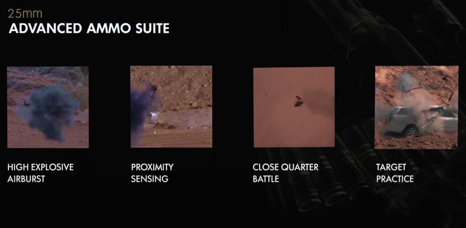 Na potrzebę tej broni Northrop Grumman opracował cztery typy amunicji 25 mm. Odłamkową detonującą w powietrzu do rażenia celów za osłonami, zbliżeniową przeciwko dronom, amunicję do walki w zwarciu na krótkich dystansach oraz treningową do szkolenia operatorów. To znaczące rozszerzenie możliwości w porównaniu z XM25, który koncentrował się głównie na programowalnej amunicji odłamkowej. Pewne jest też, że nowy granatnik będzie współpracować z nowoczesnymi systemami celowniczymi. Prototypy prezentowane są z komputerowymi celownikami XM157 od Vortex Optics oraz systemami SMASH izraelskiej firmy Smartshooter. Te ostatnie oferują szczególnie zaawansowane możliwości, bo potrafią automatycznie śledzić i trafiać w małe drony poruszające się z dużą prędkością na dystansach do 250 metrów.