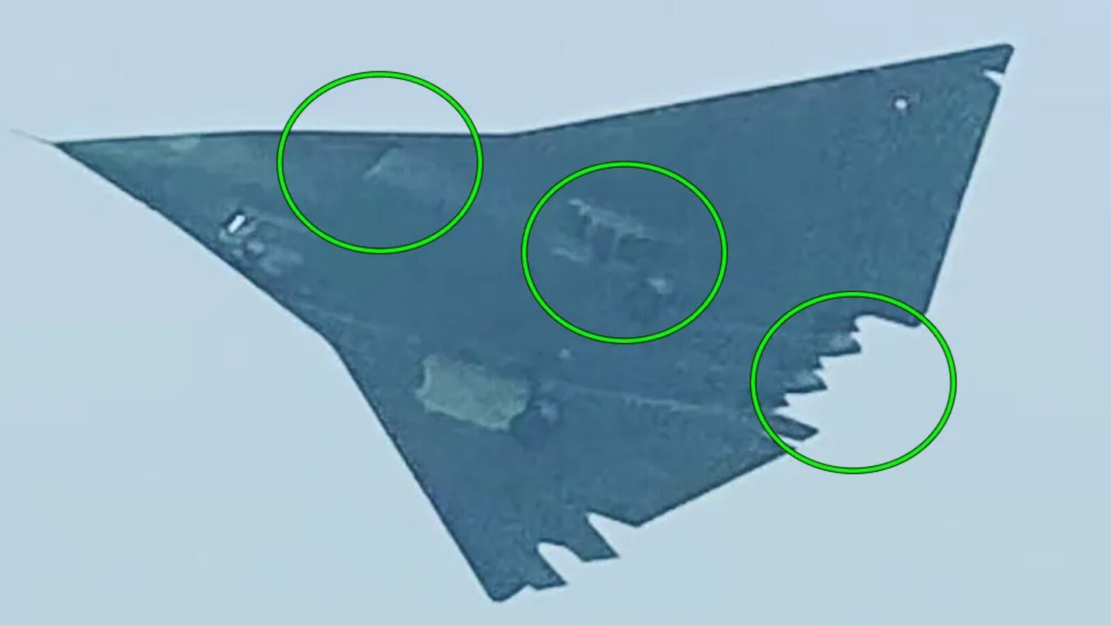 Zdjęcia przedstawiają też widok grzbietowego wlotu powietrza w tym trzysilnikowym samolocie, dolne trapezoidalne wloty powietrza, elektrooptyczne okno z boku nosa, ale przede wszystkim przypominają, jak duży jest ten samolot. Zwykle bowiem samoloty bezogonowe, a zwłaszcza te typu stealth, mogą wyglądać na znacznie mniejsze z boku niż z przodu, z góry lub z dołu.