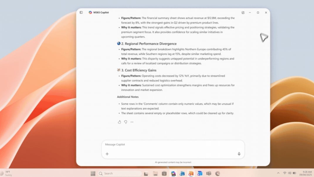Pliki z Copilotem potrafi analizować dokumenty, podsumowywać prezentacje, śledzić zmiany w plikach czy przeglądać dane w arkuszach kalkulacyjnych. Wystarczy polecenie w rodzaju „Podsumuj ten dokument”, aby system wyciągnął najważniejsze informacje z nawet najbardziej rozbudowanych materiałów. W praktyce może to oznaczać oszczędność czasu przy pracy z obszernymi raportami.