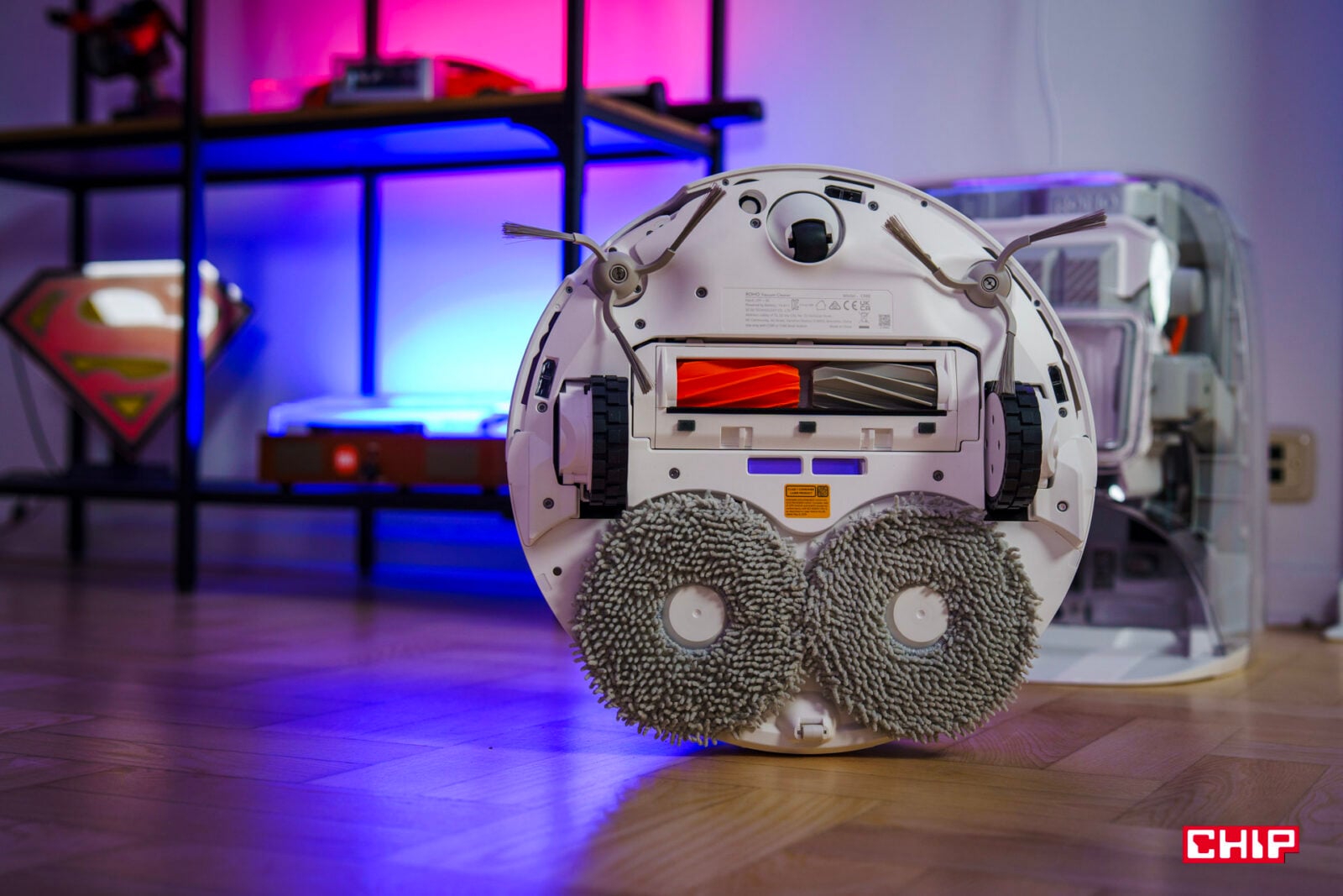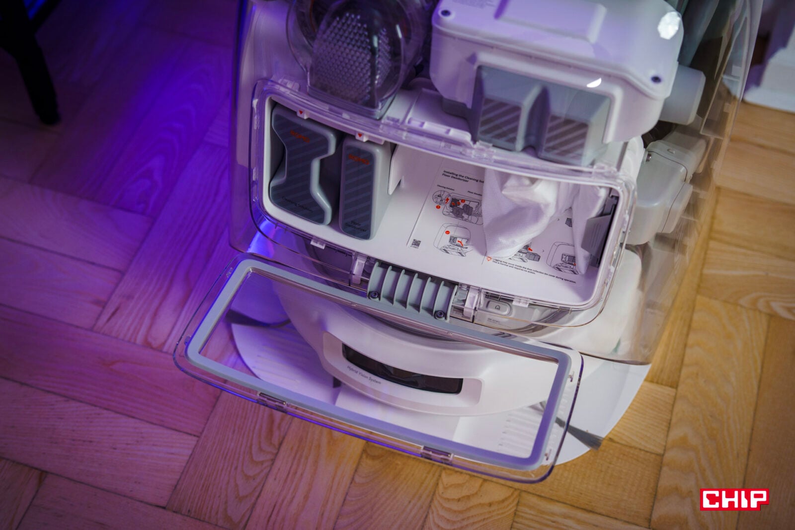 Stacja myjąca nie ogranicza się do zeskrobywania brudu z padów. Cztery dysze wysokociśnieniowe przepłukują pady i tackę, a duży — 16-milimetrowy — kanał zasysający odpady odprowadza je do systemu, co ma dać nawet do 200 dni pracy bez zaglądania do środka. Podczas mycia stacja dociska pady siłą 12 N, a przy odkurzaniu 3-stopniowa komora wygłuszająca z długimi kanałami i tłumikami ma redukować nawet 80% hałasu zasysania kurzu. Wnętrze tacki zaprojektowano tak, by łatwo się nie zapychało.