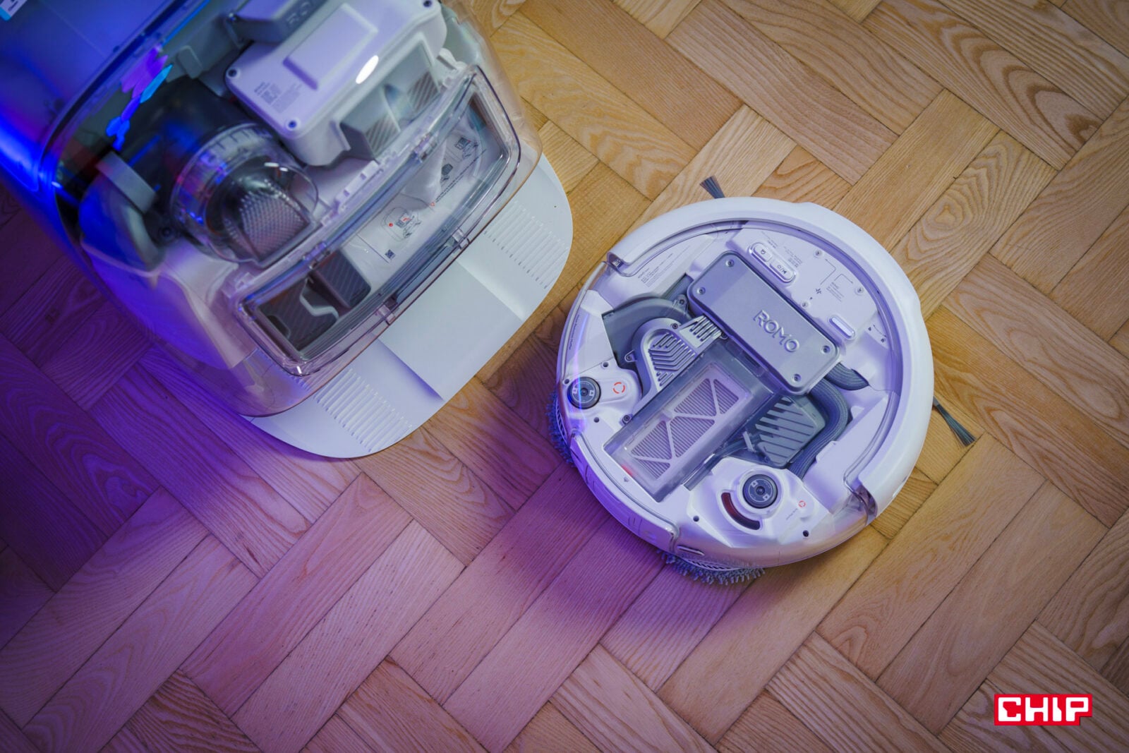 ROMO odcina się od trendu „czarnego krążka pod kanapą”. Wariant ROMO P ma przezroczyste panele zarówno w robocie, jak i w stacji dokującej, więc widać uporządkowaną mechanikę i kanały powietrzne — estetyka inspirowana „meduzą” łączy minimalizm z pokazaniem, jak to działa. Wygląda to absolutnie przepięknie i bez dwóch zdań jest to najładniejszy robot sprzątający, jaki kiedykolwiek powstał — to dosłownie odkurzacz łączący w sobie najlepsze czasy designu technologii użytkowej, przypadającej na transparentne komputery iMac i „nową falę” rozpoczętą między innymi przez Nothing. Designerskie cudo!