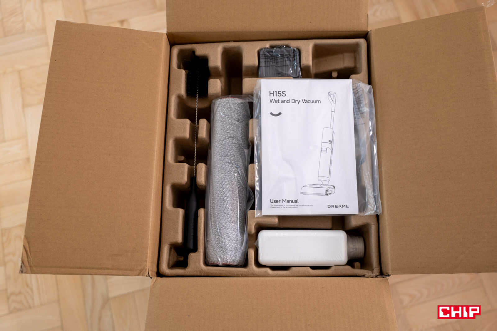 Jeszcze przed otwarciem kartonu miałem obawy, że niższa cena będzie oznaczała mniejszą liczbę akcesoriów. Na szczęście producent zadbał o to, by po otworzeniu kartonu z Dreame H15s nie czekało nas rozczarowanie. W zestawie znajdziemy niskopieniący płyn do czyszczenia powierzchni płaskich w butelce o pojemności 500 ml, co wystarczy na kilkanaście czyszczeń. Poza tym w zestawie znajdziemy nie jedną, a dwie rolki mopujące. Oprócz tego producent nie zapomniał o dorzuceniu uniwersalnego czyścika, który pomoże w zadbaniu o pojemnik na brudną wodę.