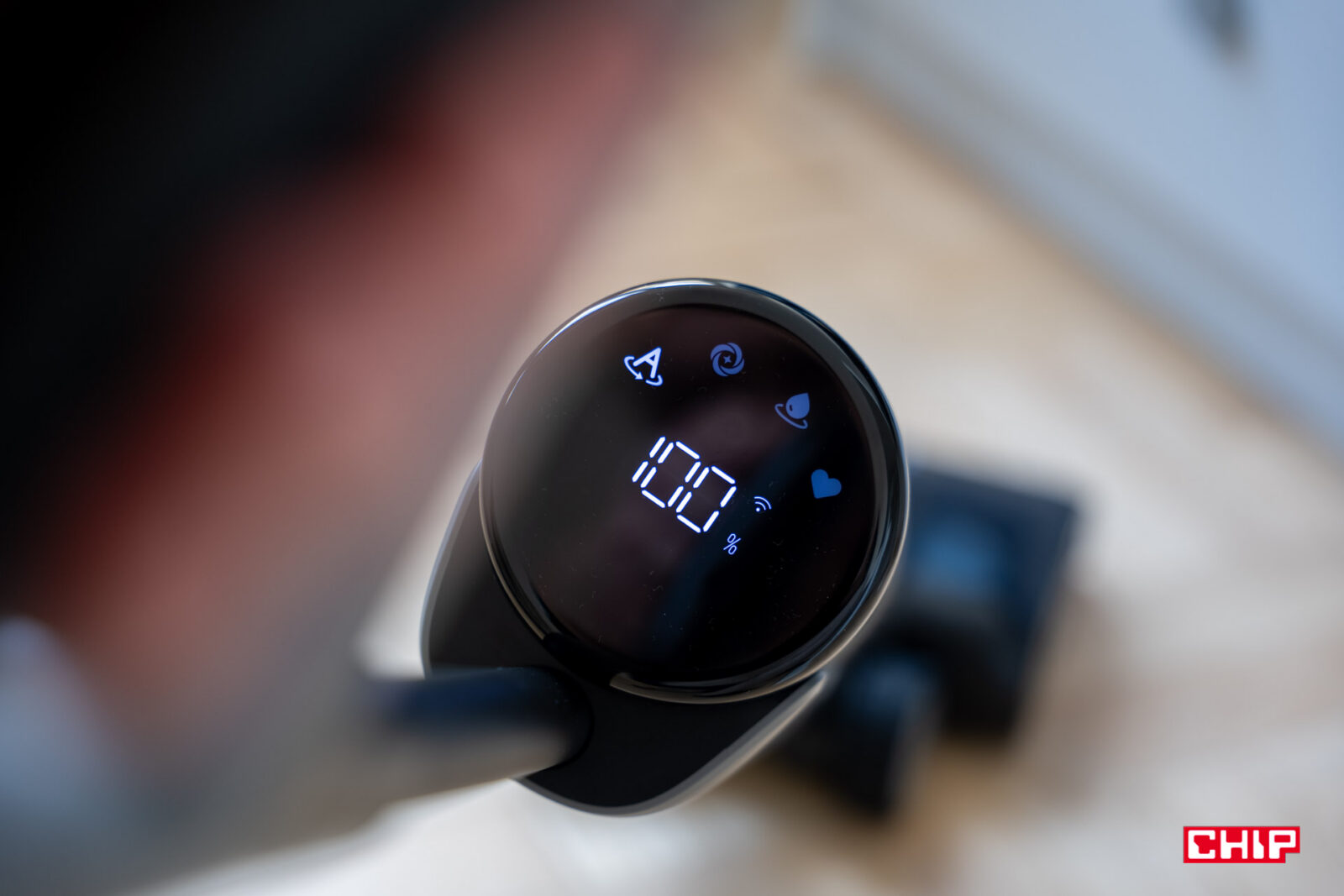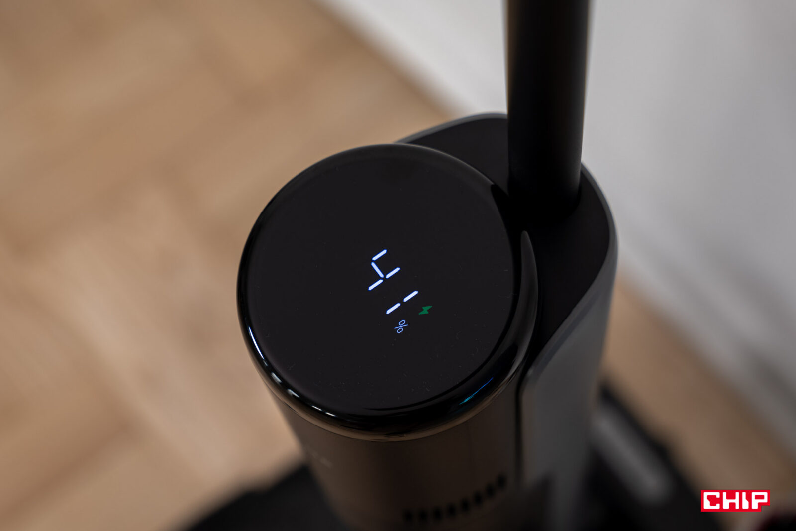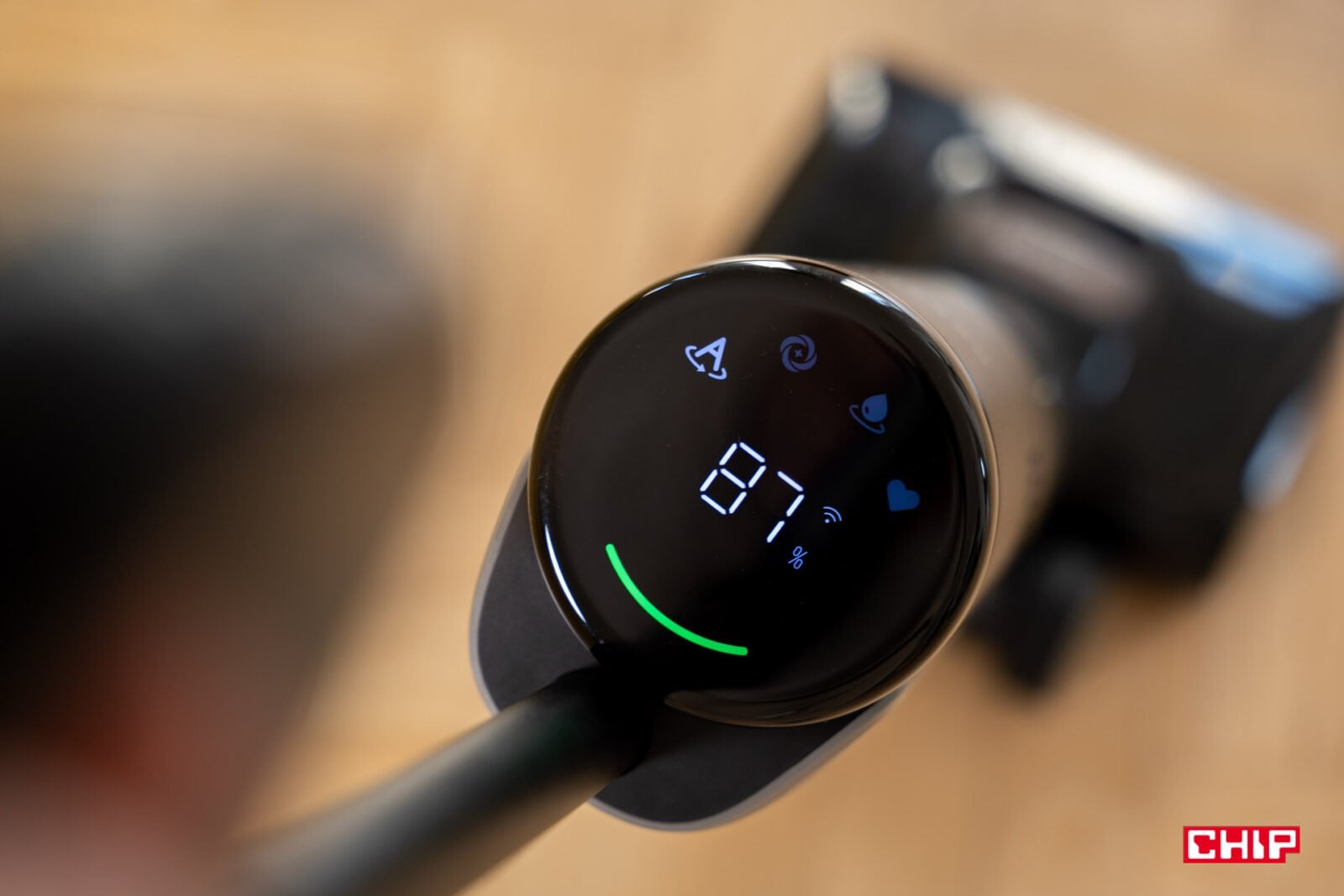 Dreame H15s kontynuuje serię przemyślanych rozwiązań w tej serii. Wyświetlacz stopień naładowania pokazuje zawsze w kierunku zgodnym z położeniem urządzenia, więc na stacji dokującej procenty są skierowane ku nam. Tak samo cieszy, że zarówno ikony na wyświetlaczu, jak i sam procentowy pomiar energii, są duże i czytelne. Oszczędność względem droższego modelu stanowi to, że tym razem wszystkie operują w tym samym kolorze. Ikony informują o jednym z czterech aktywnych trybów, stanie ładowania oraz połączeniu z Wi-Fi. Tak, Dreame H15s także korzysta z aplikacji mobilnej.