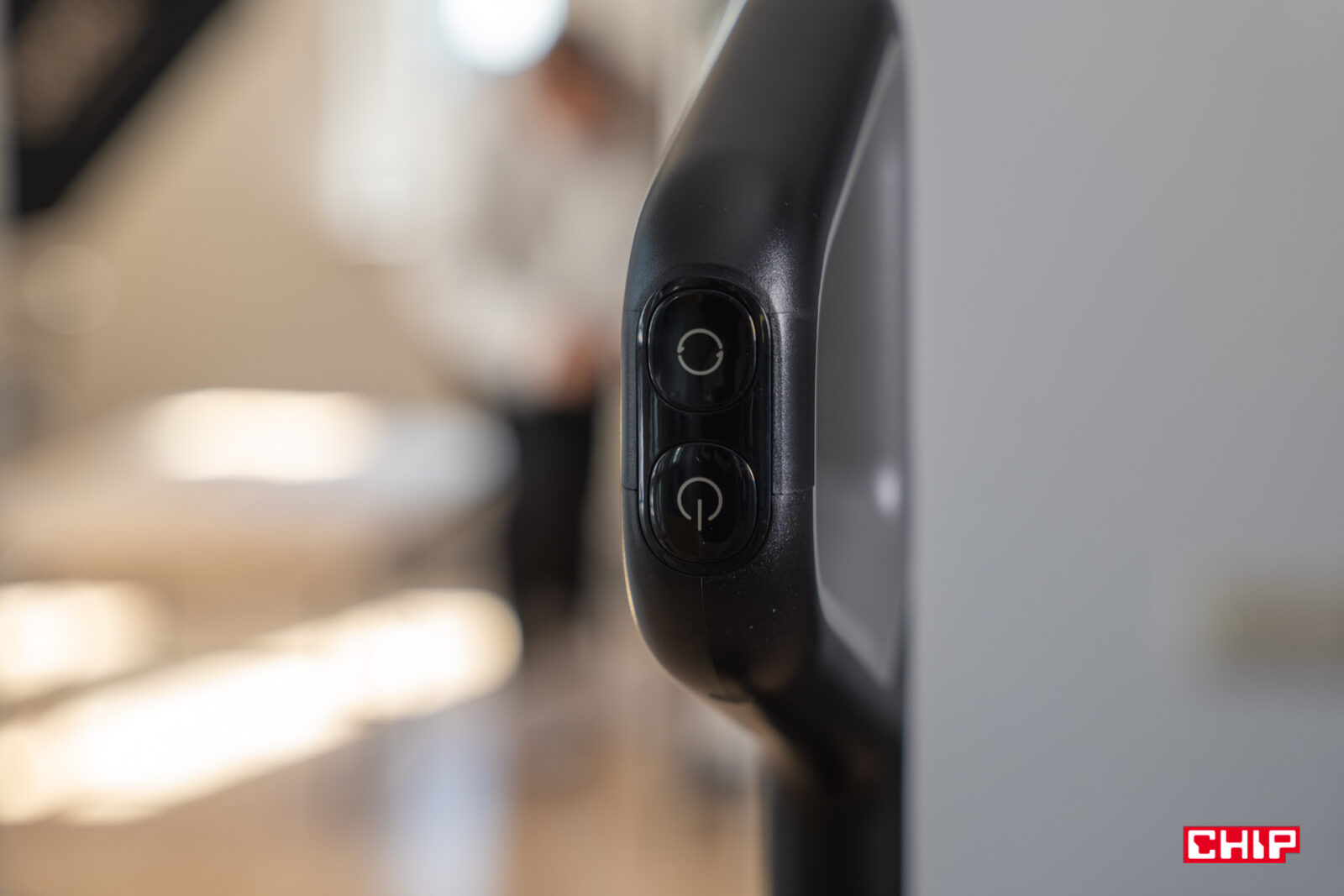 Rączka kryje w sobie standardowy zestaw przycisków. W niższej części, gdzie łatwiej dosięgnąć kciukiem, znajdziemy włącznik oraz przełącznik trybów. Gdy odłożymy Dreame H15s, łatwiej będzie kliknąć znajdujący się u góry przycisk włączający program do suszenia. Kształt rączki nie powinien zaskoczyć nikogo, kto kiedykolwiek korzystał z urządzenia Dreame – rękojeść nadaje się do trzymania przez długi czas i choć na początku może wydawać się smukła, to w zupełności wystarczy, by kontrolować urządzenie bez obawy o wyślizgnięcie się.
