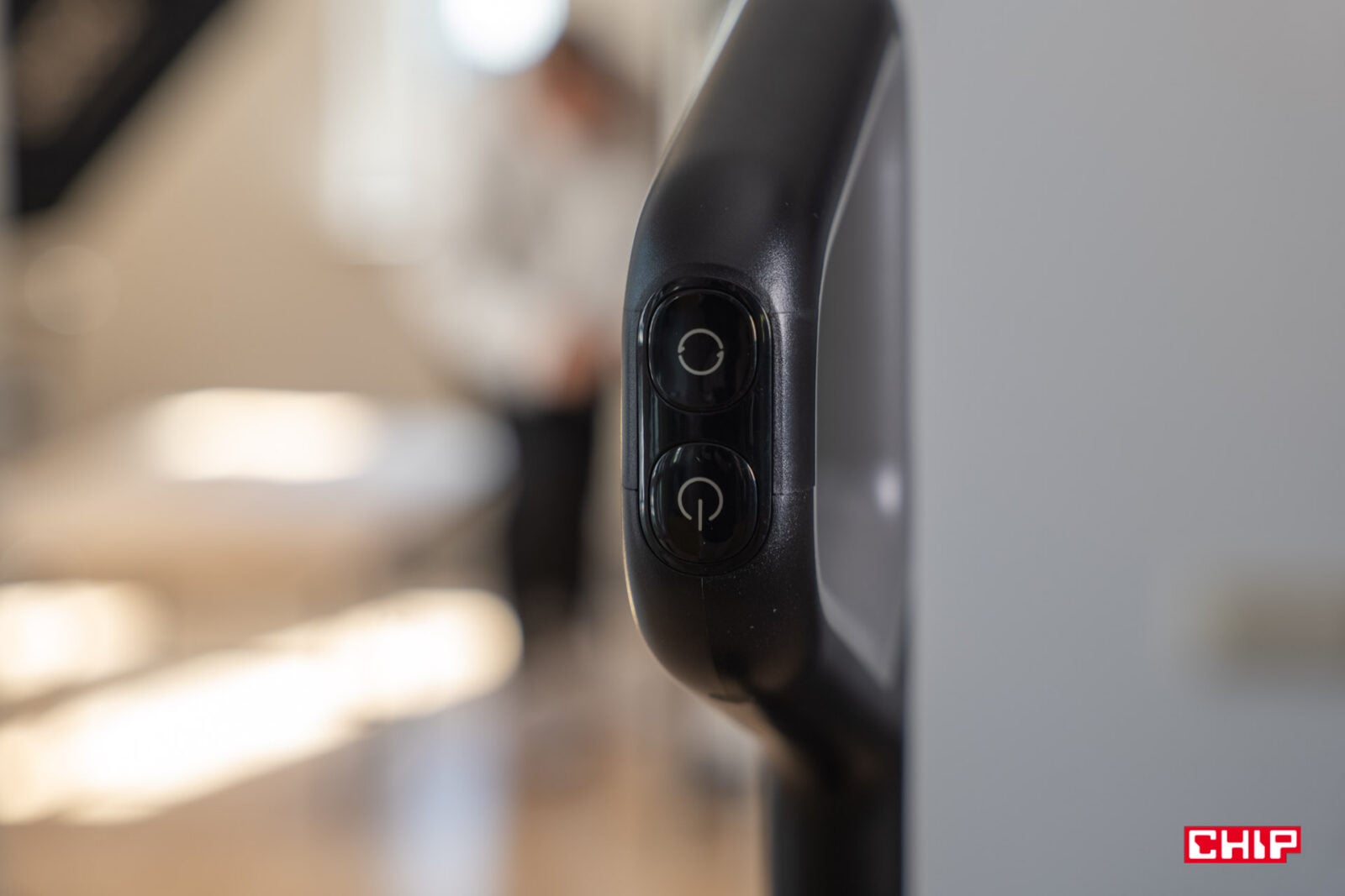 Wyjmujemy urządzenie ze stacji dokującej, naciskamy włącznik i… nic się nie dzieje. To nie błąd – aby odpalić odkurzacz Wet & Dry musimy odchylić jego ramię względem podstawy. Wtedy łatwiej będzie opanować motory napędzające wałek sprzątający oraz samego robota.