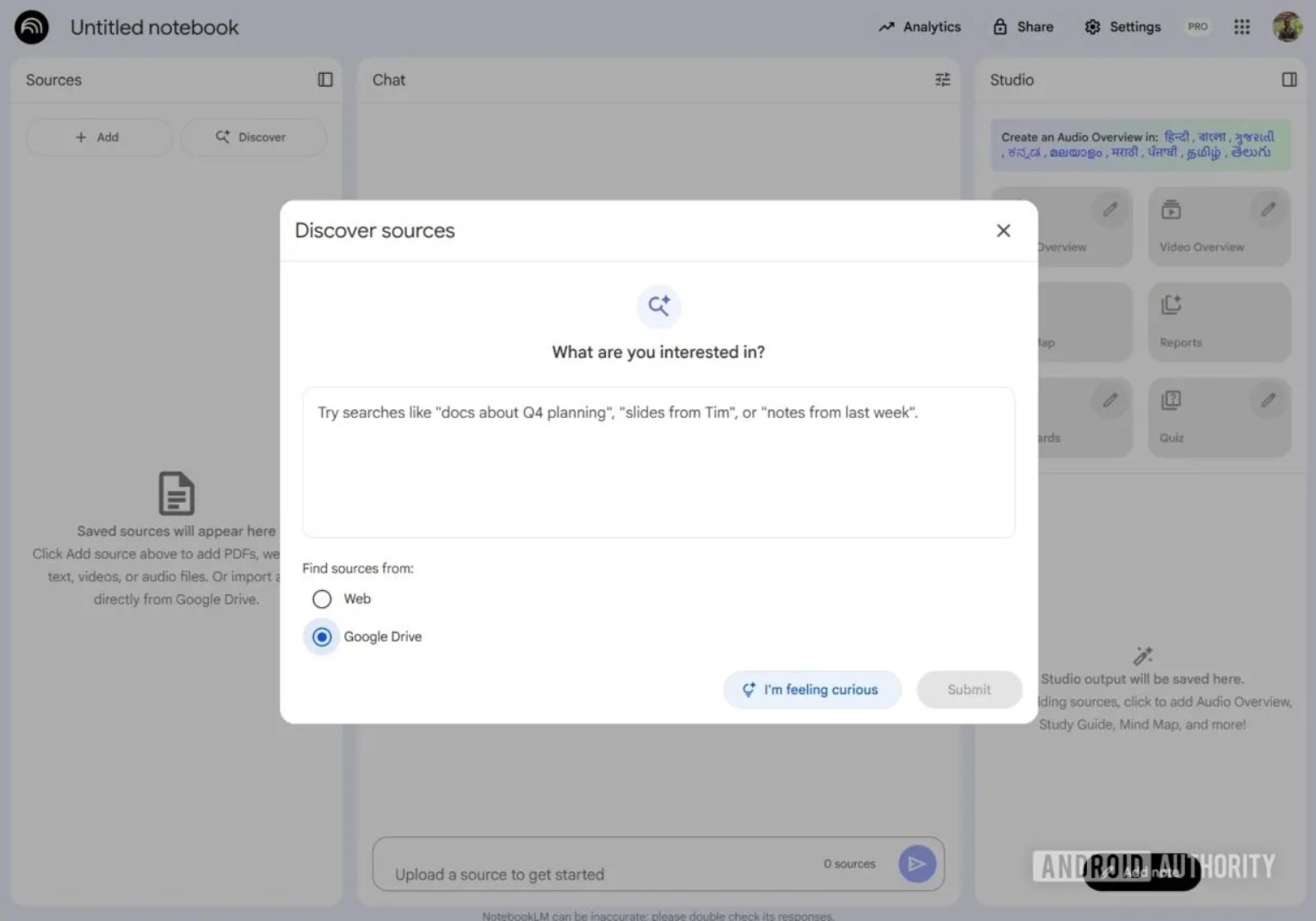 Do tej pory NotebookLM oferował już integrację z Dyskiem Google, ale była ona ograniczona do wyszukiwania i dodawania plików po nazwie. Było to niewystarczające, gdy mieliśmy pięć plików o nazwie np.”Planowanie Q4″, ale potrzebowaliśmy tego, który zawierał konkretną frazę. Nowa opcja, dyskretnie dodana do funkcji “Odkryj Źródła” (Discover Sources), pozwala na znacznie głębsze, treściowe wyszukiwanie.