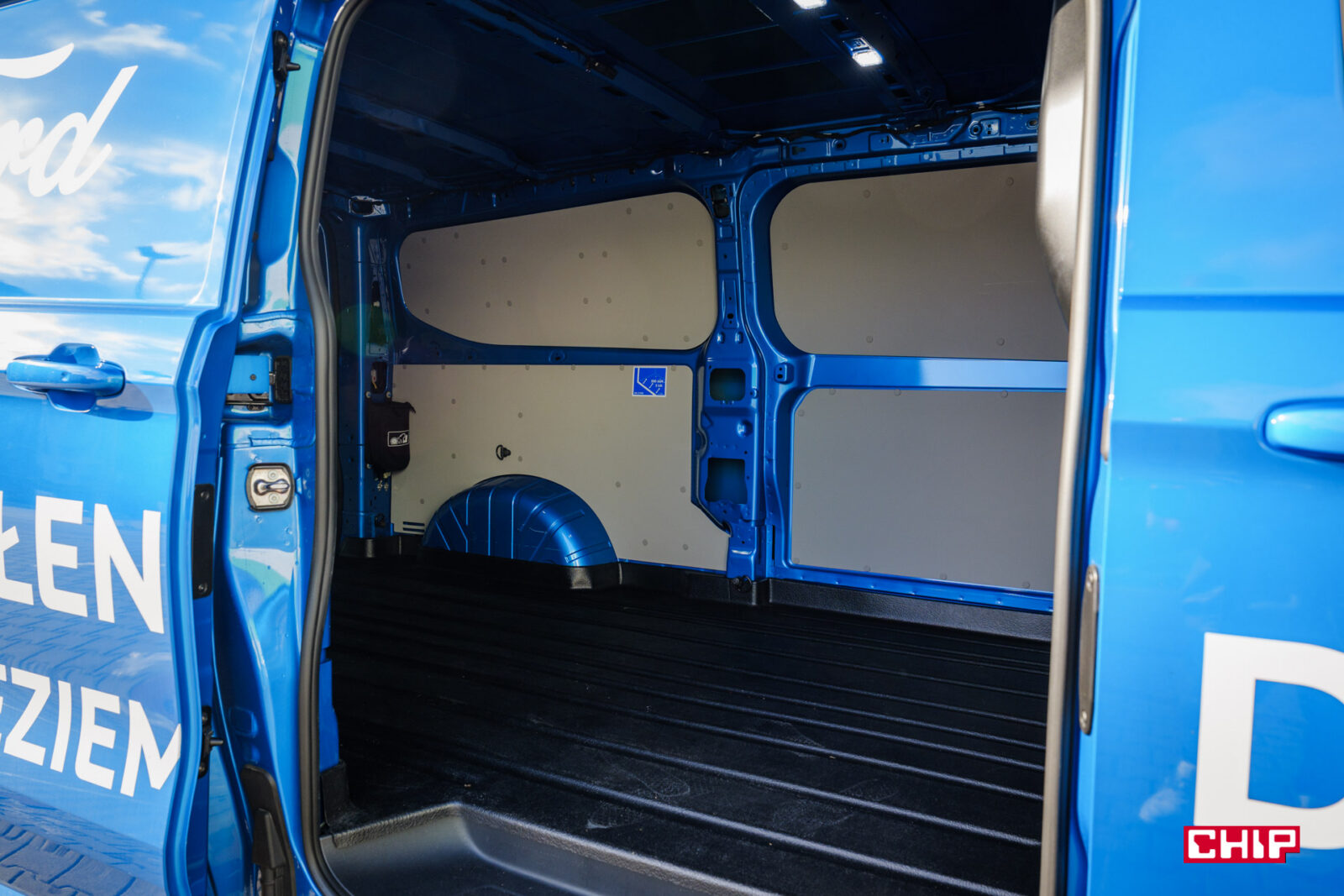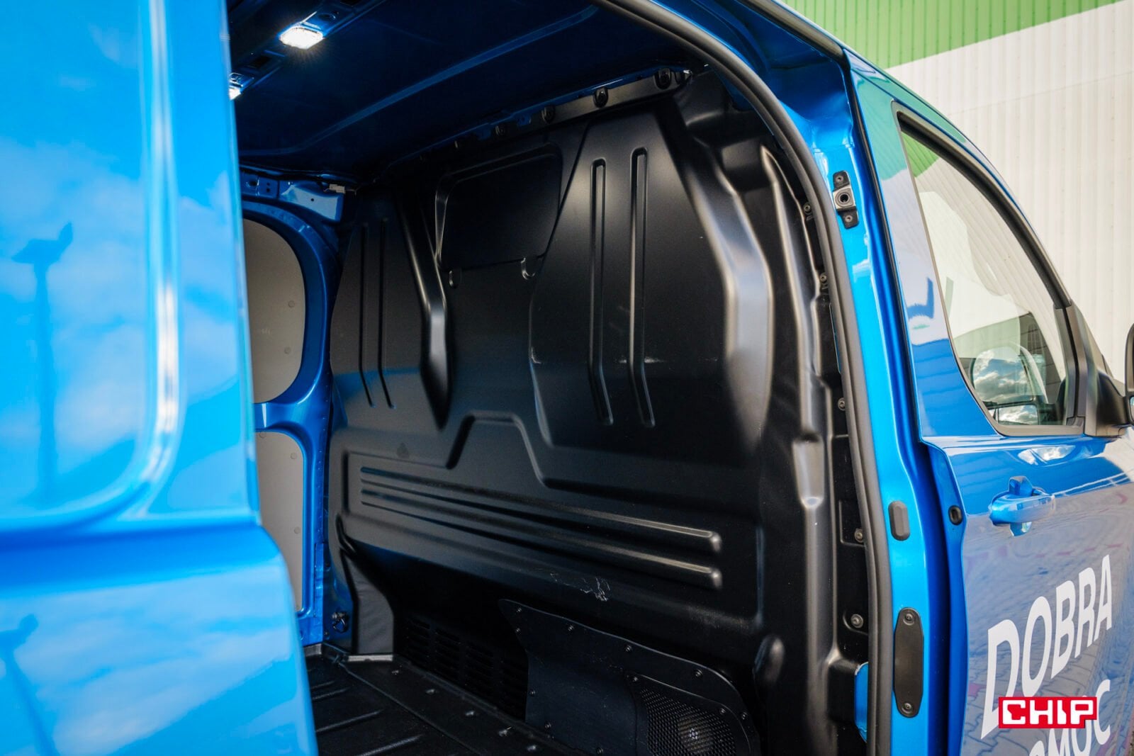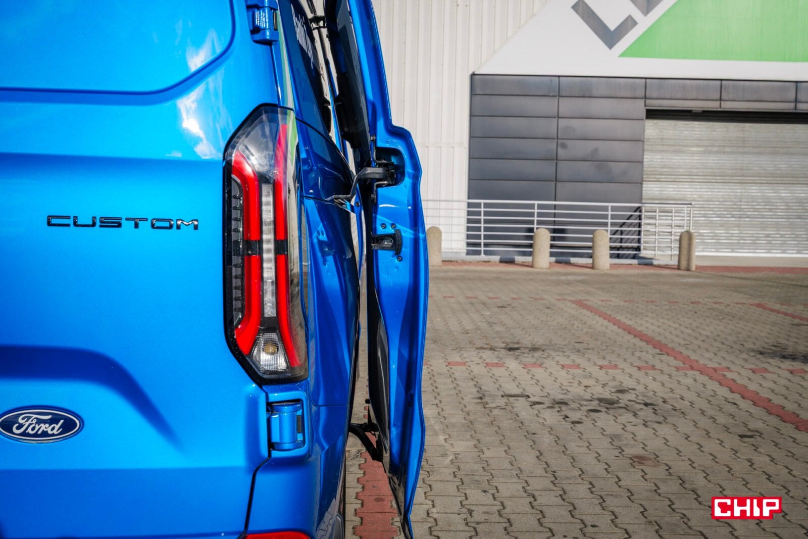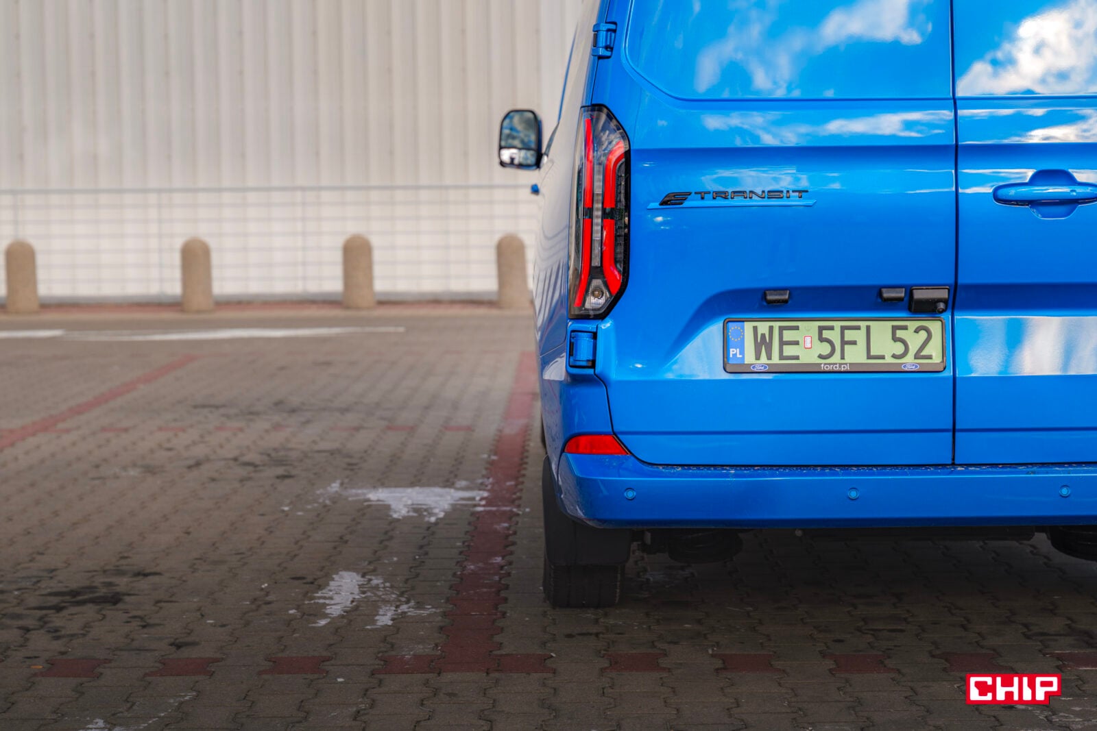 Przesuwane drzwi mamy na prawym boku i nie zajmują one dużo miejsca. Poszerzają auto o nie więcej niż 25-35, ale o przestrzeni ładunkowej porozmawiamy za moment. Za drzwi po lewej stronie trzeba dopłacić 1 900 zł. Z tyłu znajdziemy podwójne drzwi oraz bardzo efektowne światła. Kolejny element, który zdecydowanie działa na wizualny plus elektrycznego Transita. Nie są to jednak LED-y, te są zarezerwowane dla wyższych wersji wyposażenia.