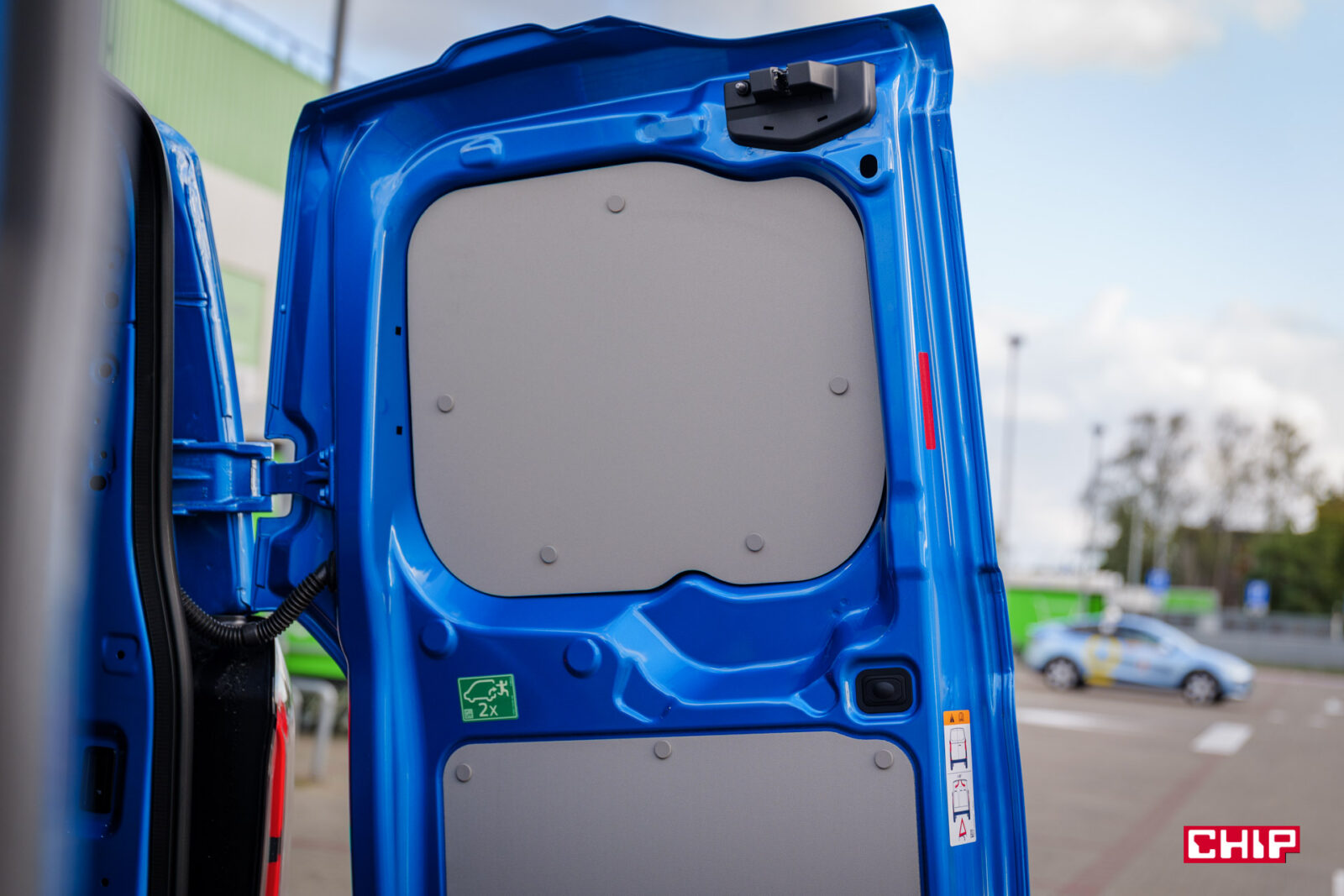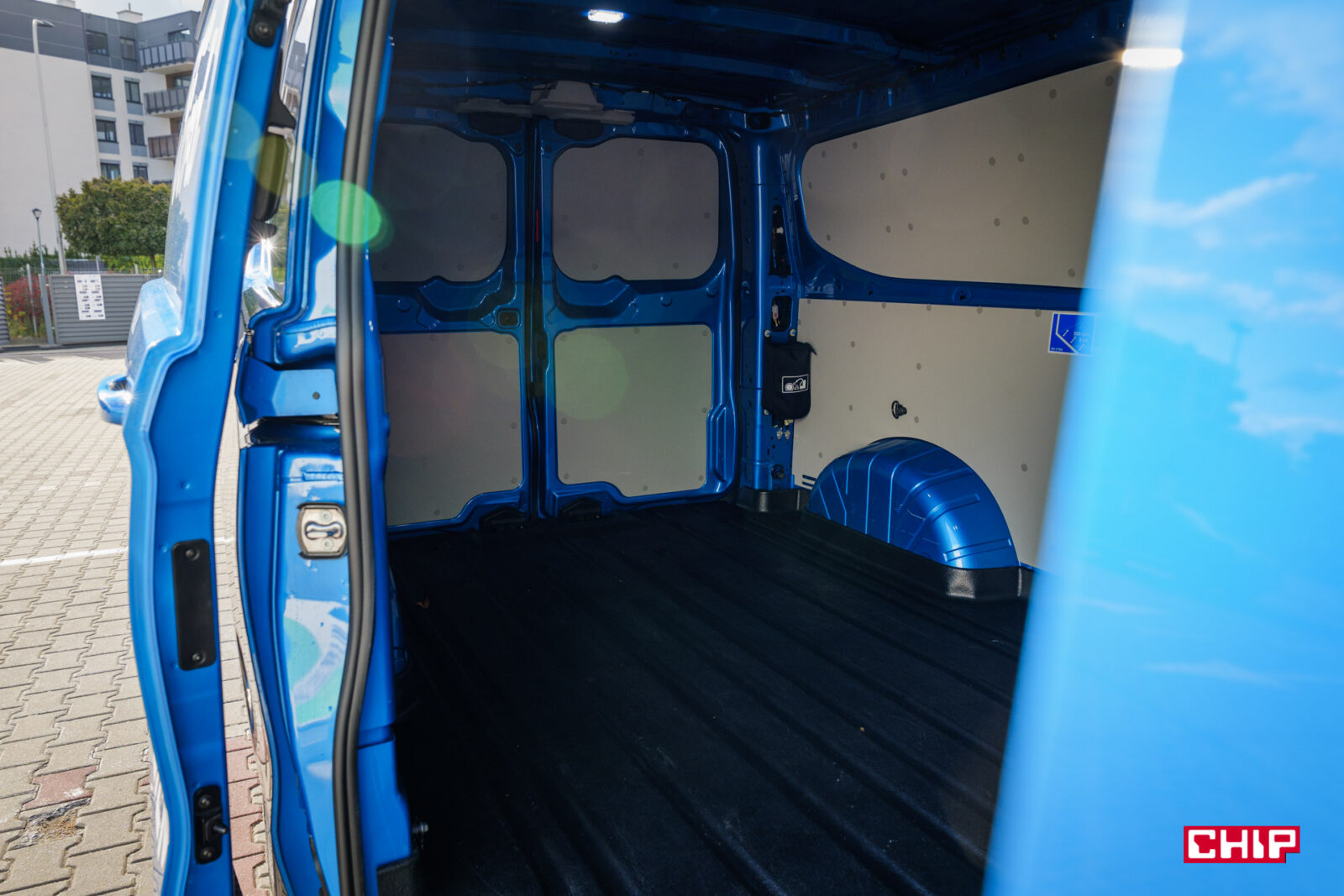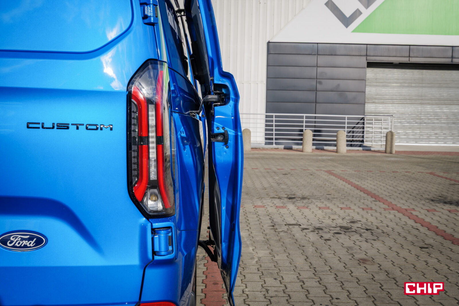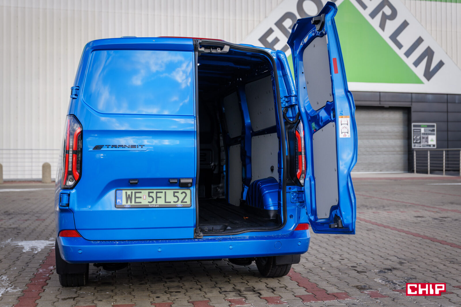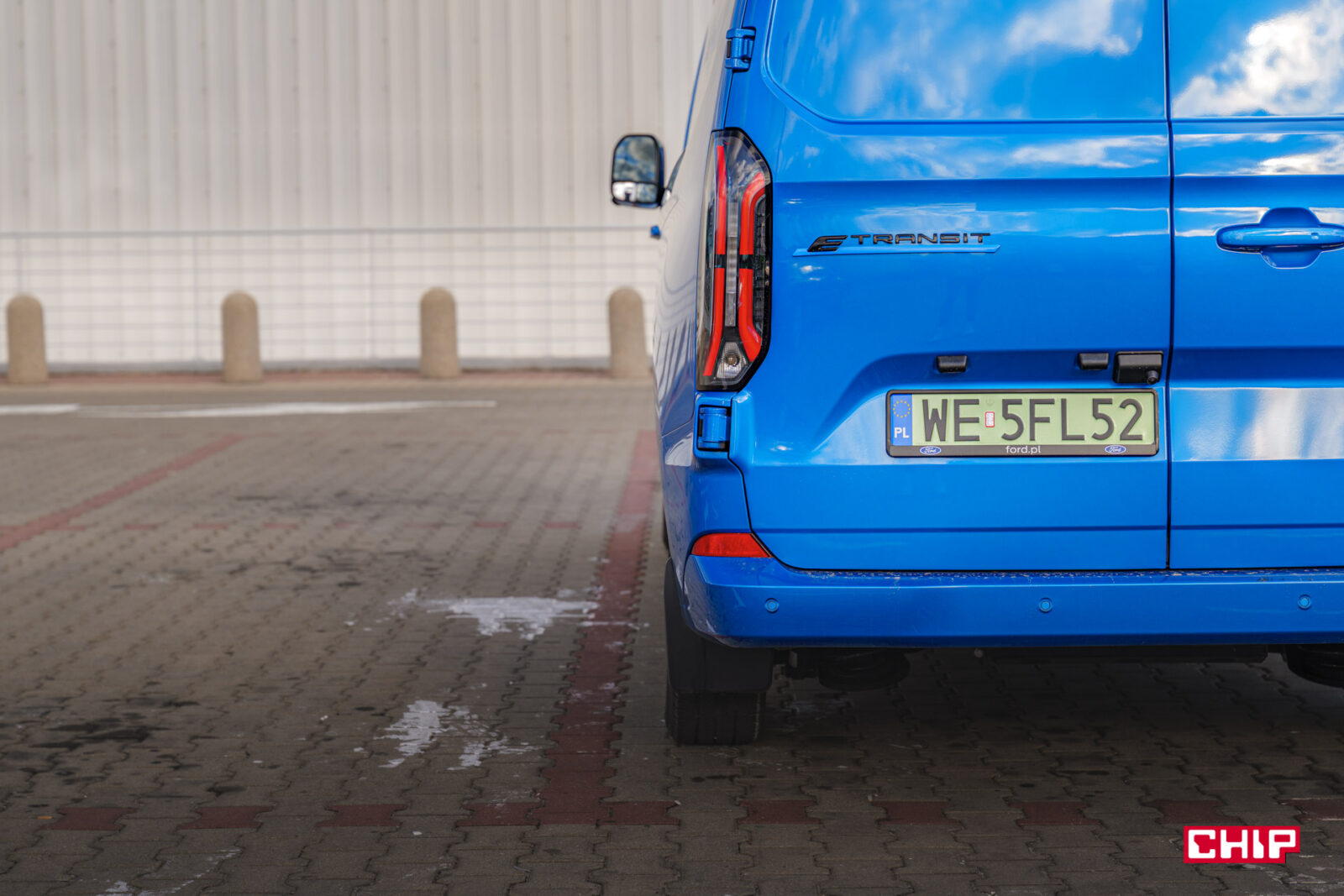 Przesuwane drzwi mamy na prawym boku i nie zajmują one dużo miejsca. Poszerzają auto o nie więcej niż 25-35, ale o przestrzeni ładunkowej porozmawiamy za moment. Za drzwi po lewej stronie trzeba dopłacić 1 900 zł. Z tyłu znajdziemy podwójne drzwi oraz bardzo efektowne światła. Kolejny element, który zdecydowanie działa na wizualny plus elektrycznego Transita. Nie są to jednak LED-y, te są zarezerwowane dla wyższych wersji wyposażenia.