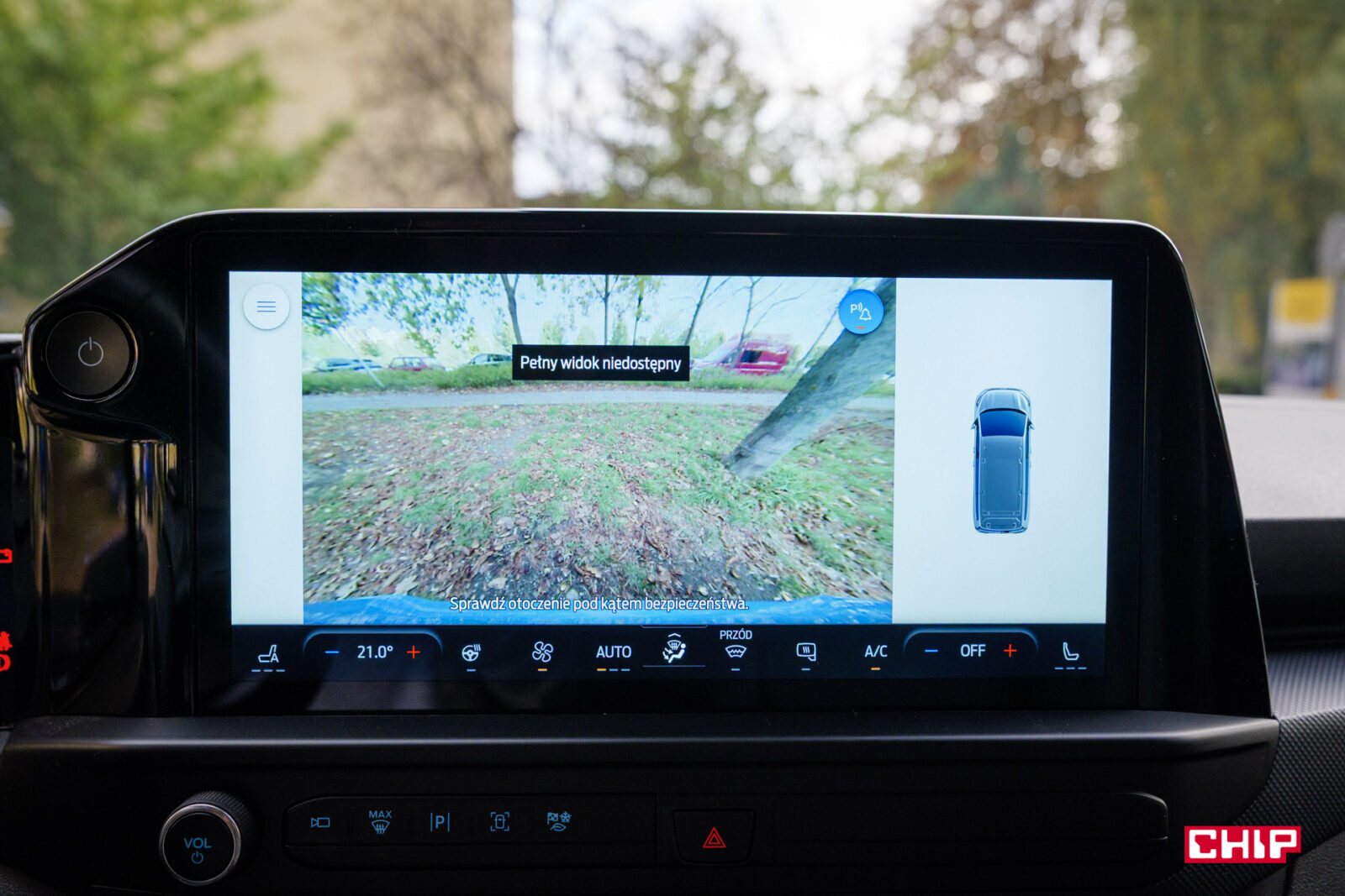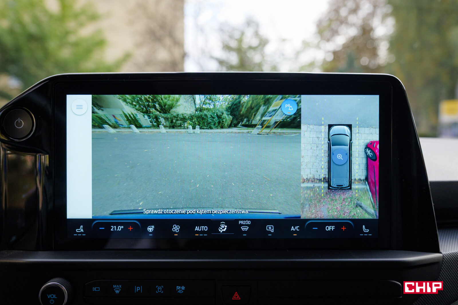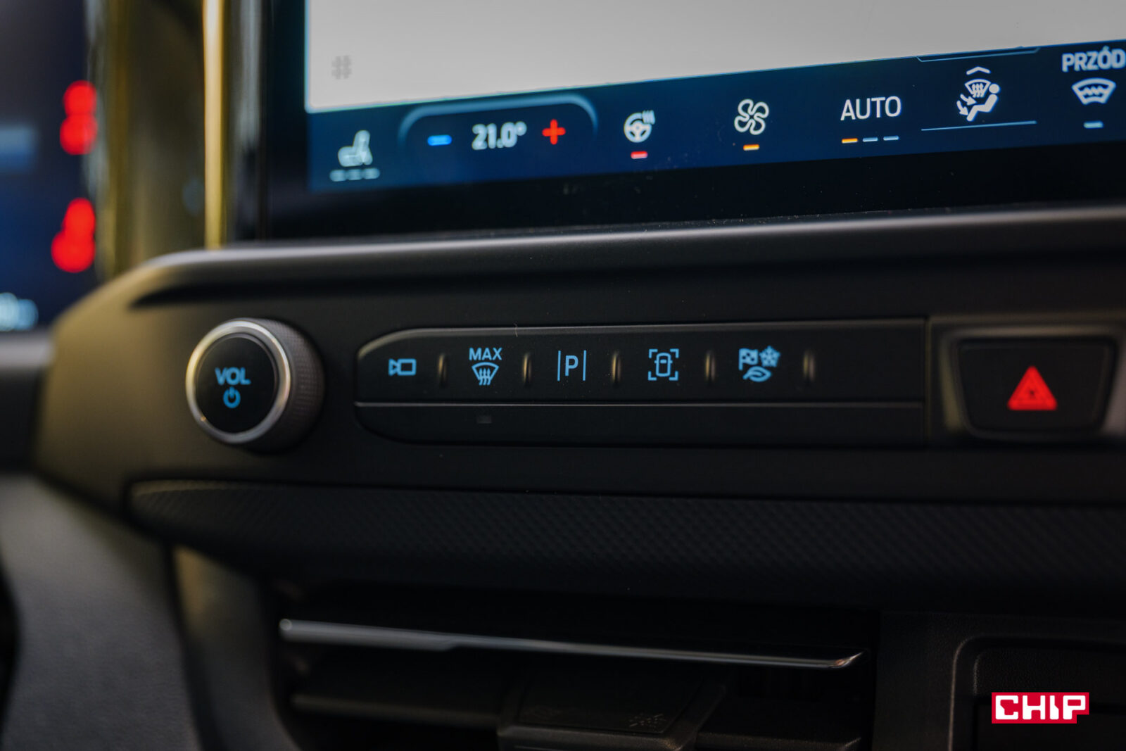 Sterowanie klimatyzacją jest niestety przeniesione na ekran. Jedyne fizyczne pokrętło odpowiada za regulację głośności. Plusem jest jednak to, że sterowanie klimatyzacją jest zawsze widoczne na ekranie w postaci paska wzdłuż dolnej krawędzi, a przyciski zmiany temperatury są duże i czytelne.