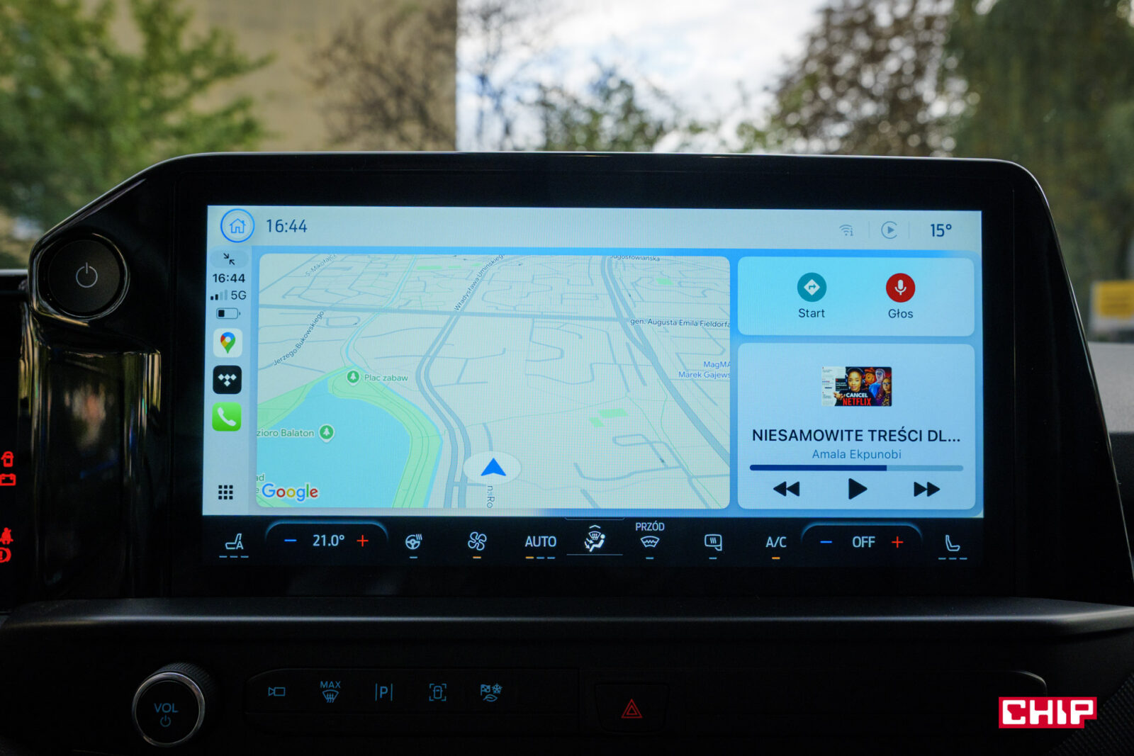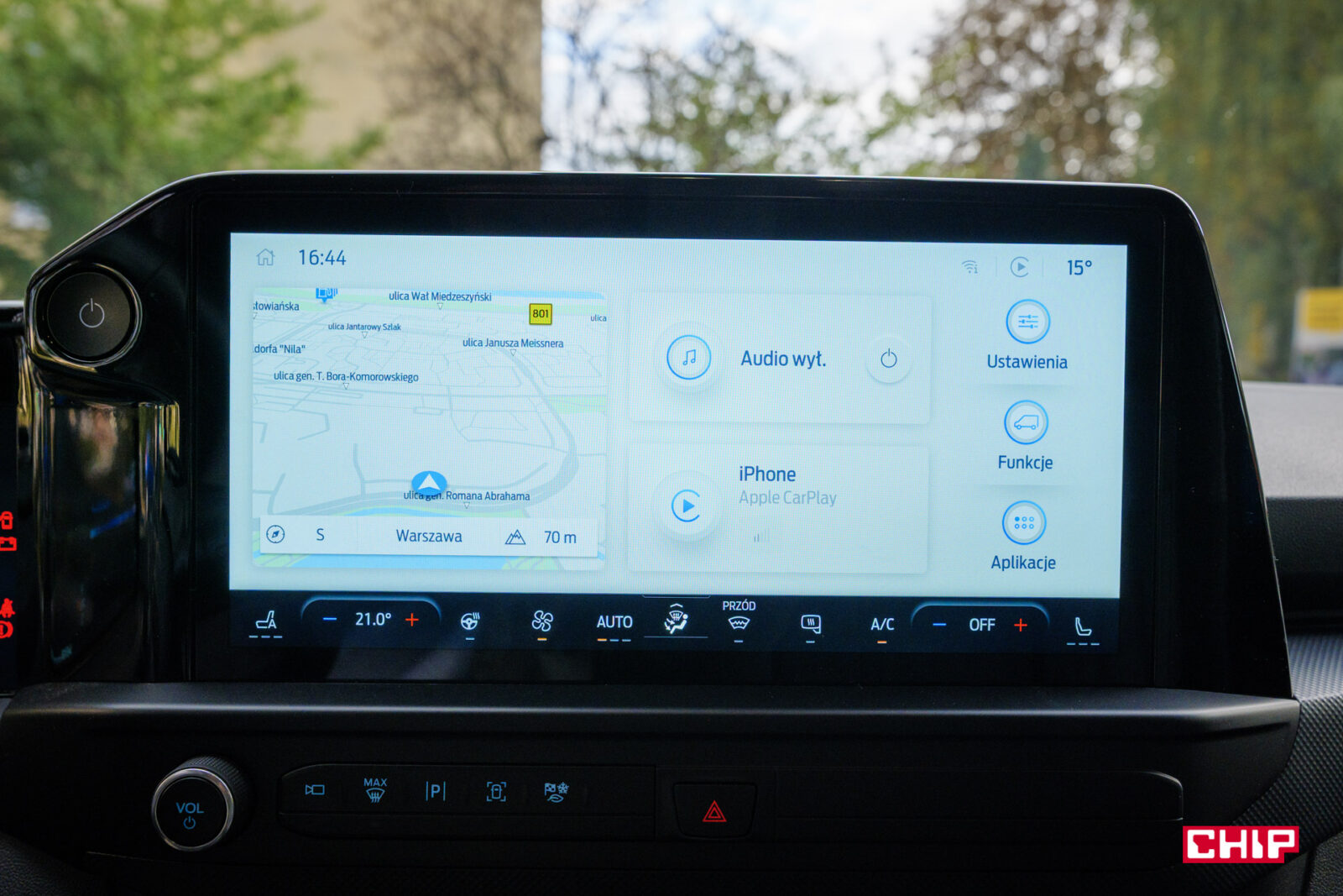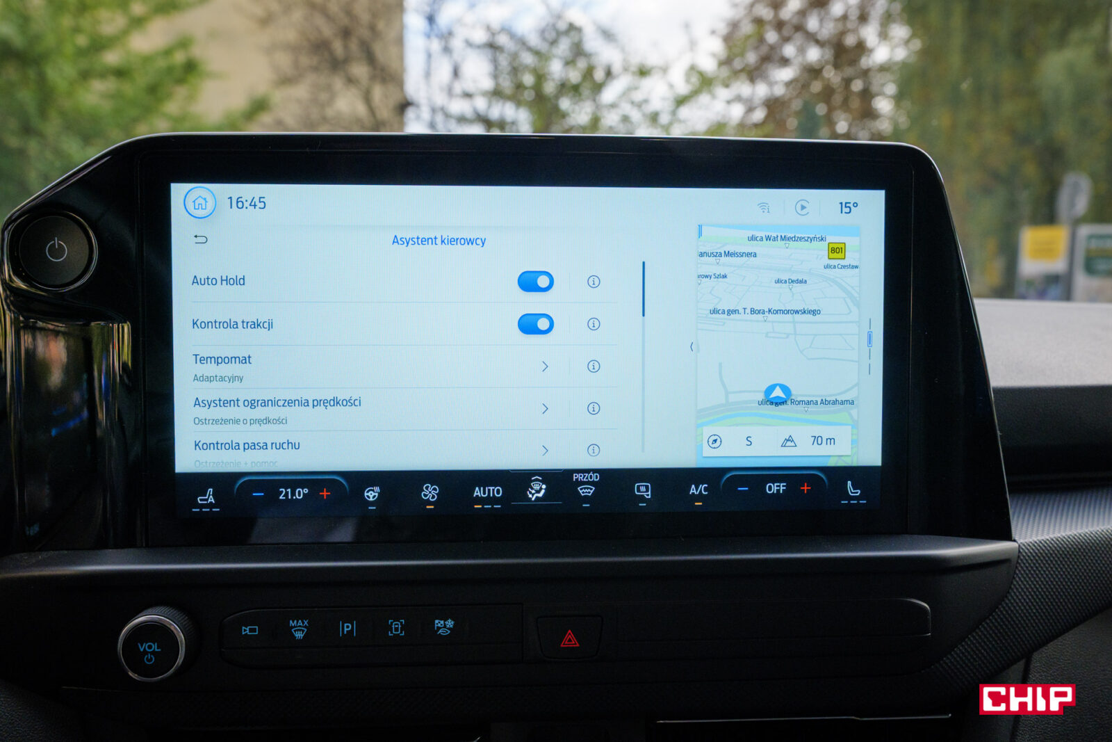 Sterowanie klimatyzacją jest niestety przeniesione na ekran. Jedyne fizyczne pokrętło odpowiada za regulację głośności. Plusem jest jednak to, że sterowanie klimatyzacją jest zawsze widoczne na ekranie w postaci paska wzdłuż dolnej krawędzi, a przyciski zmiany temperatury są duże i czytelne.