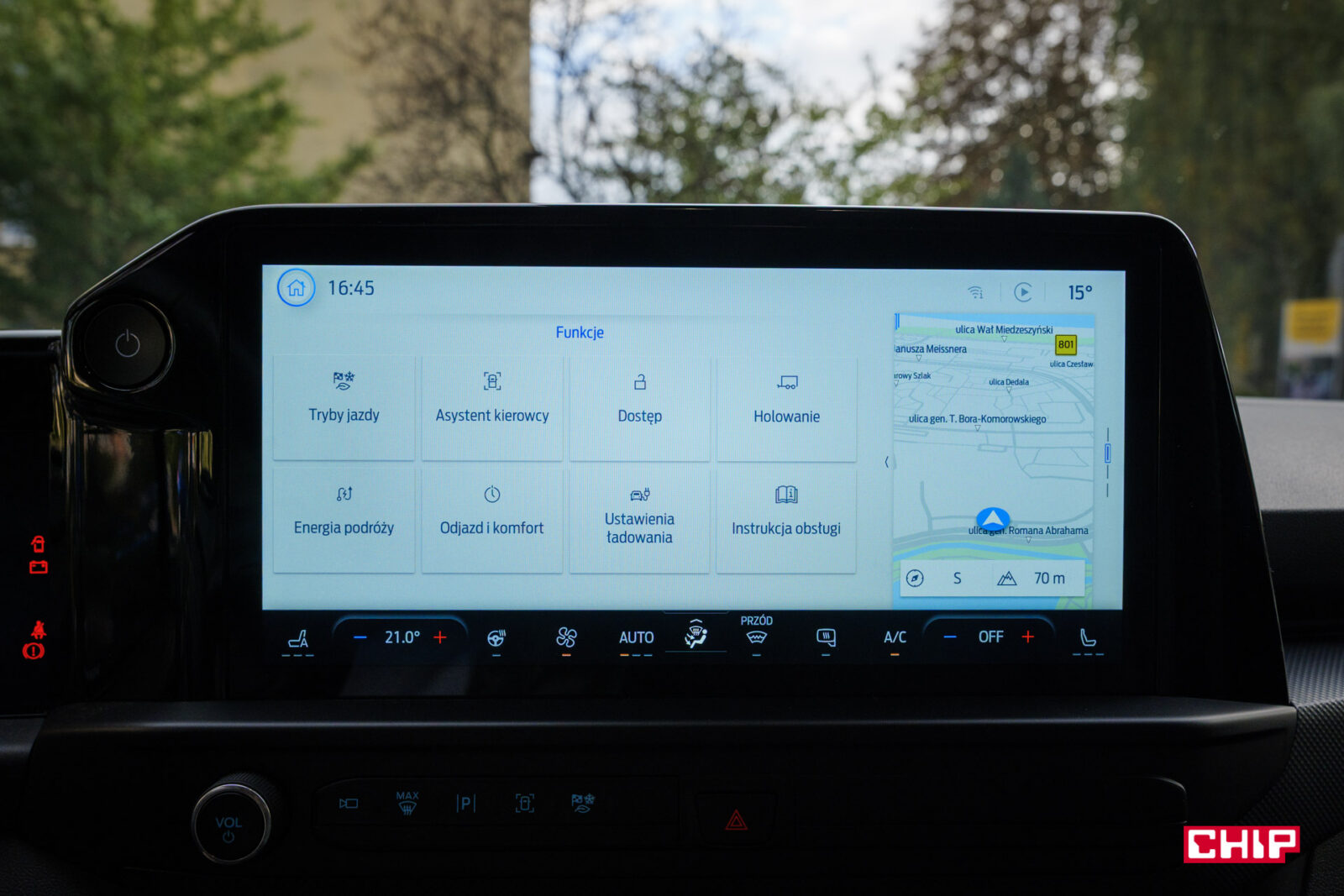Duży, 13-calowy ekran główny jest wyposażeniem standardowym każdej wersji E-Transita Custom. Interfejs Forda to zdecydowanie zaleta aut producenta. Rozbudowany, ale jednocześnie prosty w obsłudze dzięki bardzo intuicyjnemu pogrupowaniu dostępnych opcji.