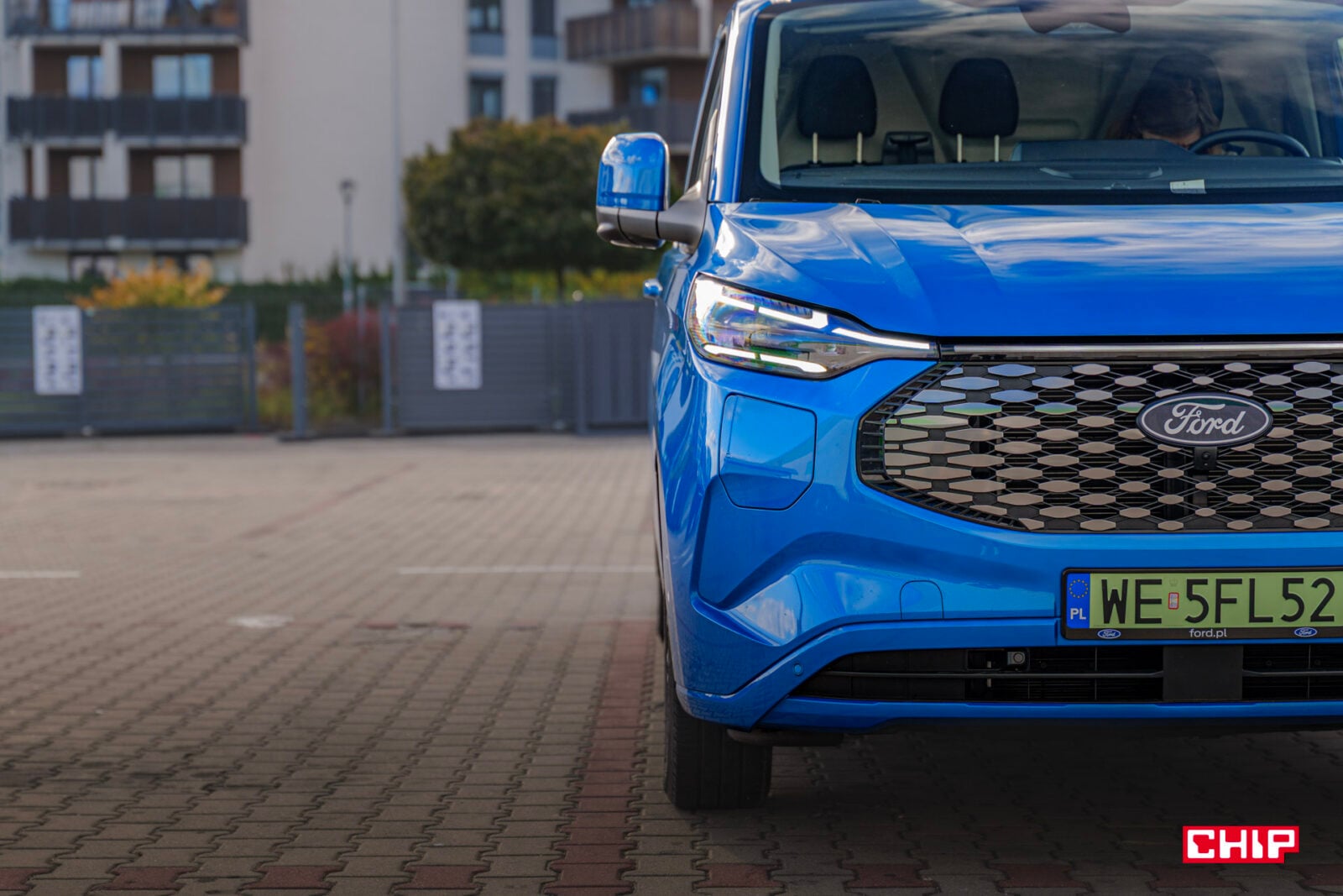 Ford E-Transit Custom wygląda z jednej strony jak klasyczne auto dostawcze, z drugiej ma sporo dodatków, które powodują, że jest to bardzo świeża i nowoczesna konstrukcja. Widoczny na zdjęciach egzemplarz to wariant Limited, czyli mniej więcej środkowa wersja wyposażenia. Z przodu mamy dużą maskownicę, oczywiście zabudowaną, która w wariantach spalinowym jest klasycznym grillem. Nad nim biegnie listwa świetlna, ładnie łącząca przednie światła LED. Również z przodu znajduje się port ładowania i jest to bardzo dobre rozwiązanie, bo łatwiej jest dzięki temu znaleźć miejsce przy ładowarce.