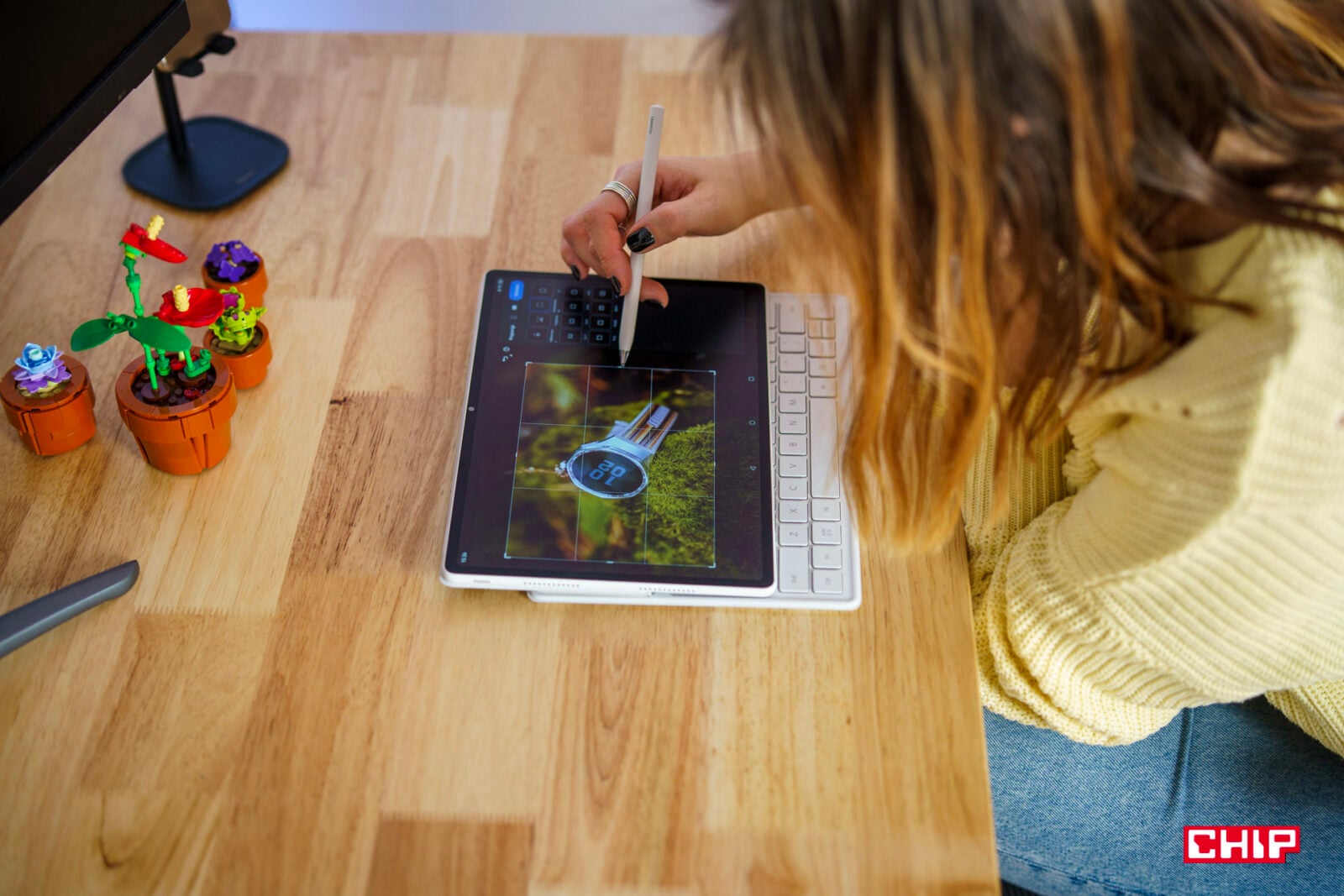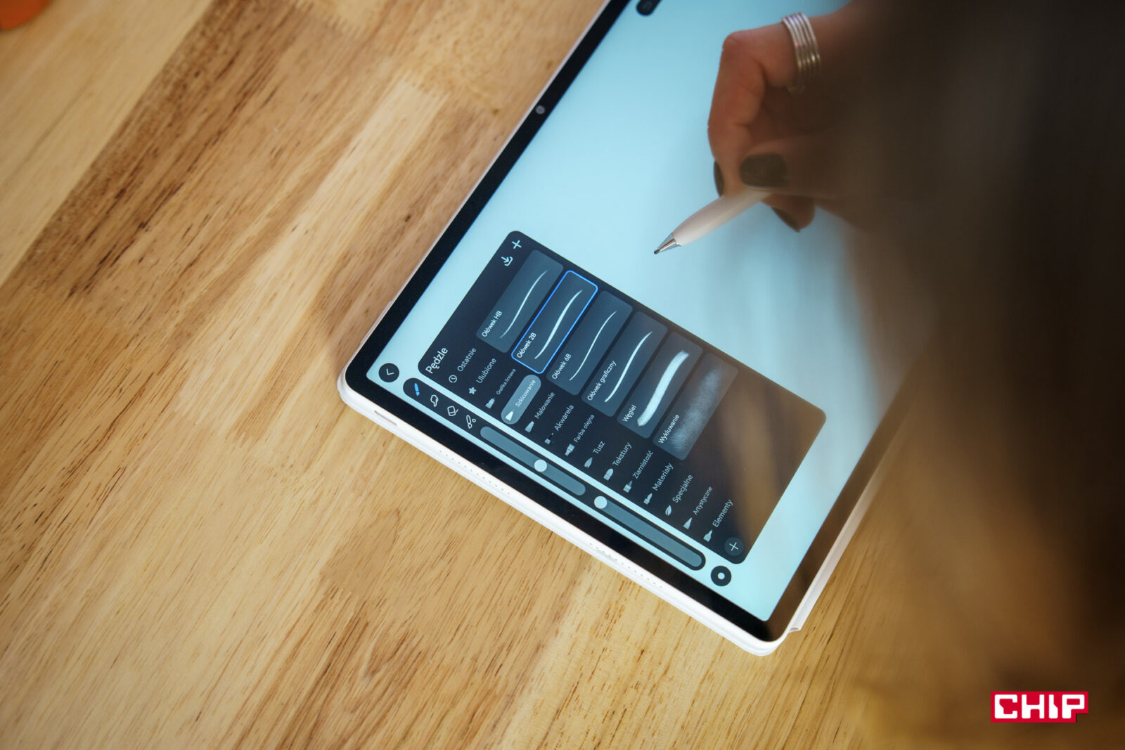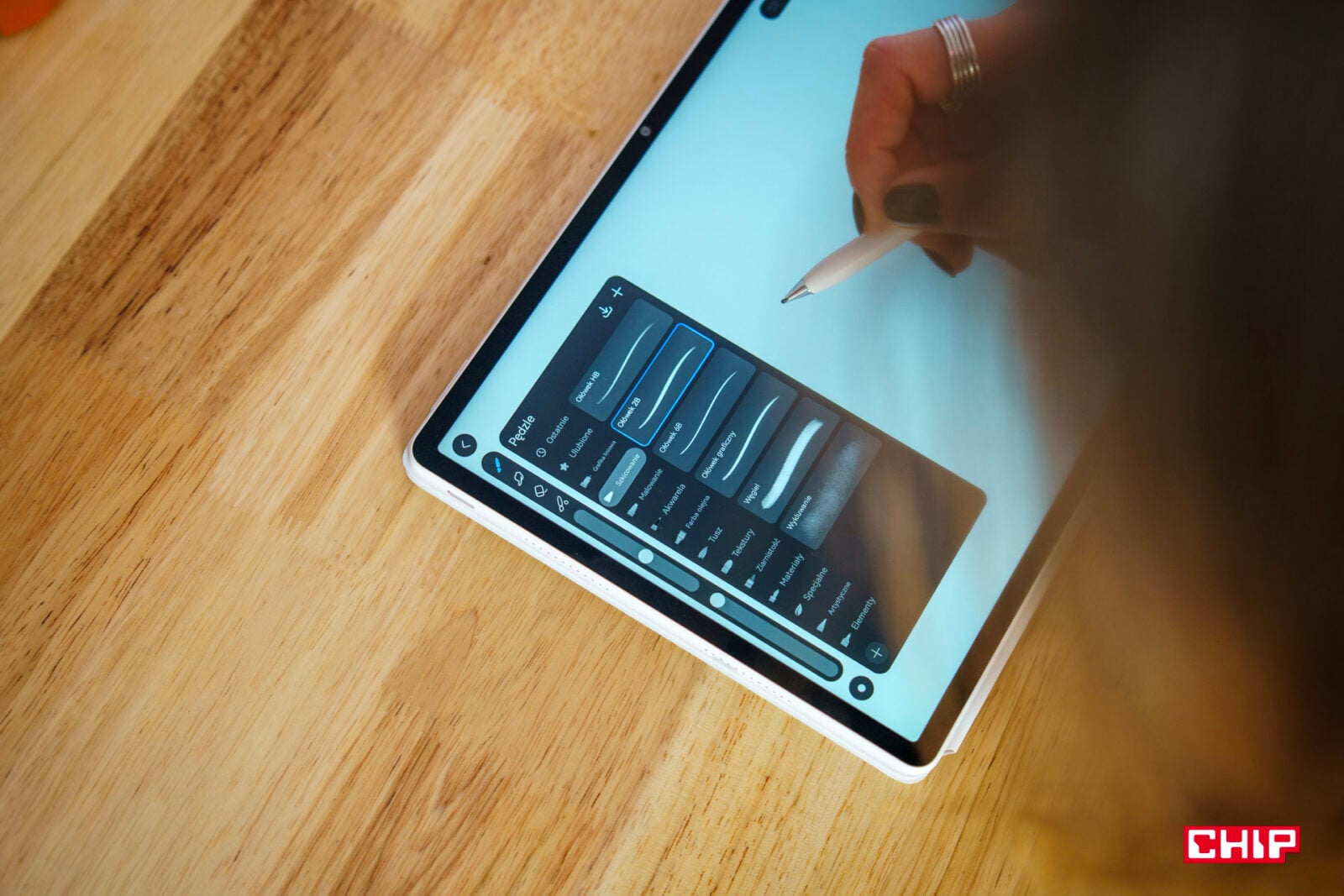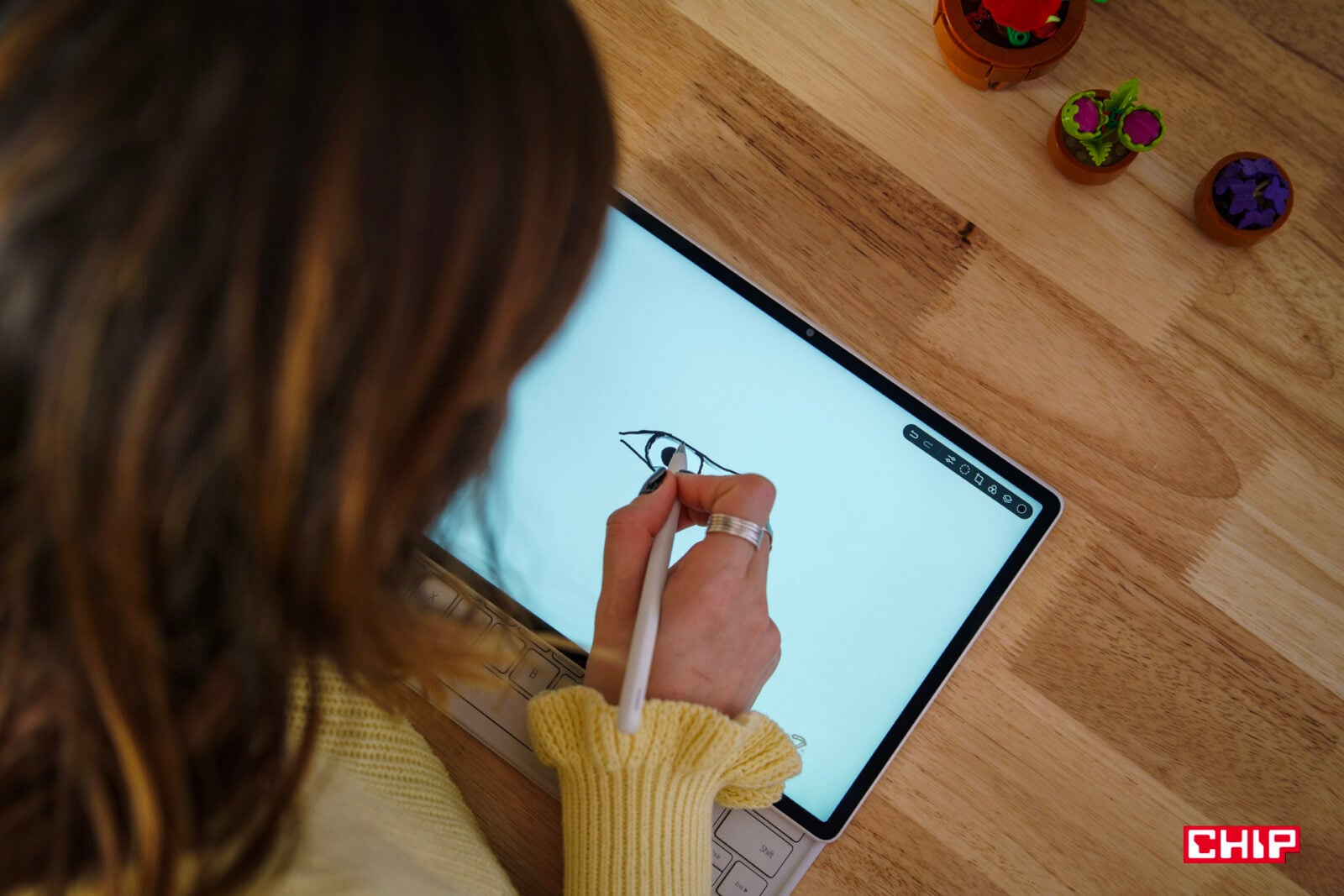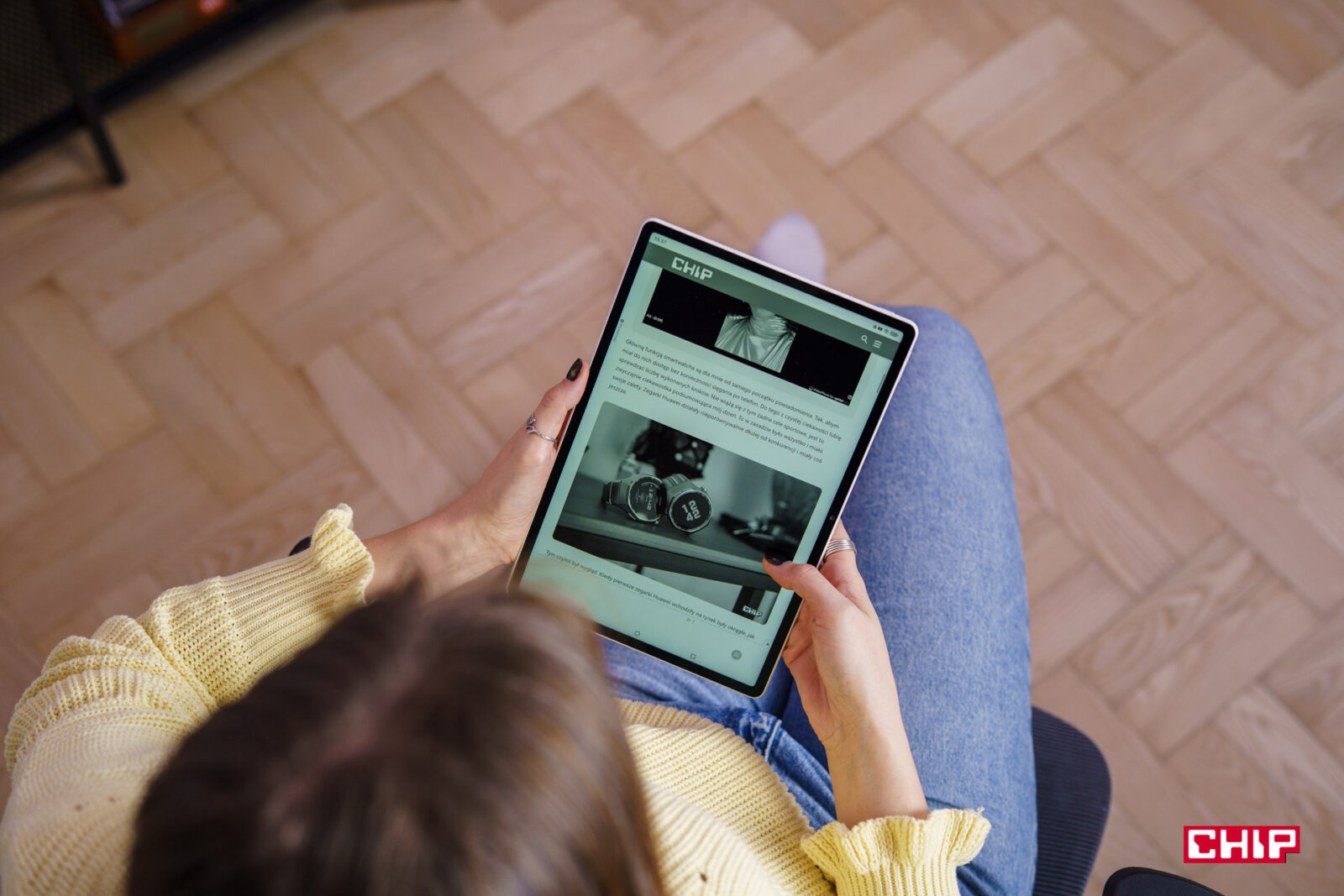 Matowa powierzchnia ma też inne zalety. Jest to przede wszystkim ochrona wzroku, co po części łączy się z zastosowaniem kreatywnym. Powierzchnia w bardzo minimalnym stopniu odbija światło, co jest korzystanie dla naszych oczu, ale też jest przydatne podczas rysowania czy edycji zdjęć. Możemy korzystać z tabletu nawet w bardzo jasnym otoczeniu (w czym pomaga jasność sięgająca 1000 nitów) i patrzeć na niego pod praktycznie dowolnym kontem, bez utraty jakości obrazu.