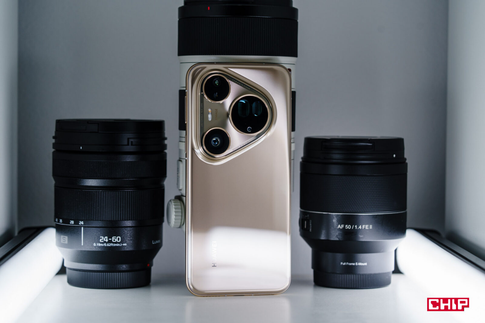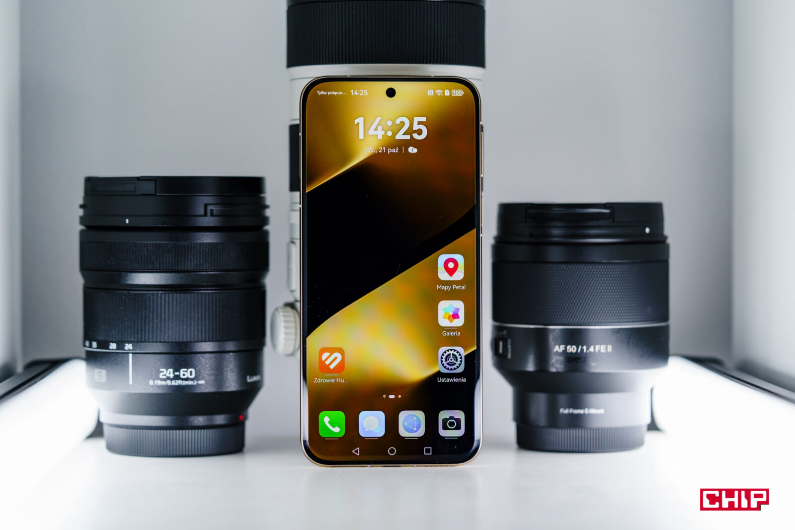 Truskawka na torcie to trzeci aparat z dwoma obiektywami i tu przyznaję, że nie do końca rozumiem jego specyfikację. Ale po kolei, najpierw obiektywy. Są to dwa peryskopowe teleobiektywy – 83 mm f/2,4 oraz aż 212 mm f/3.6. Pod nimi znajduje się jedna matryca, która w zależności od potrzeby jest dosłownie przesuwana spod jednego obiektywu do drugiego. Co faktycznie widać, jak na tyle obudowy coś przeskakuje pod obiektywem. Jest to matryca duża, w rozmiarze 1/1.28″ z optyczną stabilizacją obrazu, ale dla krótszego teleobiektywu Huawei podaje rozdzielczość 50 Mpix, a dla dłuższego 12,5 Mpix. Możemy więc zakładać, że jest tu jakieś połączenie długiej ogniskowej obiektywu i zoomu cyfrowego polegającego na wycięciu fragmentu matrycy do zdjęć. Co by nie mówić, jest to konstrukcja unikatowa, jakiej jeszcze w świecie smartfonów nie widzieliśmy.