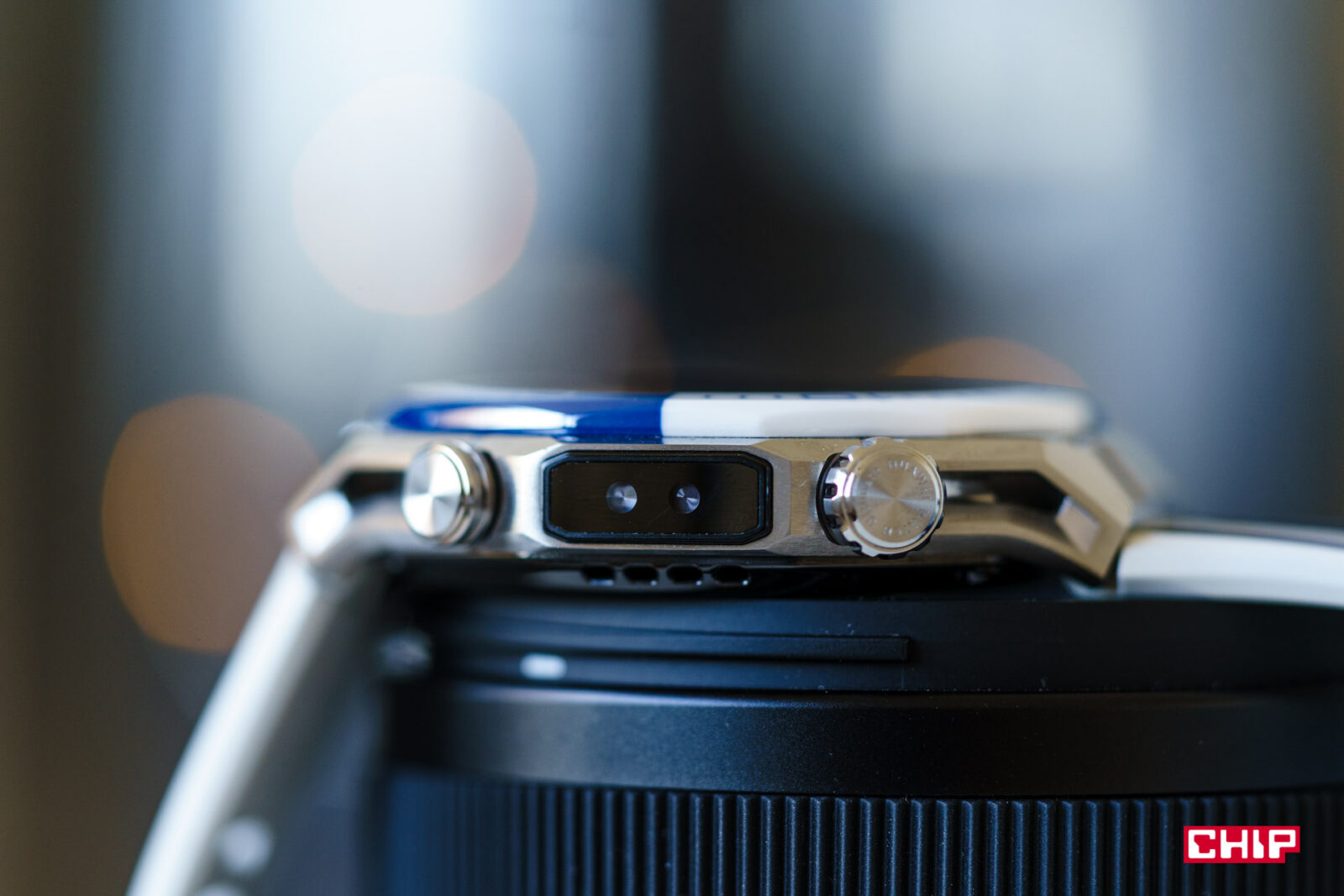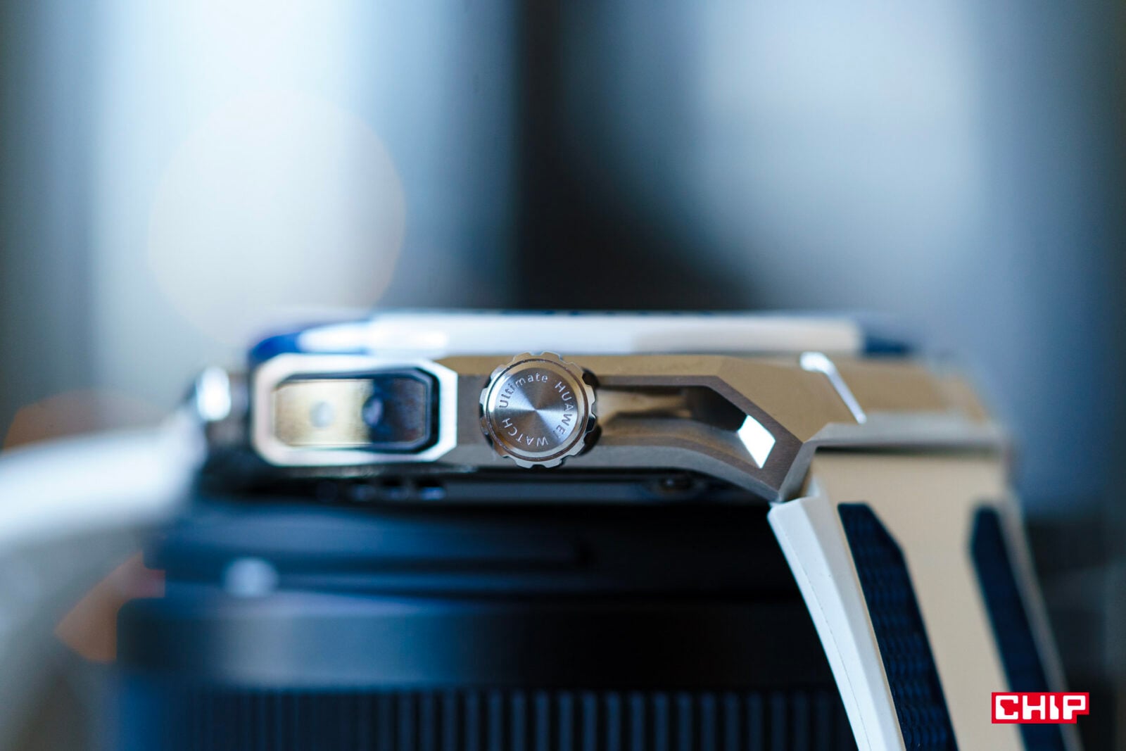 Duże zmiany mamy też na kopercie. Pojawiły się tu nowe elementy. Na prawym boku znajdziemy czujnik X-Tap, o którym więcej powiemy sobie nieco później. Na lewym mamy… taką dziwną płytkę, która ma związek z zaawansowanymi funkcjami nurkowymi zegarka. Watch Ultimate pozwalał na nurkowanie na głębokości 100 metrów. Ultimate 2 pozwala na głębokości 200 metrów. Wystająca płytka po lewej to część mechanicznego systemu uszczelniania, który uruchamia się po zanurzeniu na głębokości 25 metrów. Tak w uproszczeniu – cos tam się w środku przesuwa, zmieniając ciśnienie wnętrz zegarka i to właśnie dzięki temu wytrzymuje tak ekstremalne zanurzenie.