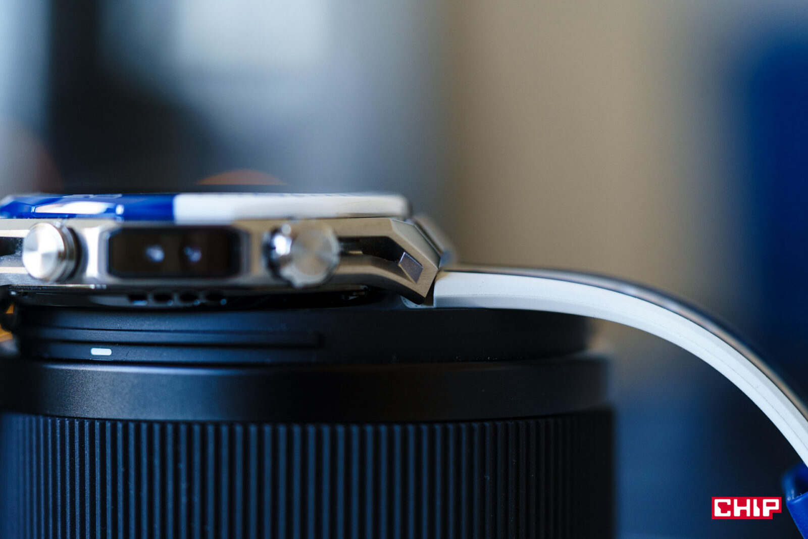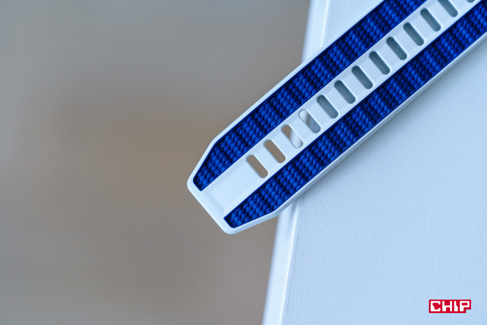 Dwukolorowy jest też pasek, który powoduje, że zegarek bardzo mocno rzuca się w oczy. Możemy śmiało żartować, że jest to wersja grecka. Biała część paska to fluoelastomer, niebieska to bardzo dziwna tkanina. Chyba taką samą mamy w zegarkach Watch GT 6 Pro. Z jednej strony jest to materiał bardzo elastyczny, z drugiej jest to właśnie pleciona tkanina i mam obawy co do tego, jak bez jakiegoś specjalnego czyszczenia będzie wyglądać np. po roku użytkowania.