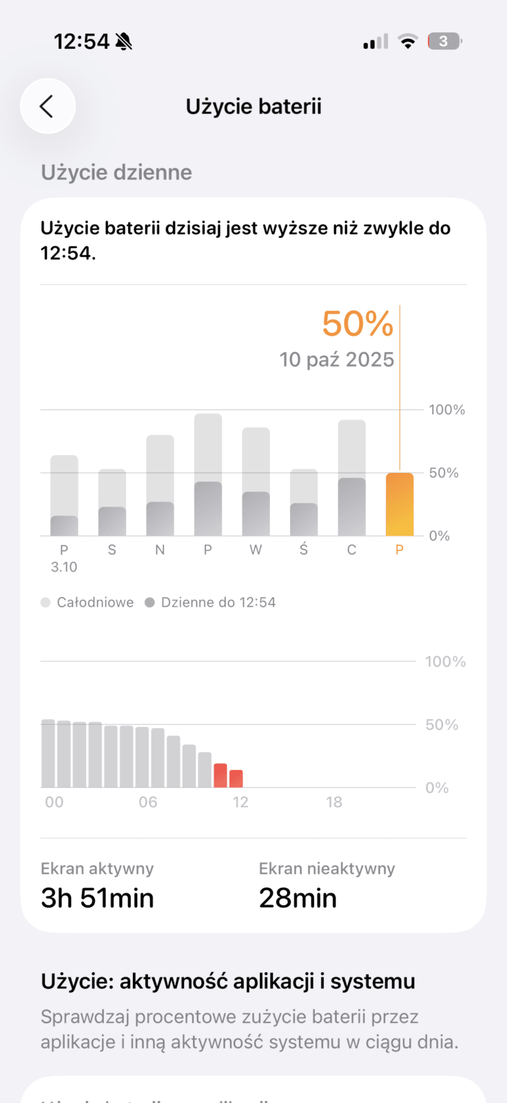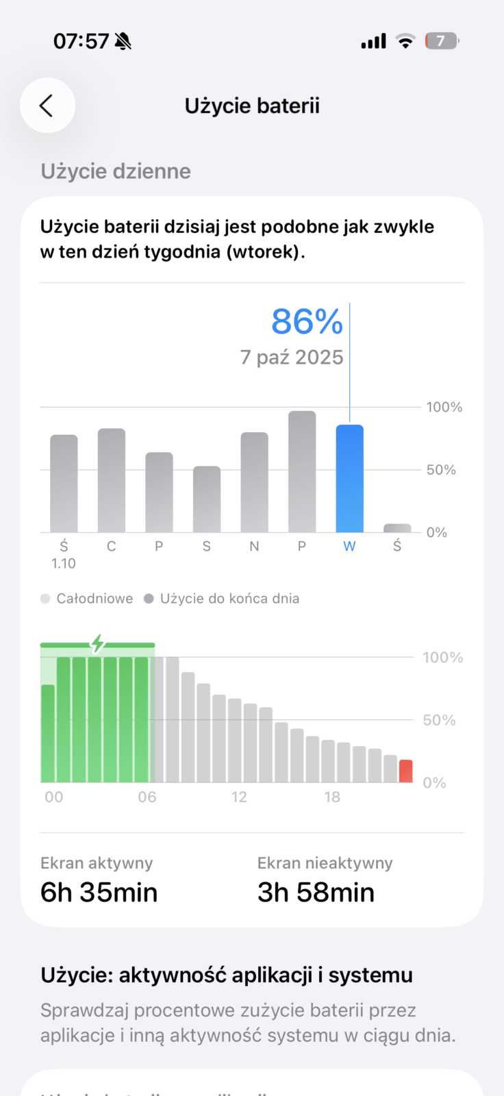 Dzięki regulacjom unijnym wymuszającym na Apple podanie tej informacji wiemy, że pojemność akumulatora litowo-jonowego wynosi 3692 mAh. To niewiele, gdy porównamy to z osiągnięciami w świecie Androida, ale czasy pracy telefonu na jednym ładowaniu są znakomite. Bez problemu osiągałem między 6 a 8 godzinami pracy. Telefon dość intensywnie użytkowałem do mediów społecznościowych i wtedy radził sobie przez cały dzień i wystarczyło podłączyć go przy szafce nocnej. W mniej social mediowych dniach nie musiałem ładować smartfonu przez 1,5 do 2 dni.