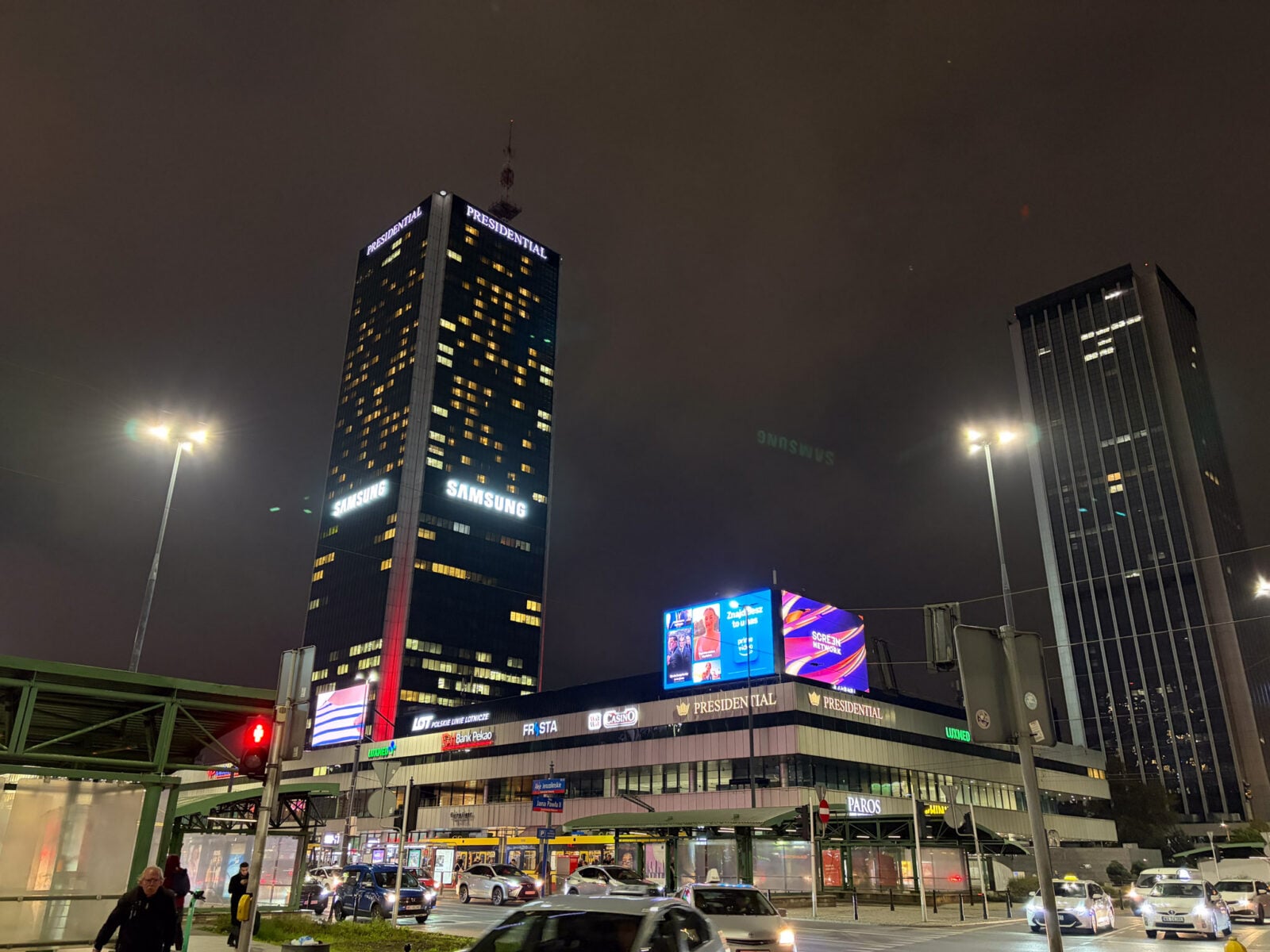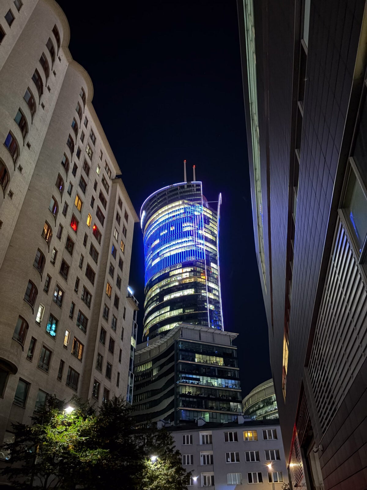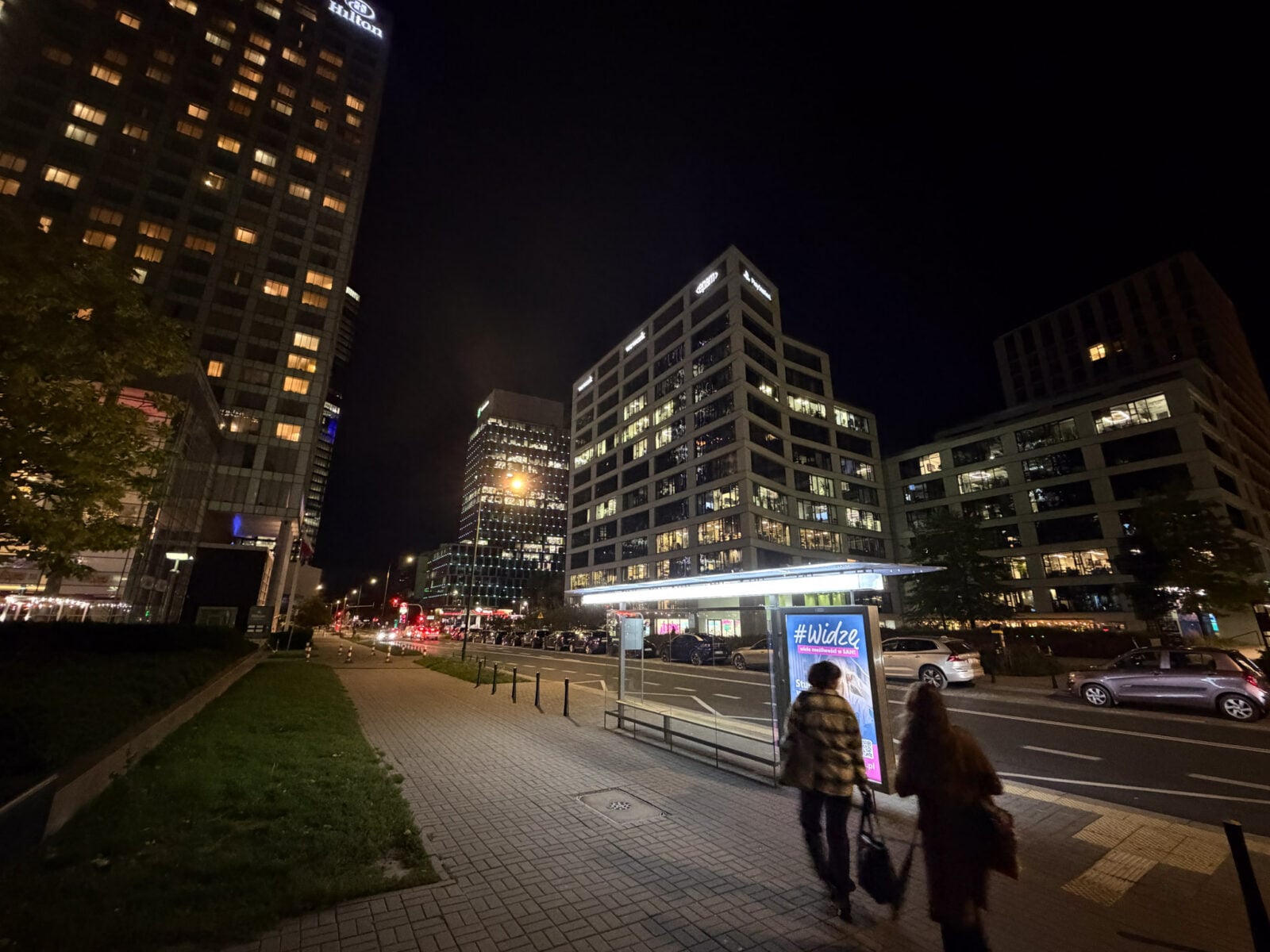 Czy tak dobre rezultaty przenoszą się na zdjęcia nocne? Co do zasady tak, ale rodzi się nowy problem. Na szkłach chroniących aparat nie ma wystarczająco dobrej powłoki antyrefleksyjnej. W kadrach widać przez to mocne punkty świetlne jak logotypy, które odbijają się do góry nogami. Możecie skorzystać z AI do ich usunięcia, ale większość smartfonów nie ma z tym problemów.