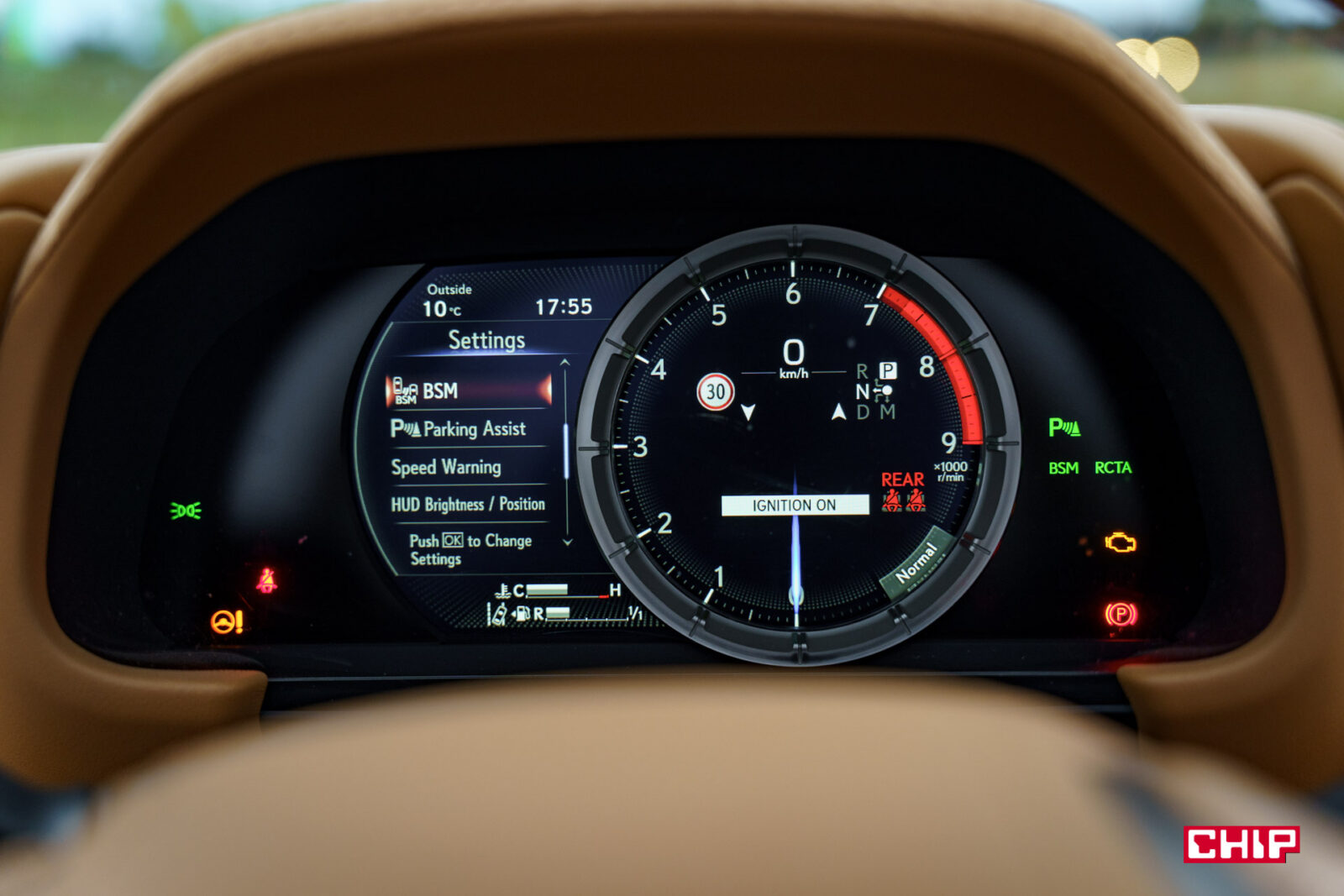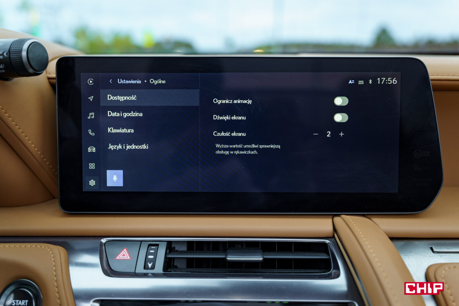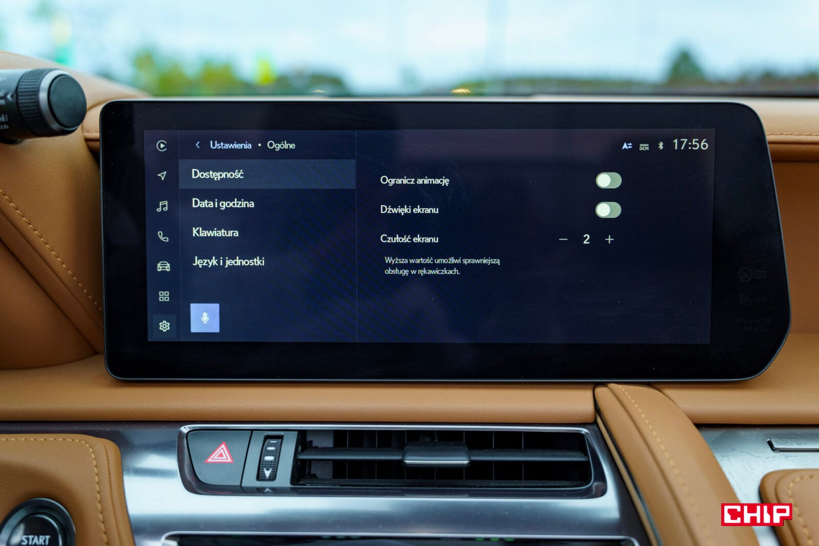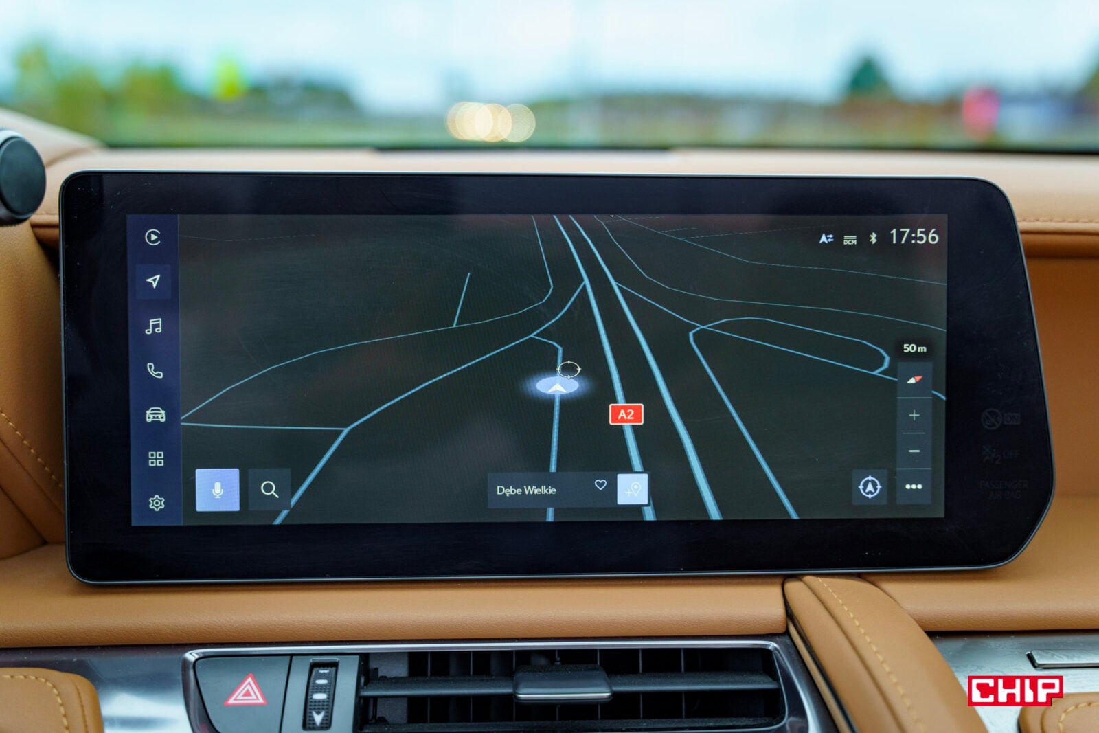 Tego nie widać na zdjęciach, ale jego obramowanie to nie jest animacja. To jest fizyczny, metalowy bezel, który w dodatku PRZESUWA SIĘ! To jest tak piękny smaczek wnętrza LC 500, że wręcz trudno to opisać. Kiedy chcemy zmienić ustawienia, bo tak, jak w każdym Lexusie czy Toyocie ustawienia np. działania asystentów wprowadzamy na ekranie kierowcy, zegar przesuwa się na bok. Po skończeniu przeklikiwania tego, czego szukamy, wraca na swoje miejsce. Wygląda to obłędnie, majestatycznie… czysta poezja.