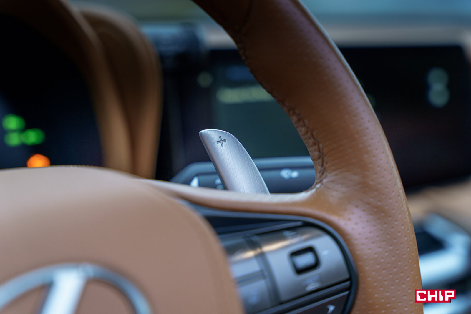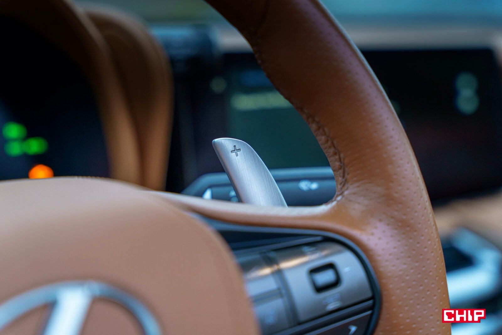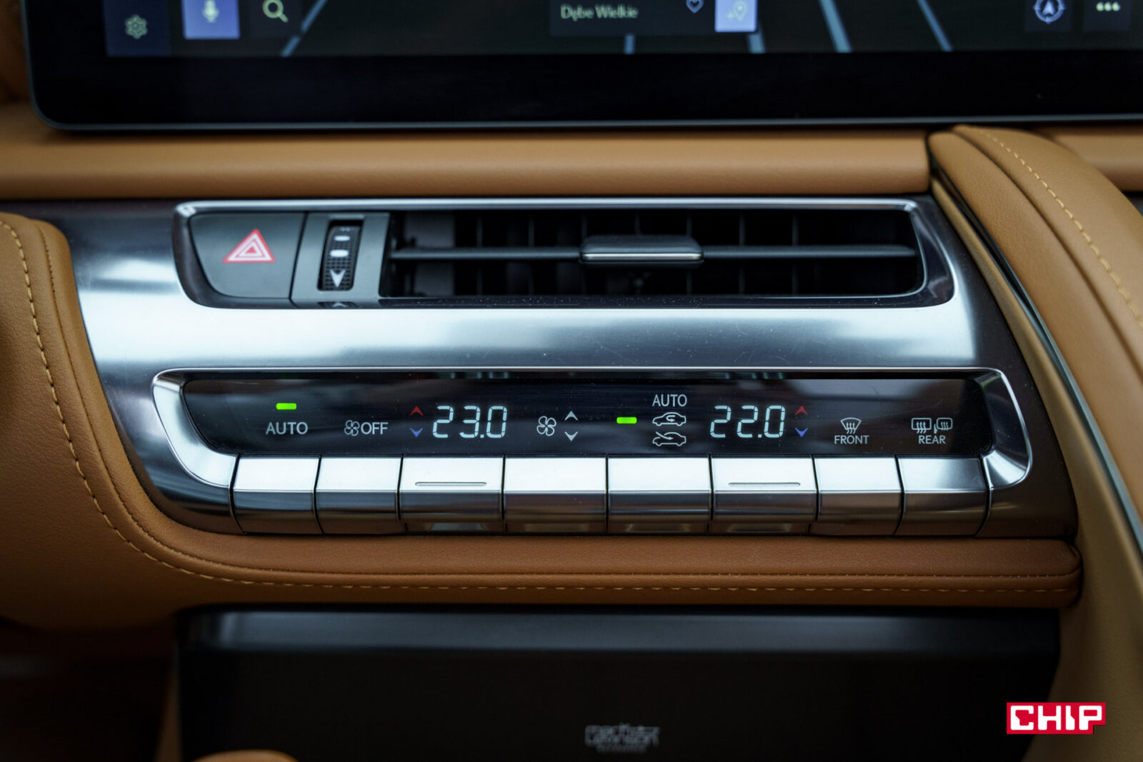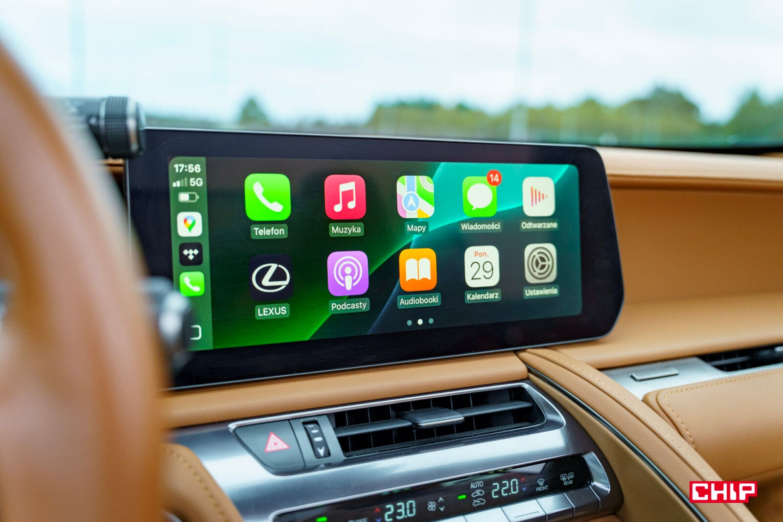 Tego nie widać na zdjęciach, ale jego obramowanie to nie jest animacja. To jest fizyczny, metalowy bezel, który w dodatku PRZESUWA SIĘ! To jest tak piękny smaczek wnętrza LC 500, że wręcz trudno to opisać. Kiedy chcemy zmienić ustawienia, bo tak, jak w każdym Lexusie czy Toyocie ustawienia np. działania asystentów wprowadzamy na ekranie kierowcy, zegar przesuwa się na bok. Po skończeniu przeklikiwania tego, czego szukamy, wraca na swoje miejsce. Wygląda to obłędnie, majestatycznie… czysta poezja.