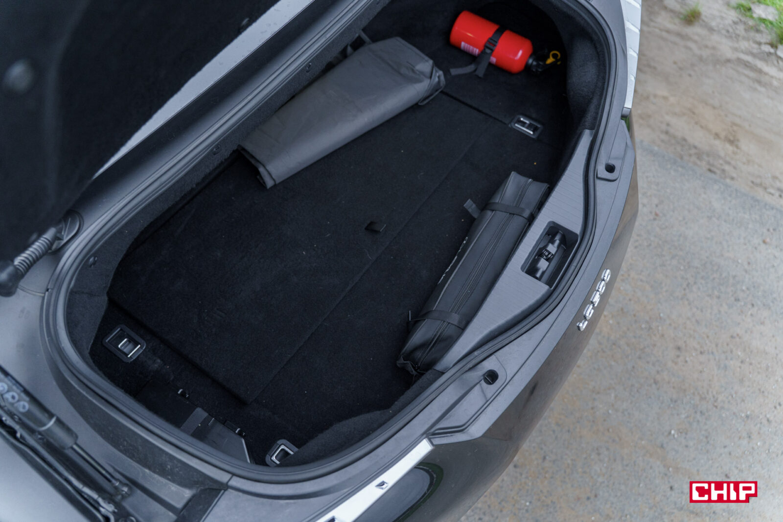 Bardzo ciekawie wygląda kwestia foteli, bo nie są to w żadnym stopniu siermiężne, twarde fotele sportowe. Jasne, mają usportowioną charakterystykę, ale ze świecą szukać równie wygodnych foteli nawet w bardziej luksusowych autach. Są sporych rozmiarów, nieprzesadnie miękkie, ani trochę twarde, czysta poezja. Co ciekawe, pomimo tego, że mamy tu bardzo sportowe auto, wsiadanie i wysiadanie wcale nie jest czynnością odzierającą z godności. Być może dlatego, że najwygodniejsza pozycja do siedzenia to nie jest najniższa z dostępnych. Jasne, jak ktoś chce siedzieć na asfalcie – jest taka opcja, bo fotele można bardzo nisko obniżyć, ale kompletnie nie jest to potrzebne.