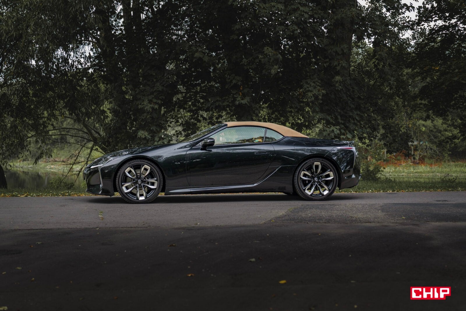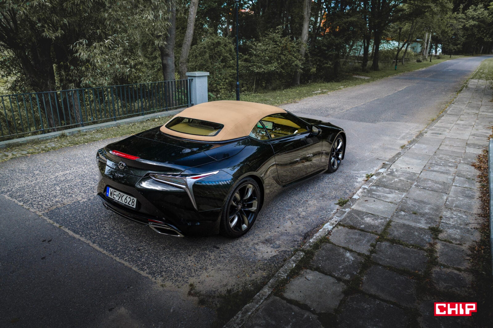 Na boku mamy efektowne przetłoczenia, ładnie współgrające z 21-calowymi felgami i tutaj idealnie widać, jak mocno nachylona jest przednia szyba, ale też jak długim autem jest LC 500. Ma on aż 4770 mm długości. Do tego 1920 mm szerokości bez lusterek, 1350 mm w testowanym wariancie Convertible, 2870 mm rozstawu osi i 133 mm prześwitu.