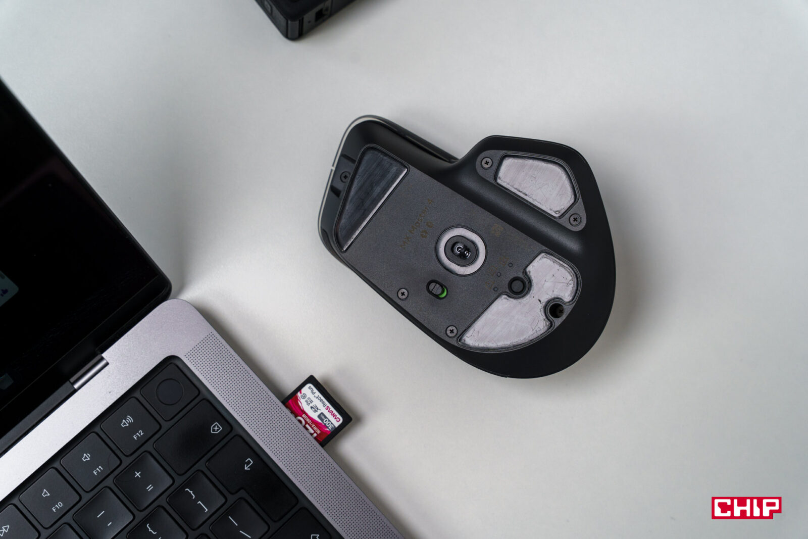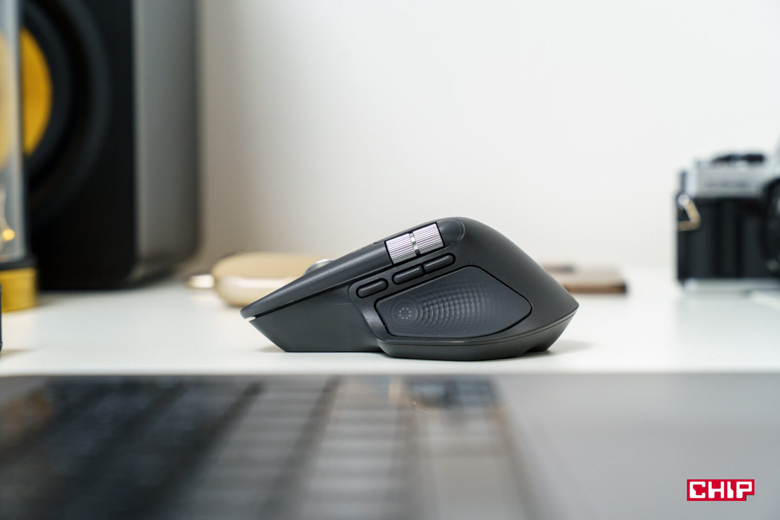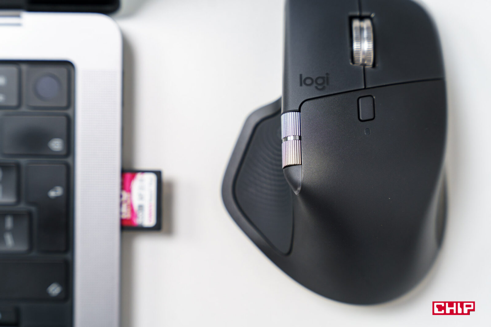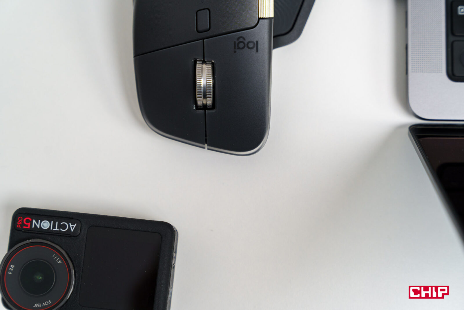 Pokrótce powiedzmy sobie o rzeczach, które się w MX Master 4 nie zmieniły. Przyciski główne są ciche jak w MX Master 3s, więc pracują może nie bezgłośnie, ale zdecydowanie bardzo cicho w stosunku do MX Master 3. Pokrętła działają bez zmian. Czyli główne to nadal genialny MagSpeed działający jak koło zamachowe, co jest nieoceniony przy przewijaniu list i korzystanie z innej myszki nigdy już nie będzie takie same po tym, jak raz zobaczycie jak to działa. Obrót może odbywać się bezgłośnie, albo z charakterystycznym kliknięcie, co zmieniamy za pomocą przycisku na górze obudowy. Bez zmian jest też możliwość parowania z czterema urządzeniami, pomiędzy którymi przełączamy się sprawnie przyciskiem na spodzie obudowy.