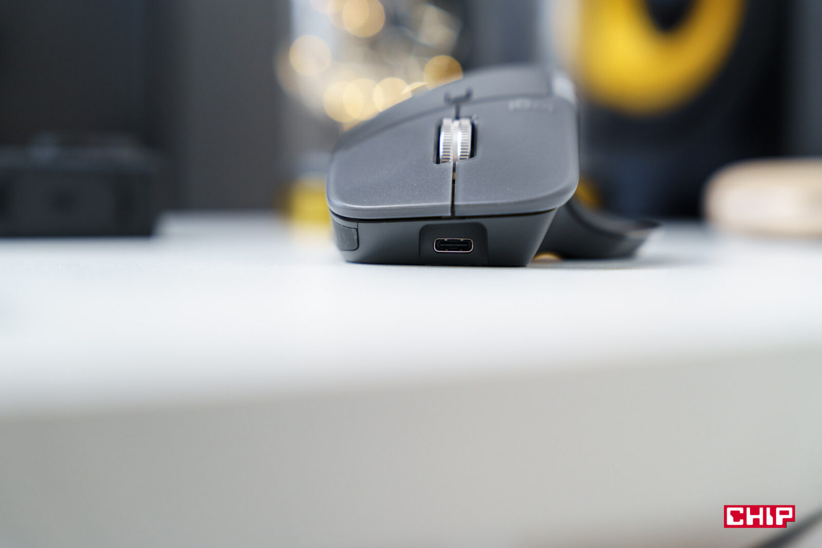 Ładowanie odbywa się za pomocą portu USB-C na przodzie obudowy i można korzystać z myszki w trakcie ładowania.