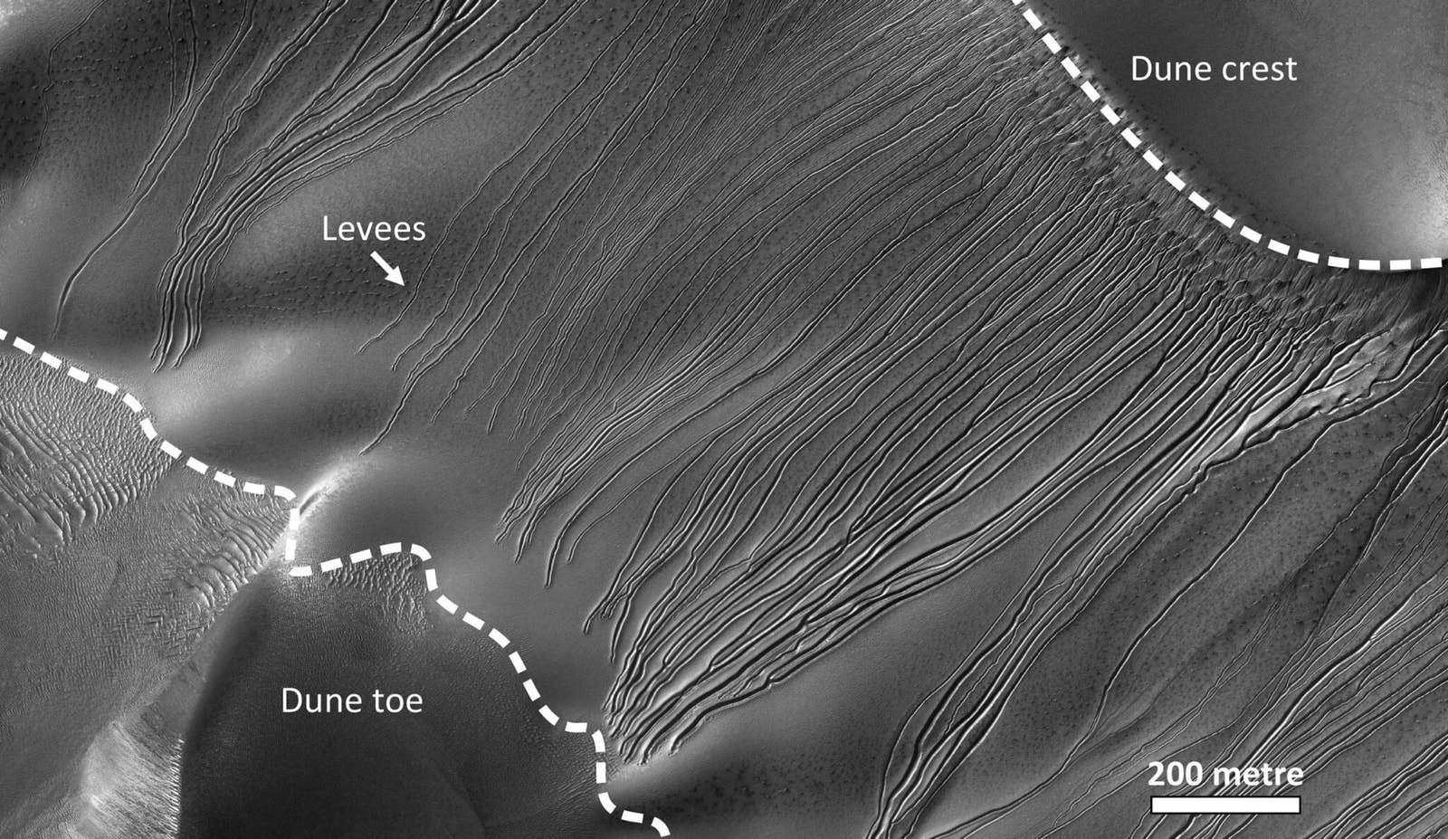 Badacze zaobserwowali, że w zależności od ukształtowania terenu, bloki suchego lodu zachowują się zupełnie inaczej. Na stromych zboczach o nachyleniu przekraczającym 22 stopnie po prostu zsuwają się w dół, tworząc płytkie, rozgałęzione formacje. Prawdziwie spektakularne efekty pojawiają się jednak na łagodniejszych stokach. Tam, gdzie bloki zwalniają, zaczyna działać mechanizm drążenia. Sublimujący gaz spod lodu wyrzuca ziarna piasku na odległość do 20 metrów, ryjąc coraz głębsze kanały. Im wolniej przemieszcza się blok, tym więcej czasu ma na kształtowanie otoczenia. Efekt? Dokładnie takie formacje, jakie znamy ze zdjęć marsjańskich wydm – głębokie, kręte wąwozy z wyraźnymi wałami po bokach. Proces ten jest szczególnie efektywny w przypadku drobnoziarnistego, dobrze przesortowanego piasku – czyli takiego, jaki powszechnie występuje na marsjańskich wydmach.